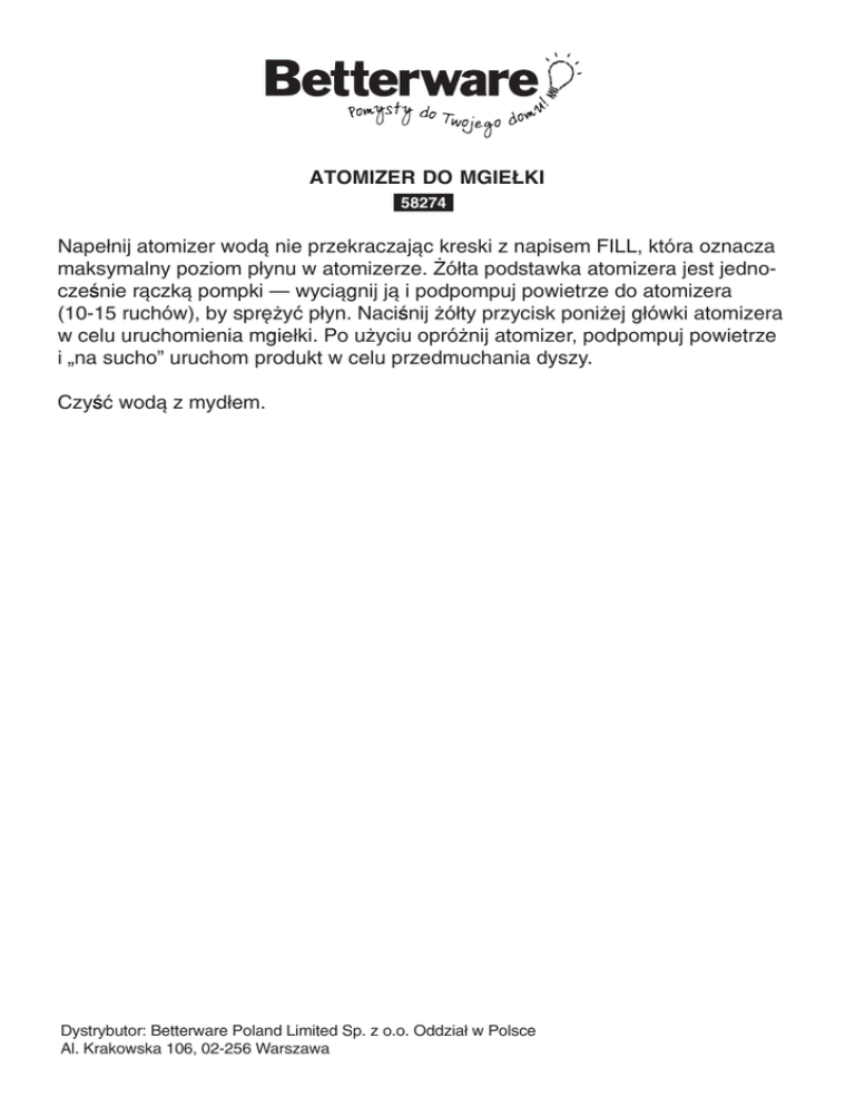 Atomizer do mgiełki 58274 Napełnij atomizer wodą nie przekraczając kreski z napisem FILL, która oznacza maksymalny poziom płynu w atomizerze. Żółta podstawka atomizera jest jednocześnie rączką pompki — wyciągnij ją i podpompuj powietrze do atomizera (10-15 ruchów), by sprężyć płyn. Naciśnij żółty przycisk poniżej główki atomizera w celu uruchomienia mgiełki. Po użyciu opróżnij atomizer, podpompuj powietrze i „na sucho” uruchom produkt w celu przedmuchania dyszy. Czyść wodą z mydłem. Dystrybutor: Betterware Poland Limited Sp. z o.o. Oddział w Polsce Al. Krakowska 106, 02-256 Warszawa