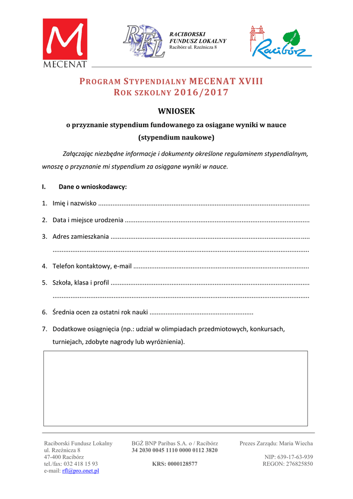 RACIBORSKI FUNDUSZ LOKALNY Racibórz ul. Rzeźnicza 8 P ROGRAM S TYPENDIALNY MECENAT XVIII R OK SZKOLNY 2016/2017 WNIOSEK o przyznanie stypendium fundowanego za osiągane wyniki w nauce (stypendium naukowe) Załączając niezbędne informacje i dokumenty określone regulaminem stypendialnym, wnoszę o przyznanie mi stypendium za osiągane wyniki w nauce. I. Dane o wnioskodawcy: 1. Imię i nazwisko ...................................................................................................................... 2. Data i miejsce urodzenia ....................................................................................................... 3. Adres zamieszkania ............................................................................................................... ............................................................................................................................................... 4. Telefon kontaktowy, e-mail .................................................................................................. 5. Szkoła, klasa i profil ............................................................................................................... ............................................................................................................................................... 6. Średnia ocen za ostatni rok nauki .......................................................... 7. Dodatkowe osiągnięcia (np.: udział w olimpiadach przedmiotowych, konkursach, turniejach, zdobyte nagrody lub wyróżnienia). Raciborski Fundusz Lokalny ul. Rzeźnicza 8 47-400 Racibórz tel./fax: 032 418 15 93 e-mail: [email protected] BGŻ BNP Paribas S.A. o / Racibórz 34 2030 0045 1110 0000 0112 3820 KRS: 0000128577 Prezes Zarządu: Maria Wiecha NIP: 639-17-63-939 REGON: 276825850 RACIBORSKI FUNDUSZ LOKALNY Racibórz ul. Rzeźnicza 8 8. Opisz swoje główne zainteresowania oraz jak zamierzasz je rozwijać w przyszłości 9. Ewentualnie przyznane stypendium zamierzam przeznaczyć na II. Oświadczenia wnioskodawcy: 1. Korzysta z pomocy stypendialnej o podobnym charakterze lub innej – tak / nie* 2. Średni, miesięczny dochód netto w poprzednim roku, przypadający na jednego członka rodziny w gospodarstwie domowym oraz liczba członków rodziny, w tym dzieci. średni, miesięczny dochód netto w poprzednim roku przypadający na jednego członka rodziny w gospodarstwie domowym liczba członków rodziny w gospodarstwie domowym, w tym dzieci (podpis rodzica – opiekuna) ………………………………………………………… Raciborski Fundusz Lokalny ul. Rzeźnicza 8 47-400 Racibórz tel./fax: 032 418 15 93 e-mail: [email protected] BGŻ BNP Paribas S.A. o / Racibórz 34 2030 0045 1110 0000 0112 3820 KRS: 0000128577 Prezes Zarządu: Maria Wiecha NIP: 639-17-63-939 REGON: 276825850 RACIBORSKI FUNDUSZ LOKALNY Racibórz ul. Rzeźnicza 8 3. Przyznane stypendium proponuje wypłacać w formie przelewu na konto w Banku (podać właściciela konta i numer konta)* ............................................................................................................................................ 4. Wykaz załączników : 1 ............................................................................................................................................ 2 ............................................................................................................................................ 3 ............................................................................................................................................ 4 ............................................................................................................................................ Racibórz, dnia ................................. ........................................................ podpis wnioskodawcy * - niepotrzebne skreślić Lista obowiązkowych załączników, bez których wniosek zostanie uznany za nieważny: 1. ksero świadectwa za ostatni rok szkolny 2. Zaświadczenie o dochodach rodziców / opiekunów oraz każdej z osób przebywających we wspólnym gospodarstwie domowym – ksero PIT za 2015 3. Kopie najważniejszych dyplomów, zdjęć prac, informacje prasowe itp. dokumentujące dokonania kandydata do Stypendium 4. list od kandydata (powód ubiegania się o stypendium , sytuację rodzinną lub finansową rodziny) Raciborski Fundusz Lokalny ul. Rzeźnicza 8 47-400 Racibórz tel./fax: 032 418 15 93 e-mail: [email protected] BGŻ BNP Paribas S.A. o / Racibórz 34 2030 0045 1110 0000 0112 3820 KRS: 0000128577 Prezes Zarządu: Maria Wiecha NIP: 639-17-63-939 REGON: 276825850