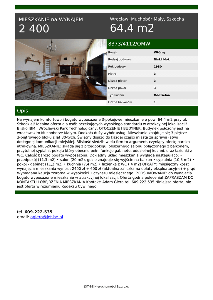 MIESZKANIE na WYNAJEM 2 400 Wrocław, Muchobór Mały, Szkocka 64.4 m2 8373/4112/OMW Rynek Wtórny Rodzaj budynku Niski blok Rok budowy 1980 Piętro 3 Liczba pięter 3 Liczba pokoi 3 Typ kuchni Oddzielna Liczba balkonów 1 Opis Na wynajem komfortowo i bogato wyposażone 3-pokojowe mieszkanie o pow. 64,4 m2 przy ul. Szkockiej! Idealna oferta dla osób oczekujących wysokiego standardu w atrakcyjnej lokalizacji! Blisko IBM i Wrocławski Park Technologiczny. OTOCZENIE I BUDYNEK: Budynek położony jest na wrocławskim Muchoborze Małym. Dookoła duży wybór usług. Mieszkanie znajduje się 3 piętrze 3-piętrowego bloku z lat 80-tych. Świetny dojazd do każdej części miasta za sprawą łatwo dostępnej komunikacji miejskiej. Bliskość siedzib wielu firm to argument, czyniący ofertę bardzo atrakcyjną. MIESZKANIE: składa się z przedpokoju, obszernego salonu połączonego z balkonem, przytulnej sypialni, pokoju który obecnie pełni funkcje gabinetu, oddzielnej kuchni, oraz łazienki z WC. Całość bardzo bogato wyposażona. Dokładny układ mieszkania wygląda następująco: • przedpokój (11,3 m2) • salon (20 m2), gdzie znajduje się wyjście na balkon • sypialnia (10,5 m2) • pokój - gabinet (11,2 m2) • kuchnia (7,4 m2) • łazienka z WC ( 4 m2) OPŁATY: miesięczny koszt wynajęcia mieszkania wynosi: 2400 zł + 600 zł (aktualna zaliczka na opłaty eksploatacyjne) + prąd Wymagana kaucja zwrotna w wysokości 1 czynszu miesięcznego. PODSUMOWANIE: do wynajęcia bogato wyposażone mieszkanie w atrakcyjnej lokalizacji. Oferta godna polecenia! ZAPRASZAM DO KONTAKTU I OBEJRZENIA MIESZKANIA Kontakt: Adam Giera tel. 609 222 535 Niniejsza oferta, nie jest ofertą w rozumieniu Kodeksu Cywilnego. tel. 609-222-535 email: [email protected] JOT-BE Nieruchomości Sp.z o.o. Powered by TCPDF (www.tcpdf.org)