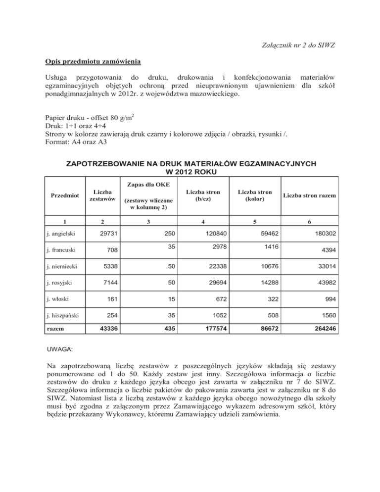 Załącznik nr 2 do SIWZ Opis przedmiotu zamówienia Usługa przygotowania do druku, drukowania i konfekcjonowania materiałów egzaminacyjnych objętych ochroną przed nieuprawnionym ujawnieniem dla szkół ponadgimnazjalnych w 2012r. z województwa mazowieckiego. Papier druku - offset 80 g/m2 Druk: 1+1 oraz 4+4 Strony w kolorze zawierają druk czarny i kolorowe zdjęcia / obrazki, rysunki /. Format: A4 oraz A3 ZAPOTRZEBOWANIE NA DRUK MATERIAŁÓW EGZAMINACYJNYCH W 2012 ROKU Zapas dla OKE Przedmiot Liczba zestawów 1 2 (zestawy wliczone w kolumnę 2) 3 j. angielski 29731 j. francuski 708 j. niemiecki Liczba stron (b/cz) Liczba stron (kolor) Liczba stron razem 4 5 6 250 120840 59462 35 2978 1416 5338 50 22338 10676 33014 j. rosyjski 7144 50 29694 14288 43982 j. włoski 161 15 672 322 994 j. hiszpański 254 35 1052 508 1560 43336 435 177574 86672 264246 razem 180302 4394 UWAGA: Na zapotrzebowaną liczbę zestawów z poszczególnych języków składają się zestawy ponumerowane od 1 do 50. KaŜdy zestaw jest inny. Szczegółowa informacja o liczbie zestawów do druku z kaŜdego języka obcego jest zawarta w załączniku nr 7 do SIWZ. Szczegółowa informacja o liczbie pakietów do pakowania zawarta jest w załączniku nr 8 do SIWZ. Natomiast lista z liczbą zestawów z kaŜdego języka obcego nowoŜytnego dla szkoły musi być zgodna z załączonym przez Zamawiającego wykazem adresowym szkół, który będzie przekazany Wykonawcy, któremu Zamawiający udzieli zamówienia. Jeden zestaw zawiera: • 1 /jedną/ kartkę formatu A4- obustronnie zadrukowaną o wersja dla zdającego - dwie strony- druk kolorowy /zdjęcia, rysunki etc./ opis, polecenie • 1 (jedną) kartkę formatu A3 – obustronnie zadrukowaną, złoŜoną do formatu A4 o wersja dla egzaminującego – format A3 – złoŜone na pół (4 strony) - druk czarny, obustronny Szczegółowa informacja o liczbie zestawów do druku z kaŜdego języka obcego dla poszczególnych szkół jest zawarta w załączniku nr 7 do SIWZ. Jeden pakiet zawiera: • odpowiednią liczbę zestawów w wersji dla zdającego (zgodnie z załącznikiem nr 7 do SIWZ) • odpowiednią liczbę zestawów w wersji dla egzaminującego (zgodnie z załącznikiem nr 7 do SIWZ) • jedną kartkę dla egzaminującego (rozmowa wstępna) z danego języka formatu A4 druk czarny, obustronny (zgodnie z załącznikiem nr 7 do SIWZ) Szczegółowa informacja o liczbie pakietów do pakowania zawarta jest w załączniku nr 8 do SIWZ. Konfekcjonowanie zestawów materiałów egzaminacyjnych dla szkół ponadgimnazjalnych w 2012 roku. 1. Zestawy z danego języka obcego dla zdającego do danej szkoły naleŜy zapakować w jedną papierową kopertę (nie zaklejoną) zawierającą etykiety: o „ZESTAWY DLA ZDAJĄCEGO” o „ZESTAWY OD …. DO …” 2. Zestawy z danego języka obcego dla egzaminującego do danej szkoły naleŜy zapakować w jedną papierową kopertę (nie zaklejoną) zawierającą etykiety: o „ZESTAWY DLA EGZAMINAUJĄCEGO” o „ZESTAWY OD …. DO …” 3. Numery zestawów dla szkół z kaŜdego języka obcego nowoŜytnego muszą być takie same dla zdającego i egzaminującego. 4. Zestawy dla szkół z kaŜdego języka obcego nowoŜytnego, naleŜy pakować w liczbie określonej przez Zamawiającego poczynając od zestawu nr 1. 5. Liczba zestawów w pakiecie z kaŜdego języka obcego nowoŜytnego dla szkoły musi być zgodna z załączonym przez Zamawiającego wykazem, który zostanie przekazany Wykonawcy, z którym zostanie podpisana umowa. 6. Wszystkie zestawy z danego języka tworzące pakiet ( zestawy dla zdającego, egzaminującego oraz jedna kartka dla egzaminującego „rozmowa wstępna”) naleŜy zapakować w jedną kopertę tzw. bezpieczną zawierająca etykietę z nazwą języka. 7. JeŜeli w szkole występuje więcej niŜ jeden język bezpieczne koperty z pakietami kilku języków, naleŜy zapakować w jedną paczkę (koperta, pudełko) 8. Paczkę zawierającą wszystkie pakiety z poszczególnych języków obcych nowoŜytnych dla szkoły naleŜy opatrzyć etykietą adresową zawierającą: • liczbę porządkowa, • kod szkoły, • nazwisko i imię przewodniczącego szkolnego zespołu egzaminacyjnego, • adres szkoły, • specyfikację zestawów z poszczególnych języków. Uwaga: 1. Zamawiający wymaga dostarczenia do jego siedziby, przed rozpoczęciem realizacji przedmiotu zamówienia, testowej partii kaŜdego rodzaju zestawu, celem wglądu i oceny jakości wydruku, zwłaszcza druku w kolorze oraz znaków charakterystycznych dla poszczególnych języków obcych. 2. Zamawiający Ŝąda posiadania przez Wykonawców procedur pracy gwarantujących wykonanie zamówienia, na kaŜdym etapie realizacji, z zachowaniem szczególnych zasad bezpieczeństwa i ochrony przed nieuprawnionym ujawnieniem 3. Zamawiający Ŝąda zachowania na kaŜdym etapie realizacji zamówienia, szczególnych zasad bezpieczeństwa i ochrony przed nieuprawnionym ujawnieniem. Zamawiający zastrzega sobie prawo do kontroli realizacji zamówienia przez upowaŜnione osoby. Kontrola moŜe być przeprowadzona bez wcześniejszego powiadomienia Wykonawcy.