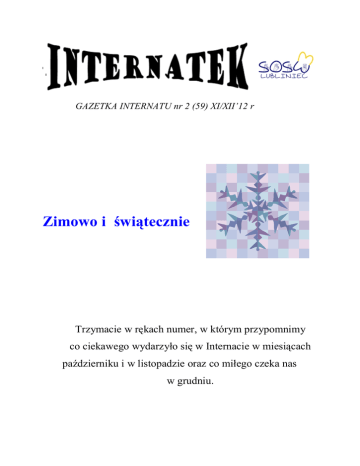 GAZETKA INTERNATU nr 2 (59) XI/XII’12 r Zimowo i świątecznie Trzymacie w rękach numer, w którym przypomnimy co ciekawego wydarzyło się w Internacie w miesiącach październiku i w listopadzie oraz co miłego czeka nas w grudniu. Co się wydarzyło w październiku i w listopadzie w internacie Dnia 26-28.10. grupa taneczna „LADIES„ brała udział w XI Ogólnopolskim Przeglądzie Artystycznym w Poznaniu. Dziewczęta godnie reprezentowały nasz Ośrodek zdobywając uznanie publiczności i pochlebne recenzje. Nowością w tym roku były do wyboru warsztaty teatralne lub muzyczne. Dzięki uczestnictwu w warsztatach dziewczynki mogły podszlifować swoje umiejętności oraz wymienić się doświadczeniami z pozostałymi uczestnikami. Po rozdaniu pamiątkowych dyplomów i pucharów, dziewczęta mogły skorzystać z toru saneczkowego na Malcie. Na pożegnanie odbyła się wspólna dyskoteka dla wszystkich uczestników. ( D. Grobelna) Dnia 20.11. odbył się w jesiennej atmosferze wśród kasztanów i żołędzi konkurs wiedzy o jesieni dla grup młodszych. Udział wzięły cztery grupy. Uczestnicy zawzięcie konkurowali w różnego rodzaju konkurencjach. Mogli się wykazać zarówno wiedzą teoretyczną nt jesieni jak również smakową i manualną. Konkurencja manualna wzbudziła wiele emocji pozytywnych, gdyż polegała na stworzeniu ziemniaczanego ludzika. Każda grupa chciała mieć najfajniejszą postać . Walka była bardzo wyrównana. Najlepsi okazali się Robert i Patryk z grupy IV, na drugim miejscu uplasowały się Agata i Marta z grupy I dz., medalowe trzecie miejsce wywalczyli Radek i Dawid z grupy III, a czwarte miejsce po zaciętej walce zajęli Zbyszek i Jakub z V grupy chłopców. 21.11. ŚWIATOWY DZIEŃ ŻYCZLIWOŚCI – to święto, które już na stałe wpisało się w kalendarz imprez w Internacie. Tego dnia życzliwą atmosferę można było wyczuć już od rana: wesołe „buźki” oraz plakaty z życzeniami, fajnymi cytatami. W porze obiadu wychowankowie gr. VI chł. witali wszystkich wchodzących na stołówkę „uśmiechniętymi” plakietkami. Wieczorem w czasie apelu zaprezentowali się laureaci plebiscytu na „najżyczliwszego wychowanka”. Większością głosów mieszkańców i pracowników Internatu, tytuł ten otrzymali : Ania Chmielarz, Kamil Chmielarz i Dawid Szwedziński. Tradycyjnie już na listkach „Drzewka Życzliwości” można było przekazywać sobie nawzajem pozdrowienia i życzenia. „Bądź życzliwy na drodze” – to hasło corocznej akcji prowadzonej przez wychowawców i wychowanków Internatu SOSW z okazji Światowego Dnia Życzliwości. Tak jak co roku, wspólnie z funkcjonariuszami lublinieckiej drogówki, w pobliżu naszego Ośrodka, zatrzymywaliśmy samochody do rutynowej kontroli drogowej. Niestety 21 listopada rozdaliśmy prawie same cytryny – tylko dwóch z zatrzymanych kierowców nagrodziliśmy jabłkami. Akcja „cytrynka” ma na celu zwrócenie uwagi na BEZPIECZEŃSTWO DZIECI – zwłaszcza w pobliżu szkół, przedszkoli, czy takich Ośrodków jak nasz. Tegoroczną akcję wspomogli uczniowie klasy mundurowej z Liceum Ogólnokształcącego im. A. Mickiewicza w Lublińcu. ( R.Bala) 22.11. wychowanki gr IV dz przygotowane przez p. R. Balę oraz grupa taneczna „Ladies” pod opieką p. D. Grobelnej, wystąpiły w Szkole Podstawowej nr 1 podczas IX Imprezy Integracyjnej z okazji Dnia Tolerancji. Miłą niespodzianką była również obecność p. Kierownik Internatu M. Szwacińskiej, która z dumą wspierała nasze wychowanki. Pod koniec listopada grupa IV dz wspólnie ze swoimi paniami wychowawczyniami p. R. Bala i panią D. Grobelną pojechały na trzydniowa wycieczkę do Warszawy. Spędziły tam bardzo przyjemnie czas. Zwiedziły Zamek Królewski, Muzeum Powstania Warszawskiego. Z tarasu widokowego mogły podziwiać panoramę miasta, która dzięki ładnej pogodzie wyglądała korzystnie. Dziewczęta były również w Centrum Nauki Kopernik, gdzie mogły zgłębiać tajniki z różnych dziedzin życia. Wycieczka dostarczyła wszystkim pozytywnych a także wzruszających wrażeń i pozostanie na długo w pamięci W-wa- taras widokowy W-wa- Centrum Nauki Kopernik W-wa- Zamek Królewski 29.11. – tego dnia w sali konferencyjnej zagościły trzy wróżki, były to panie: Aniela, Bożena i Marysia, które przeprowadziły andrzejkową zabawę, składającą się z rozmaitych wróżb i zabaw. Wróżby były niespodziankami, przeplatane które słodkimi urozmaiciły wszystkim uczestnikom ten wieczór. Po udanych wróżbach odbyła się dyskoteka Z ostatniej chwili!!! - Tegoroczny II Turniej Gier Towarzyskich, tak jak w ubiegłym roku, cieszy się wielkim zainteresowaniem. Rozgrywki trwają od października. Do tej pory udało nam się rozegrać eliminacje w kategoriach: Bilard, Scrabble, Rummy i AŻ 150 meczy klocków Jenga. Finały poszczególnych gier w najbliższym czasie. Co miłego w grudniu? W grudniu jak co roku czeka nas przemiły świąteczny okres, który rozpoczął się wizytą Mikołaja w naszym Internacie. Grzeczniejsi otrzymali upominki a łobuziakom pogroziły niesforne diabełki. Dobrotliwego i szczodrego Gościa zaprosiły panie : B. Janik, D. Witczak i R. Kubica. A teraz to już Nas czekają przygotowania do Świąt Bożego Narodzenia a po nich ….. Święta - magiczny czas odpoczynku, radości i spokoju oraz spotkań w gronie najbliższych. Tego wszystkiego życzy INTERNATEK swoim czytelnikom. Kącik Ekoludka Ekologiczne święta Choinki mogą być cięte albo w doniczce. Przyjazne dla środowiska mogą być również prezenty. Jeśli chcemy obdarować bliskich książką - szukajmy takich, które wydrukowane są na papierze z makulatury, najlepiej z certyfikatem FSC, i unikajmy twardych okładek. Dzięki temu ocalimy drzewa. Przyjazne dla środowiska prezenty mogą mieć niestandardową formę, jak np. bilet do teatru albo karnet na zajęcia do siłowni czy na basen. A zasiadając przy stole w wigili