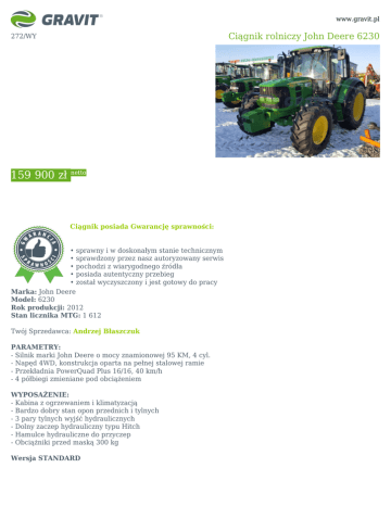 www.gravit.pl Ciągnik rolniczy John Deere 6230 272/WY 159 900 zł netto Ciągnik posiada Gwarancję sprawności: • sprawny i w doskonałym stanie technicznym • sprawdzony przez nasz autoryzowany serwis • pochodzi z wiarygodnego źródła • posiada autentyczny przebieg • został wyczyszczony i jest gotowy do pracy Marka: John Deere Model: 6230 Rok produkcji: 2012 Stan licznika MTG: 1 612 Twój Sprzedawca: Andrzej Błaszczuk PARAMETRY: - Silnik marki John Deere o mocy znamionowej 95 KM, 4 cyl. - Napęd 4WD, konstrukcja oparta na pełnej stalowej ramie - Przekładnia PowerQuad Plus 16/16, 40 km/h - 4 półbiegi zmieniane pod obciążeniem WYPOSAŻENIE: - Kabina z ogrzewaniem i klimatyzacją - Bardzo dobry stan opon przednich i tylnych - 3 pary tylnych wyjść hydraulicznych - Dolny zaczep hydrauliczny typu Hitch - Hamulce hydrauliczne do przyczep - Obciążniki przed maską 300 kg Wersja STANDARD