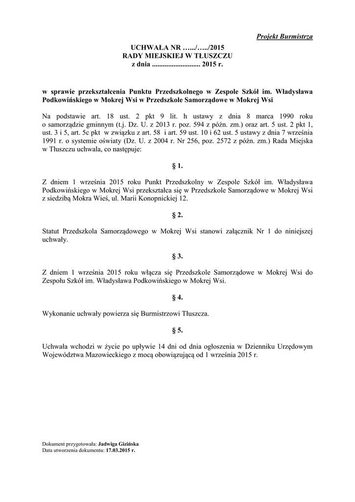 Projekt Burmistrza UCHWAŁA NR ….../…../2015 RADY MIEJSKIEJ W TŁUSZCZU z dnia ........................... 2015 r. w sprawie przekształcenia Punktu Przedszkolnego w Zespole Szkół im. Władysława Podkowińskiego w Mokrej Wsi w Przedszkole Samorządowe w Mokrej Wsi Na podstawie art. 18 ust. 2 pkt 9 lit. h ustawy z dnia 8 marca 1990 roku o samorządzie gminnym (t.j. Dz. U. z 2013 r. poz. 594 z późn. zm.) oraz art. 5 ust. 2 pkt 1, ust. 3 i 5, art. 5c pkt w związku z art. 58 i art. 59 ust. 10 i 62 ust. 5 ustawy z dnia 7 września 1991 r. o systemie oświaty (Dz. U. z 2004 r. Nr 256, poz. 2572 z późn. zm.) Rada Miejska w Tłuszczu uchwala, co następuje: § 1. Z dniem 1 września 2015 roku Punkt Przedszkolny w Zespole Szkół im. Władysława Podkowińskiego w Mokrej Wsi przekształca się w Przedszkole Samorządowe w Mokrej Wsi z siedzibą Mokra Wieś, ul. Marii Konopnickiej 12. § 2. Statut Przedszkola Samorządowego w Mokrej Wsi stanowi załącznik Nr 1 do niniejszej uchwały. § 3. Z dniem 1 września 2015 roku włącza się Przedszkole Samorządowe w Mokrej Wsi do Zespołu Szkół im. Władysława Podkowińskiego w Mokrej Wsi. § 4. Wykonanie uchwały powierza się Burmistrzowi Tłuszcza. § 5. Uchwała wchodzi w życie po upływie 14 dni od dnia ogłoszenia w Dzienniku Urzędowym Województwa Mazowieckiego z mocą obowiązującą od 1 września 2015 r. Dokument przygotowała: Jadwiga Gizińska Data utworzenia dokumentu: 17.03.2015 r. Uzasadnienie do projektu uchwały w sprawie przekształcenia Punktu Przedszkolnego w Zespole Szkół im. Władysława Podkowińskiego w Mokrej Wsi w Przedszkole Samorządowe w Mokrej Wsi Punkt Przedszkolny w Zespole Szkół im. Władysława Podkowińskiego w Mokrej Wsi został utworzony 1 października 2012 roku, uchwałą Rady Miejskiej w Tłuszczu z dnia 27 czerwca 2012 r. i umożliwiał objęcie wychowaniem przedszkolnym 15 dzieci. W 2014 roku zakończono realizację zadania inwestycyjnego „Rozbudowa budynku szkoły podstawowej o funkcję przedszkola wraz z przebudową fragmentu szkoły dla potrzeb bloku żywieniowego przedszkola w Mokrej Wsi”. Rozbudowany fragment szkoły obejmuje m.in. dwie sale przedszkolne z węzłami sanitarnymi o powierzchni pozwalającej na przebywanie w każdej 20 dzieci w wieku przedszkolnym. Oddane do użytkowania sale przedszkolne pozwalają na korzystanie z nich przez dzieci w wieku przedszkolnym. Spełnianie przez rozbudowaną część szkoły, warunków do funkcjonowania przedszkola oraz możliwość zwiększenia liczby dzieci objętych wychowaniem przedszkolnym, stanowi podstawę do przekształcenia Punktu Przedszkolnego w Przedszkole. W związku z powyższym podjęcie proponowanej uchwały jest uzasadnione.