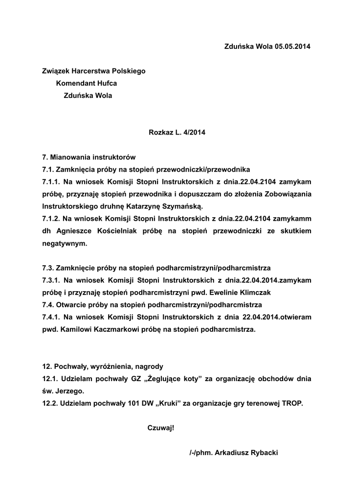 Zduńska Wola 05.05.2014 Związek Harcerstwa Polskiego Komendant Hufca Zduńska Wola Rozkaz L. 4/2014 7. Mianowania instruktorów 7.1. Zamknięcia próby na stopień przewodniczki/przewodnika 7.1.1. Na wniosek Komisji Stopni Instruktorskich z dnia.22.04.2104 zamykam próbę, przyznaję stopień przewodnika i dopuszczam do złożenia Zobowiązania Instruktorskiego druhnę Katarzynę Szymańską. 7.1.2. Na wniosek Komisji Stopni Instruktorskich z dnia.22.04.2104 zamykamm dh Agnieszce Kościelniak próbę na stopień przewodniczki ze skutkiem negatywnym. 7.3. Zamknięcie próby na stopień podharcmistrzyni/podharcmistrza 7.3.1. Na wniosek Komisji Stopni Instruktorskich z dnia.22.04.2014.zamykam próbę i przyznaję stopień podharcmistrzyni pwd. Ewelinie Klimczak 7.4. Otwarcie próby na stopień podharcmistrzyni/podharcmistrza 7.4.1. Na wniosek Komisji Stopni Instruktorskich z dnia 22.04.2014.otwieram pwd. Kamilowi Kaczmarkowi próbę na stopień podharcmistrza. 12. Pochwały, wyróżnienia, nagrody 12.1. Udzielam pochwały GZ „Żeglujące koty” za organizację obchodów dnia św. Jerzego. 12.2. Udzielam pochwały 101 DW „Kruki” za organizacje gry terenowej TROP. Czuwaj! /-/phm. Arkadiusz Rybacki