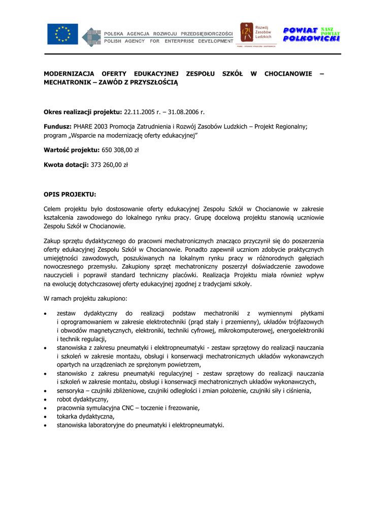 MODERNIZACJA OFERTY EDUKACYJNEJ MECHATRONIK – ZAWÓD Z PRZYSZŁOŚCIĄ ZESPOŁU SZKÓŁ W CHOCIANOWIE – Okres realizacji projektu: 22.11.2005 r. – 31.08.2006 r. Fundusz: PHARE 2003 Promocja Zatrudnienia i Rozwój Zasobów Ludzkich – Projekt Regionalny; program „Wsparcie na modernizację oferty edukacyjnej” Wartość projektu: 650 308,00 zł Kwota dotacji: 373 260,00 zł OPIS PROJEKTU: Celem projektu było dostosowanie oferty edukacyjnej Zespołu Szkół w Chocianowie w zakresie kształcenia zawodowego do lokalnego rynku pracy. Grupę docelową projektu stanowią uczniowie Zespołu Szkół w Chocianowie. Zakup sprzętu dydaktycznego do pracowni mechatronicznych znacząco przyczynił się do poszerzenia oferty edukacyjnej Zespołu Szkół w Chocianowie. Ponadto zapewnił uczniom zdobycie praktycznych umiejętności zawodowych, poszukiwanych na lokalnym rynku pracy w różnorodnych gałęziach nowoczesnego przemysłu. Zakupiony sprzęt mechatroniczny poszerzył doświadczenie zawodowe nauczycieli i poprawił standard techniczny placówki. Realizacja Projektu miała również wpływ na ewolucję dotychczasowej oferty edukacyjnej zgodnej z tradycjami szkoły. W ramach projektu zakupiono: zestaw dydaktyczny do realizacji podstaw mechatroniki z wymiennymi płytkami i oprogramowaniem w zakresie elektrotechniki (prąd stały i przemienny), układów trójfazowych i obwodów magnetycznych, elektroniki, techniki cyfrowej, mikrokomputerowej, energoelektroniki i technik regulacji, stanowiska z zakresu pneumatyki i elektropneumatyki - zestaw sprzętowy do realizacji nauczania i szkoleń w zakresie montażu, obsługi i konserwacji mechatronicznych układów wykonawczych opartych na urządzeniach ze sprężonym powietrzem, stanowisko z zakresu pneumatyki regulacyjnej - zestaw sprzętowy do realizacji nauczania i szkoleń w zakresie montażu, obsługi i konserwacji mechatronicznych układów wykonawczych, sensoryka – czujniki zbliżeniowe, czujniki odległości i zmian położenie, czujniki siły i ciśnienia, robot dydaktyczny, pracownia symulacyjna CNC – toczenie i frezowanie, tokarka dydaktyczna, stanowiska laboratoryjne do pneumatyki i elektropneumatyki.