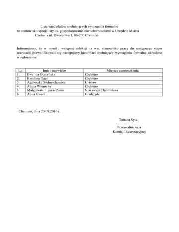 Lista kandydatów spełniających wymagania formalne na stanowisko specjalisty ds. gospodarowania nieruchomościami w Urzędzie Miasta Chełmna ul. Dworcowa 1, 86-200 Chełmno Informujemy, Ŝe w wyniku wstępnej selekcji na ww. stanowisko pracy do następnego etapu rekrutacji zakwalifikowali się następujący kandydaci spełniający wymagania formalne określone w ogłoszeniu: Lp 1. 2. 3. 4. 5. 6. Imię i nazwisko Ewelina Gostyńska Karolina Ogar Agnieszka Stelmachowicz Alicja Winnicka Małgorzata Figura- Zima Anna Gwara Miejsce zamieszkania Chełmno Chełmno Unisław Chełmno Nowawieś Chełmińska Grudziądz Chełmno, dnia 20.09.2016 r. Tatiana Syta Przewodnicząca Komisji Rekrutacyjnej