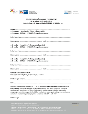 Warszawa 26.08.2015 ZGŁOSZENIE NA ŚNIADANIE TEMATYCZNE 18 września 2015, godz. 10:00 Hotel Bulwar, ul. Bulwar Filadelfijski 18, 87-100 Toruń FIRMA: ........................................................................................................................ □ 1. osoba bezpłatnie* (firmy członkowskie) □ 1. osoba 50 PLN + 23% VAT (firmy niezrzeszone) Imię i nazwisko: ............................................................................................................ Stanowisko: ............................................... e-mail: ..................................................... □ 2. osoba bezpłatnie* (firmy członkowskie) □ 2. osoba 50 PLN + 23% VAT (firmy niezrzeszone) Imię i nazwisko: ............................................................................................................ Stanowisko: ............................................... e-mail: ..................................................... □ 3. osoba bezpłatnie* (firmy członkowskie) □ 3. osoba 50 PLN + 23% VAT (firmy niezrzeszone) Imię i nazwisko: ............................................................................................................ Stanowisko: ............................................... e-mail: ..................................................... WARUNKI UCZESTNICTWA: Przy zgłoszeniach płatnych prosimy o podanie: Dokładnego adresu: …................................................................................................... NIP: ............................................................................................................................... Potwierdzenie prosimy przesłać do 11.09.2015na adres [email protected] lub faksem na nr 022-5310600.Spotkanie odbędzie się w języku polskim, potrwa ok. 2 godzin. *Udział w spotkaniu dla przedstawicieli firm członkowskich jest bezpłatny, jednak w przypadku rezygnacji z uczestnictwa po 11.09.2015 organizatorzy zastrzegają sobie prawo obciążenia uczestnika kosztami organizacyjnymi w wysokości 100 PLN + 23% VAT Data/Podpis ……………………………………………………..………………......................................