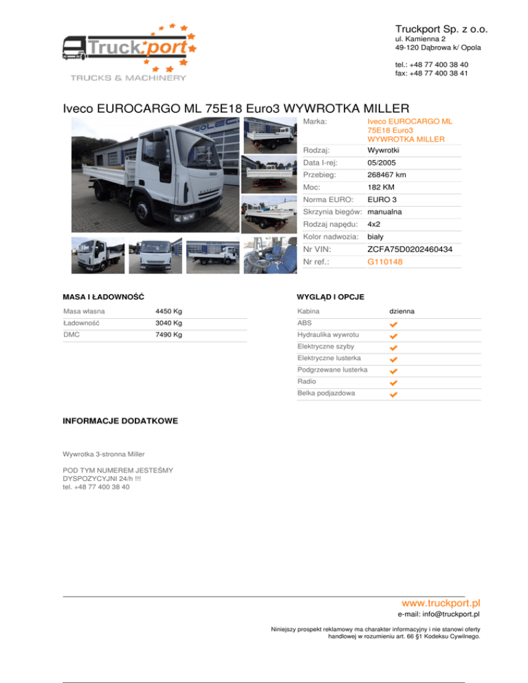 Truckport Sp. z o.o. ul. Kamienna 2 49-120 Dąbrowa k/ Opola tel.: +48 77 400 38 40 fax: +48 77 400 38 41 Iveco EUROCARGO ML 75E18 Euro3 WYWROTKA MILLER Marka: Iveco EUROCARGO ML 75E18 Euro3 WYWROTKA MILLER Rodzaj: Wywrotki Data I-rej: 05/2005 Przebieg: 268467 km Moc: 182 KM Norma EURO: EURO 3 Skrzynia biegów: manualna MASA I ŁADOWNOŚĆ Rodzaj napędu: 4x2 Kolor nadwozia: biały Nr VIN: ZCFA75D0202460434 Nr ref.: G110148 WYGLĄD I OPCJE Masa własna 4450 Kg Kabina Ładowność 3040 Kg ABS DMC 7490 Kg Hydraulika wywrotu dzienna Elektryczne szyby Elektryczne lusterka Podgrzewane lusterka Radio Belka podjazdowa INFORMACJE DODATKOWE Wywrotka 3-stronna Miller POD TYM NUMEREM JESTEŚMY DYSPOZYCYJNI 24/h !!! tel. +48 77 400 38 40 www.truckport.pl e-mail: [email protected] Niniejszy prospekt reklamowy ma charakter informacyjny i nie stanowi oferty handlowej w rozumieniu art. 66 §1 Kodeksu Cywilnego. Powered by TCPDF (www.tcpdf.org)