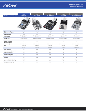 www.rebell4you.com [email protected] REBELL CANON CASIO CITIZEN SHARP PDC20 P23-DTSC HR-150TEC CX-32N EL-1750PIIIGY PDC20 P23-DTSC HR-150TEC CX-32N EL-1750PIIIGY 12 12 12 12 12 LCD LCD LCD LCD LCD Źródło zasilania 4 x AA, opcjonalnie AC zasilacz 4 x AA, opcjonalnie AC zasilacz 4 x AA, opcjonalnie AC zasilacz 4 x AA, opcjonalnie AC zasilacz 4 x AA, opcjonalnie AC zasilacz Kolorowy druk czarny & czerwony niebieski & czerwony czarny & czerwony niebieski & czerwony czarny & czerwony IR40T IR40T IR40T IR40T IR40T Tabelka porównawcza Opis podstawowy Możliwości wyświetlacza Typ wyświetlacza Rolka Szybkość drukowania (wiersze na sekundę) Wymiary (mm) Waga Funkcje 2 2,3 2 1,9 2 220 x 155 x 57 mm 235 x 155 x 55 mm 285 x 165 x 67 226 x 147 x 68 mm 230 x 150 x 51,5 mm 0,480 kg 0,410 kg 0,520 kg 0,410 kg 0,530 kg PDC20 P23-DTSC HR-150TEC CX-32N EL-1750PIIIGY Pamięć niezależna tak tak tak tak tak Obliczanie podatku (TAX+/TAX–) tak tak tak tak tak Koszt/sprzedaż/marża tak tak tak tak tak Funkcja wymiany walut tak tak tak tak nie Suma całkowita (*) i częściowa (◊) tak tak tak tak tak Klawisz % tak tak tak tak tak F-3-2-0-A F-3-2-0-A F-3-2-0-A F-3-2-0-A F-3-2-0-A Wybór zaokrąglania ( , 5/4, ) tak tak tak tak tak Klawisz powrotu (00→0) nie tak tak nie tak Wybór miejsca po przecinku jest zastrzeżonym znakiem towarowym.