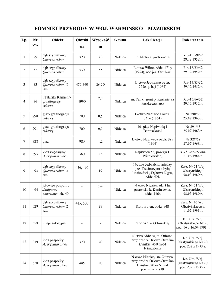 POMNIKI PRZYRODY W WOJ. WARMIŃSKO – MAZURSKIM Lp. Nr ew. Obiekt Obwód Wysokość cm m Gmina Lokalizacja Rok uznania 1 59 dąb szypułkowy Quercus robur 320 25 Nidzica m. Nidzica, podzamcze Rlb-16/59/52 29.12.1952 r. 2 62 dąb szypułkowy Quercus robur 530 35 Nidzica L-ctwo Wikno oddz. 171p (1964), nad jez. Omulew Rlb-16/62/52 29.12.1952 r. 3 63 dąb szypułkowy Quercus robur- 8 szt. 470-660 26-30 Nidzica L-ctwo Jedwabno oddz. 229c, g, h, j (1964) Rlb-16/63/52 29.12.1952 r. 4 66 „Tatarski Kamień”granitognejs różowy 1900 Nidzica m. Tatry, grunt p. Kazimierza Paszkowskiego Rlb-16/66/52 29.12.1952 r. 5 290 głaz- granitognejs różowy 700 0,5 Nidzica L-ctwo Napiwoda oddz. 331o (1964) Nr 290/63 25.07.1963 r. 6 291 głaz- granitognejs różowy 700 0,3 Nidzica Między Napiwodą i Bartoszkami Nr 291/63 25.07.1963 r. 7 328 głaz 980 1,2 Nidzica L-ctwo Napiwoda oddz. 38a (1964) Nr 328/68 27.07.1968 r. 8 395 klon zwyczajny Acer platanoides 360 23 Nidzica Napiwoda 56, posesja J. Wiśniewskiej RGŻL-op-395/84 11.06.1984 r. 9 493 dąb szypułkowy Quercus robur- 2 szt. 450, 460 Nidzica N-ctwo Jedwabno, między jez. Trzcinowym a byłą leśniczówką Dębowa Kępa, oddz. 52b Zarz. Nr 21 Woj. Olsztyńskiego 08.03.1989 r. 10 494 jałowiec pospolity Juniperus communis- ok. 40 - Nidzica N-ctwo Nidzica, ok. 3 ha pastwiska k. Koniuszyna, oddz. 246h Zarz. Nr 21 Woj. Olsztyńskiego 08.03.1989 r. 11 529 dąb szypułkowy Quercus robur- 2 szt. 415, 530 27 Nidzica Koło Bojen, oddz. 348 Zarz. Nr 16 Woj. Olsztyńskiego z 11.02.1991 r. 12 558 3 leje sufozyjne - Nidzica S od Wólki Orłowskiej Dz. Urz. Woj. Olsztyńskiego Nr 7, poz. 66 z 16.04.1992 r. 819 klon pospolity Acer platanoides Nidzica N-ctwo Nidzica, m. Orłowo, przy drodze Orłowo-Brzeźno Łyńskie, 450 m od leśniczówki Dz. Urz. Woj. Olsztyńskiego Nr 20, poz. 202 z 1995 r. 820 klon pospolity Acer platanoides Nidzica N-ctwo Nidzica, m. Orłowo, przy drodze Orłowo-Brzeźno Łyńskie, 70 m NE od pomnika nr 819 Dz. Urz. Woj. Olsztyńskiego Nr 20, poz. 202 z 1995 r. 13 14 - 370 445 2,1 19 1-4 20 20 Lp. Nr ew. Obiekt Obwód Wysokość cm m 430 20 Gmina Lokalizacja Rok uznania Nidzica N-ctwo Olsztynek, m. Malinowo, oddz. 415g, 100 m na W od toru PKP Olsztyn-Nidzica Dz. Urz. Woj. Olsztyńskiego Nr 35 poz. 493 z 1997 r. 15 878 dąb szypułkowy Quercus robur„Hubert” 16 255 buk pospolity Fagus sylvatica 440 25 Nowe Miasto Lubawskie L-ctwo Tylice, oddz. 30f 1988 r. 17 256 buk pospolity Fagus sylvatica 502 25 Nowe Miasto Lubawskie L-ctwo Tylice, oddz. 31b 1988 r. 18 257 sosna pospolita Pinus silvestris 443 23 Nowe Miasto Lubawskie L-ctwo Tylice, oddz. 17b 1988 r. 19 258 dąb szypułkowy Quercus robur- 2 szt. 354, 410 24, 25 Nowe Miasto Lubawskie L-ctwo Tylice, oddz. 12f 1988 r.