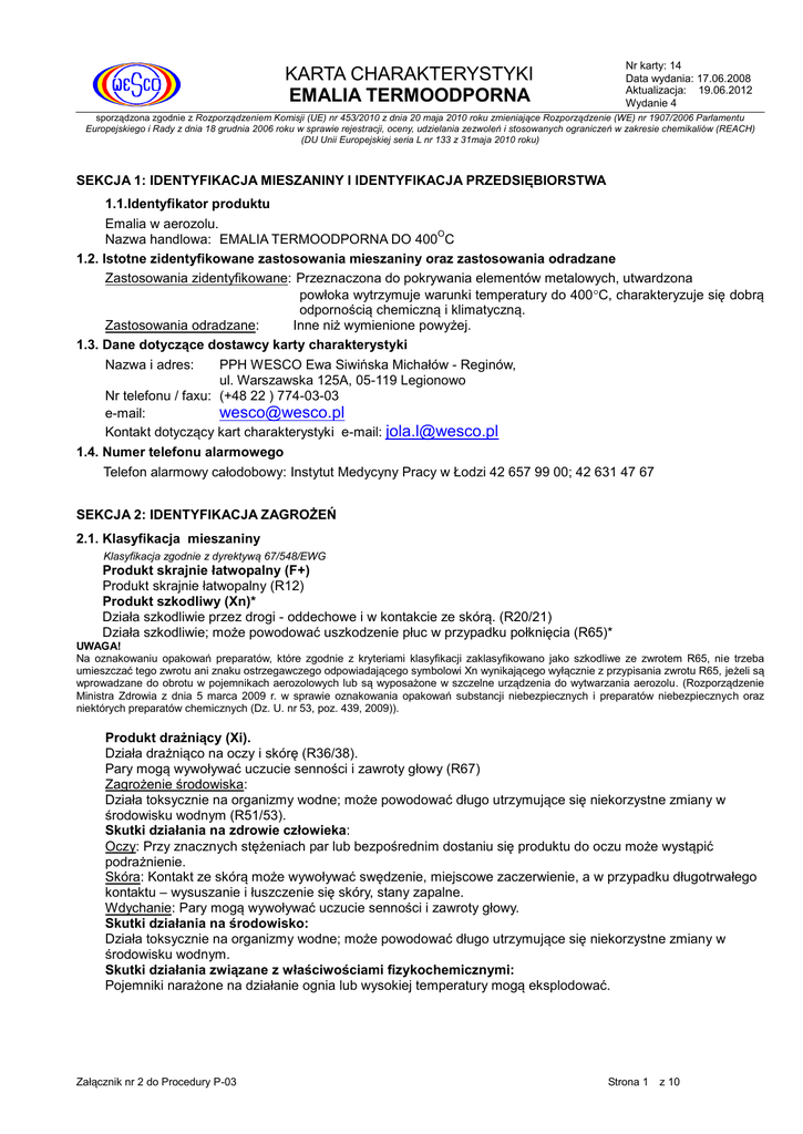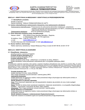 Nr karty: 14 Data wydania: 17.06.2008 Aktualizacja: 19.06.2012 Wydanie 4 KARTA CHARAKTERYSTYKI EMALIA TERMOODPORNA sporządzona zgodnie z Rozporządzeniem Komisji (UE) nr 453/2010 z dnia 20 maja 2010 roku zmieniające Rozporządzenie (WE) nr 1907/2006 Parlamentu Europejskiego i Rady z dnia 18 grudnia 2006 roku w sprawie rejestracji, oceny, udzielania zezwoleń i stosowanych ograniczeń w zakresie chemikaliów (REACH) (DU Unii Europejskiej seria L nr 133 z 31maja 2010 roku) SEKCJA 1: IDENTYFIKACJA MIESZANINY I IDENTYFIKACJA PRZEDSIĘBIORSTWA 1.1.Identyfikator produktu Emalia w aerozolu. O Nazwa handlowa: EMALIA TERMOODPORNA DO 400 C 1.2. Istotne zidentyfikowane zastosowania mieszaniny oraz zastosowania odradzane Zastosowania zidentyfikowane: Przeznaczona do pokrywania elementów metalowych, utwardzona powłoka wytrzymuje warunki temperatury do 400C, charakteryzuje się dobrą odpornością chemiczną i klimatyczną. Zastosowania odradzane: Inne niż wymienione powyżej. 1.3. Dane dotyczące dostawcy karty charakterystyki Nazwa i adres: PPH WESCO Ewa Siwińska Michałów - Reginów, ul. Warszawska 125A, 05-119 Legionowo Nr telefonu / faxu: (+48 22 ) 774-03-03 e-mail: [email protected] Kontakt dotyczący kart charakterystyki e-mail: [email protected] 1.4. Numer telefonu alarmowego Telefon alarmowy całodobowy: Instytut Medycyny Pracy w Łodzi 42 657 99 00; 42 631 47 67 SEKCJA 2: IDENTYFIKACJA ZAGROŻEŃ 2.1. Klasyfikacja mieszaniny Klasyfikacja zgodnie z dyrektywą 67/548/EWG Produkt skrajnie łatwopalny (F+) Produkt skrajnie łatwopalny (R12) Produkt szkodliwy (Xn)* Działa szkodliwie przez drogi - oddechowe i w kontakcie ze skórą. (R20/21) Działa szkodliwie; może powodować uszkodzenie płuc w przypadku połknięcia (R65)* UWAGA! Na oznakowaniu opakowań preparatów, które zgodnie z kryteriami klasyfikacji zaklasyfikowano jako szkodliwe ze zwrotem R65, nie trzeba umieszczać tego zwrotu ani znaku ostrzegawczego odpowiadającego symbolowi Xn wynikającego wyłącznie z przypisania zwrotu R65, jeżeli są wprowadzane do obrotu w pojemnikach aerozolowych lub są wyposażone w szczelne urządzenia do wytwarzania aerozolu. (Rozporządzenie Ministra Zdrowia z dnia 5 marca 2009 r. w sprawie oznakowania opakowań substancji niebezpiecznych i preparatów niebezpiecznych oraz niektórych preparatów chemicznych (Dz. U. nr 53, poz. 439, 2009)). Produkt drażniący (Xi). Działa drażniąco na oczy i skórę (R36/38). Pary mogą wywoływać uczucie senności i zawroty głowy (R67) Zagrożenie środowiska: Działa toksycznie na organizmy wodne; może powodować długo utrzymujące się niekorzystne zmiany w środowisku wodnym (R51/53). Skutki działania na zdrowie człowieka: Oczy: Przy znacznych stężeniach par lub bezpośrednim dostaniu się produktu do oczu może wystąpić podrażnienie. Skóra: Kontakt ze skórą może wywoływać swędzenie, miejscowe zaczerwienie, a w przypadku długotrwałego kontaktu – wysuszanie i łuszczenie się skóry, stany zapalne. Wdychanie: Pary mogą wywoływać uczucie senności i zawroty głowy. Skutki działania na środowisko: Działa toksycznie na organizmy wodne; może powodować długo utrzymujące się niekorzystne zmiany w środowisku wodnym. Skutki działania związane z właściwościami fizykochemicznymi: Pojemniki narażone na działanie ognia lub wysokiej temperatury mogą eksplodować. Załącznik nr 2 do Procedury P-03 Strona 1 z 10 Nr karty: 14 Data wydania: 17.06.2008 Aktualizacja: 19.06.2012 Wydanie 4 KARTA CHARAKTERYSTYKI EMALIA TERMOODPORNA sporządzona zgodnie z Rozporządzeniem Komisji (UE) nr 453/2010 z dnia 20 maja 2010 roku zmieniające Rozporządzenie (WE) nr 1907/2006 Parlamentu Europejskiego i Rady z dnia 18 grudnia 2006 roku w sprawie rejestracji, oceny, udzielania zezwoleń i stosowanych ograniczeń w zakresie chemikaliów (REACH) (DU Unii Europejskiej seria L nr 133 z 31maja 2010 roku) 2.2. Elementy oznakowania ZNAKI OSTRZEGAWCZE Xn szkodliwy F+ skrajnie łatwopalny N niebezpieczny dla środowiska Zwroty wskazujące rodzaj zagrożenia: R20/21 Działa szkodliwie przez drogi - oddechowe i w kontakcie ze skórą. R36/38 Działa drażniąco na oczy i skórę. R 67 Pary mogą wywoływać uczucie senności i zawroty głowy R51/53 Działa toksycznie na organizmy wodne; może powodować długo utrzymujące się niekorzystne zmiany w środowisku wodnym. Zwroty określające warunki bezpiecznego stosowania: S23 Nie wdychać rozpylonej cieczy. S24/25 - Unikać zanieczyszczenia skóry i oczu. S51 Stosować wyłącznie w dobrze wentylowanych pomieszczeniach. S29/35 Nie wprowadzać do kanalizacji, a produkt i opakowanie usuwać w sposób bezpieczny. UWAGA!!! Na pojemniku należy umieścić napisy: Pojemnik pod ciśnieniem: chronić przed słońcem i nagrzaniem powyżej temperatury 50C. Nie przekłuwać ani nie spalać, także po zużyciu. Nie przechowywać w pobliżu źródeł zapłonu – nie palić tytoniu. Chronić przed dziećmi. Nie rozpylać nad otwartym płomieniem lub żarzącym się materiałem. 2.3. Inne zagrożenia Mieszanina nie spełnia kryteriów klasyfikacji dot. substancji trwałych, wykazujących zdolność do bioakumulacji i toksycznych (PBT) lub bardzo trwałych i wykazujących bardzo dużą zdolność do bioakumulacji (vPvB). SEKCJA 3: SKŁAD/INFORMACJA O SKŁADNIKACH 3.2. Mieszaniny Skład mieszaniny Nazwa substancji uł. masowy w % wag. nr indeksowy nr WE nr CAS Klasyfikacja zgodna z dyrektywą Rady 67/548/EWG Symbol i znak ostrzegawczy F Niskowrząca frakcja naftowa obrabiana wodorem* 30-35 649-339-00-1 295-438-4 92045-57-3 Xn Zwroty R Klasyfikacja zgodna z rozporządzeniem (WE) nr 1272/2008 Klasy zagrożenia i kody kategorii Kody zwrotów wskazujących rodzaj zagrożenia 11 36/38 65 67 51/53 Flam. Liq. 2 10 Flam. Liq.3 H226 Asp. Tox. 1 H304 10 20/21 38 Flam. Liq.3 Acute Tox.4 Skin Irrit.2 H226 H332 H312 H315 12 Flam. Gas 1 Press. Gas Asp. Tox. 1 Aquatic chronic, 2 H225 H304 H411 H336 N Eter naftowy, niskowrząca frakc