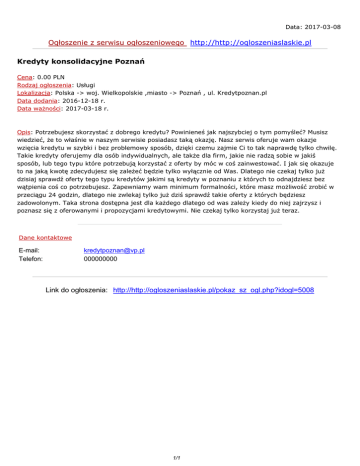 Data: 2017-03-08 Ogłoszenie z serwisu ogłoszeniowego http://http://ogloszeniaslaskie.pl Kredyty konsolidacyjne Poznań Cena: 0.00 PLN Rodzaj ogłoszenia: Usługi Lokalizacja: Polska -> woj. Wielkopolskie ,miasto -> Poznań , ul. Kredytpoznan.pl Data dodania: 2016-12-18 r. Data ważności: 2017-03-18 r. Opis: Potrzebujesz skorzystać z dobrego kredytu? Powinieneś jak najszybciej o tym pomyśleć? Musisz wiedzieć, że to właśnie w naszym serwisie posiadasz taką okazję. Nasz serwis oferuje wam okazje wzięcia kredytu w szybki i bez problemowy sposób, dzięki czemu zajmie Ci to tak naprawdę tylko chwilę. Takie kredyty oferujemy dla osób indywidualnych, ale także dla firm, jakie nie radzą sobie w jakiś sposób, lub tego typu które potrzebują korzystać z oferty by móc w coś zainwestować. I jak się okazuje to na jaką kwotę zdecydujesz się zależeć będzie tylko wyłącznie od Was. Dlatego nie czekaj tylko już dzisiaj sprawdź oferty tego typu kredytów jakimi są kredyty w poznaniu z których to odnajdziesz bez wątpienia coś co potrzebujesz. Zapewniamy wam minimum formalności, które masz możliwość zrobić w przeciągu 24 godzin, dlatego nie zwlekaj tylko już dziś sprawdź takie oferty z których będziesz zadowolonym. Taka strona dostępna jest dla każdego dlatego od was zależy kiedy do niej zajrzysz i poznasz się z oferowanymi i propozycjami kredytowymi. Nie czekaj tylko korzystaj już teraz. Dane kontaktowe E-mail: Telefon: [email protected] 000000000 Link do ogłoszenia: http://http://ogloszeniaslaskie.pl/pokaz_sz_ogl.php?idogl=5008 1/1
