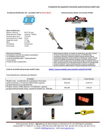 Urządzenie do wypalania chwastów podczerwienią model Lady Producent Brühwiler AG – produkt 100 % Swiss Made Dane techniczne: Obszar roboczy Butla gazowa 330g Zużycie gazu na h Czas pracy na 1 butli Waga bez butli Moc Produkcja Gwarancja Autoryzowany dealer na terenie Polski 85/170 mm propan / Butan 125 g/h 2,6 h 1,7 kg 1,5 kW Szwajcaria 2 lata Właściwości użytkowe; ✔ wypalanie chwastów bez żadnych chemikaliów ✔ z palnikiem podczerwieni ✔ nie ma otwartego ognia – żadnych płomieni ✔ zero hałasu ✔ super prosty w użytkowaniu Link do youtube jak pracuje model Lady; Model Lady jest idealny do użytku na około domu, ogrodzie i innych terenach zewnętrznych, przeznaczony jest do selektywnego zwalczania chwastów. Wymiary palnika (obszar podczerwieni) umożliwiają optymalne wykorzystanie na klombach, między i wśród krzewami i między posadzonymi rzędami w ogrodzie warzywnym i szklarni. Dzięki swojej masie, bardzo lekki (2 kg), urządzenie może być łatwo wykorzystane na suchych kamiennych murach, na schodach lub stromych stokach. Tarasy, ścieżki ogrodowe ,żwirowe, podjazdy i tarasy na dachu to tylko niektóre z innych możliwych zastosowań. https://www.youtube.com/watch?v=p5mTV1O-l4M Cena detaliczna z dostawą do klienta: Produkt Model Lady - urządzenie do wypalania chwastów podczerwienią, w zestawie jedna butla z gazem propan/butan oraz zapalniczka Propan -butan 330K, karton z 12 butlami z gazem propan/butan każda 330 g , marki Providus srl - Włochy Cena netto Cena brutto 933,10 1147,71 301,00 370,23 Autoryzowany dealer : Agrotur Jacek Zborzynski, ul. Kwiatowa 47, 24-300 Opole Lubelskie, Poland NIP 717-000-27-11, kom.: 509 506 544, 509 506 533, Tel: 81 827 49 15 Fax: 81 827 41 41 e-mail: [email protected] web: www.agrotur.eu