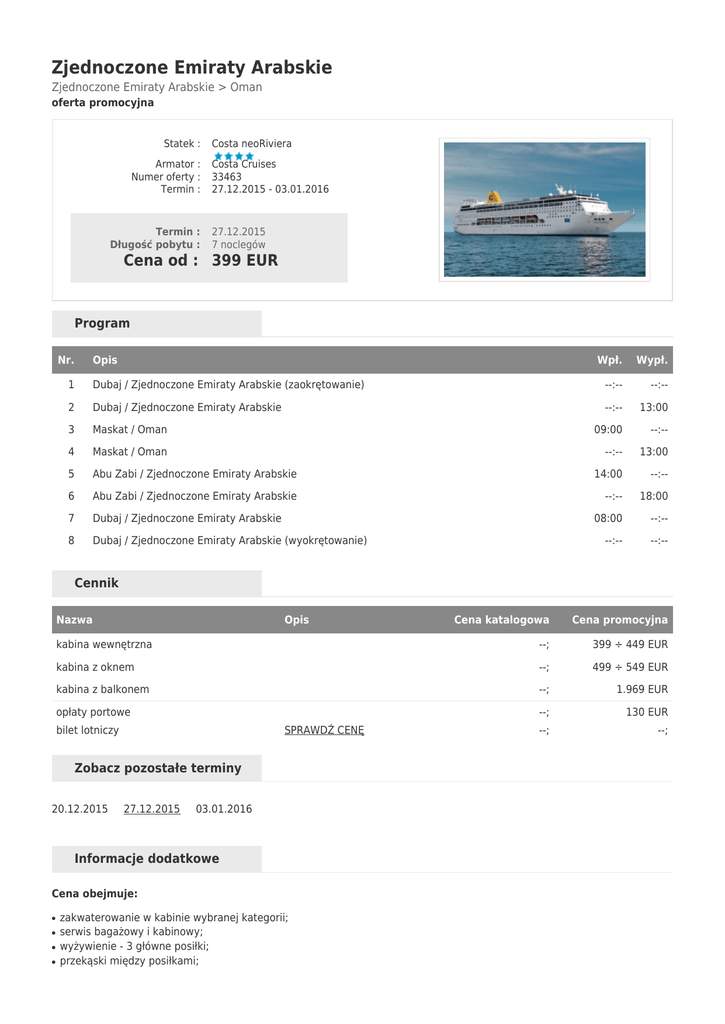 Zjednoczone Emiraty Arabskie Zjednoczone Emiraty Arabskie > Oman oferta promocyjna Statek : Armator : Numer oferty : Termin : Termin : Długość pobytu : Costa neoRiviera Costa Cruises 33463 27.12.2015 - 03.01.2016 27.12.2015 7 noclegów Cena od : 399 EUR Program Nr. Opis Wpł. Wypł. 1 Dubaj / Zjednoczone Emiraty Arabskie (zaokrętowanie) --:-- --:-- 2 Dubaj / Zjednoczone Emiraty Arabskie --:-- 13:00 3 Maskat / Oman 09:00 --:-- 4 Maskat / Oman --:-- 13:00 5 Abu Zabi / Zjednoczone Emiraty Arabskie 14:00 --:-- 6 Abu Zabi / Zjednoczone Emiraty Arabskie --:-- 18:00 7 Dubaj / Zjednoczone Emiraty Arabskie 08:00 --:-- 8 Dubaj / Zjednoczone Emiraty Arabskie (wyokrętowanie) --:-- --:-- Cennik Nazwa Opis Cena katalogowa Cena promocyjna kabina wewnętrzna --; 399 ÷ 449 EUR kabina z oknem --; 499 ÷ 549 EUR kabina z balkonem --; 1.969 EUR --; 130 EUR --; --; opłaty portowe bilet lotniczy SPRAWDŹ CENĘ Zobacz pozostałe terminy 20.12.2015 27.12.2015 03.01.2016 Informacje dodatkowe Cena obejmuje: ● ● ● ● zakwaterowanie w kabinie wybranej kategorii; serwis bagażowy i kabinowy; wyżywienie - 3 główne posiłki; przekąski między posiłkami; ● ● korzystanie z basenu i innych urządzeń sportowo-rekreacyjnych; udział we wszystkich imprezach organizowanych na statku. Cena nie obejmuje: ● ● ● ● ● ● ● ● opłat portowych; kosztów dojazdu do portu; ewentualnych noclegów w hotelu przed/po rejsie i transferów (na zapytanie); wycieczek fakultatywnych; korzystania z punktów usługowych (pralnia, fotograf, salon piękności i odnowy biologicznej, internet); napojów do obiadów i kolacji, wody, drinków; napiwków obowiązkowych dla obsługi statku (ok. 8,5€/dzień/osoba powyżej 14 roku życia; 4,25€/dzień/dziecko w wieku 4-13); ubezpieczenia KL, NW i bagażu. ALL INCLUSIVE (opcja): Istnieje możliwość wykupienia pakietu ALL INCLUSIVE obejmującego wybrane napoje alkoholowe i bezalkoholowe dostępne bez ograniczeń we wszystkich barach. Cena pakietu: ● ● ● ● 25€/dzień/osoba dorosła i 16€/dzień/dziecko 25€ (pakiet bez koktajli)/dzień/osoba dorosła - pobierz ulotkę; (ważne od 27.11.2015) 28€ (pakiet z koktajlami)/dzień/osoba dorosła - pobierz ulotkę; (ważne od 27.11.2015) 16€/dzień/dziecko - pobierz ulotkę. (ważne od 27.11.2015) Dla statków klasy Neo cena pakietu: ● ● 28,75€ (pakiet z koktajlami)/dzień/osoba dorosła; 17,25€/dzień/dziecko. Warunkiem skorzystania z pakietu all inclusive jest wykupienie pakietu przez wszystkich pasażerów w kabinie na czas całego rejsu. Dla Rejsów trwających mniej niż 7 dni nie ma możliwości wykupienia pakietu all inclisive. Linia Costa Cruises proponuje pakiety winno-piwne, pakiety wodne (szczegóły u Konsultanta). Uwagi: Kabiny 3/4 osobowe nie są dostępne we wszystkich kategoriach, a ich liczba jest ograniczona - sprzedaż tylko po potwierdzeniu; ceny wycieczek fakultatywnych, propozycje dojazdu do portu, hoteli przed/po rejsie na zapytanie. Na pokładzie statku obowiązuje bezgotówkowy system opłat. Należność reguluje się ostatniego dnia rejsu gotówką (wpłata depozytu ok. 250€/kabina pierwszego dnia rejsu) lub kartą kredytową (VISA, Mastercard, American Express) na podstawie zbiorczego rachunku. Karty kredytowe należy zarejestrować zaraz po zaokrętowaniu.