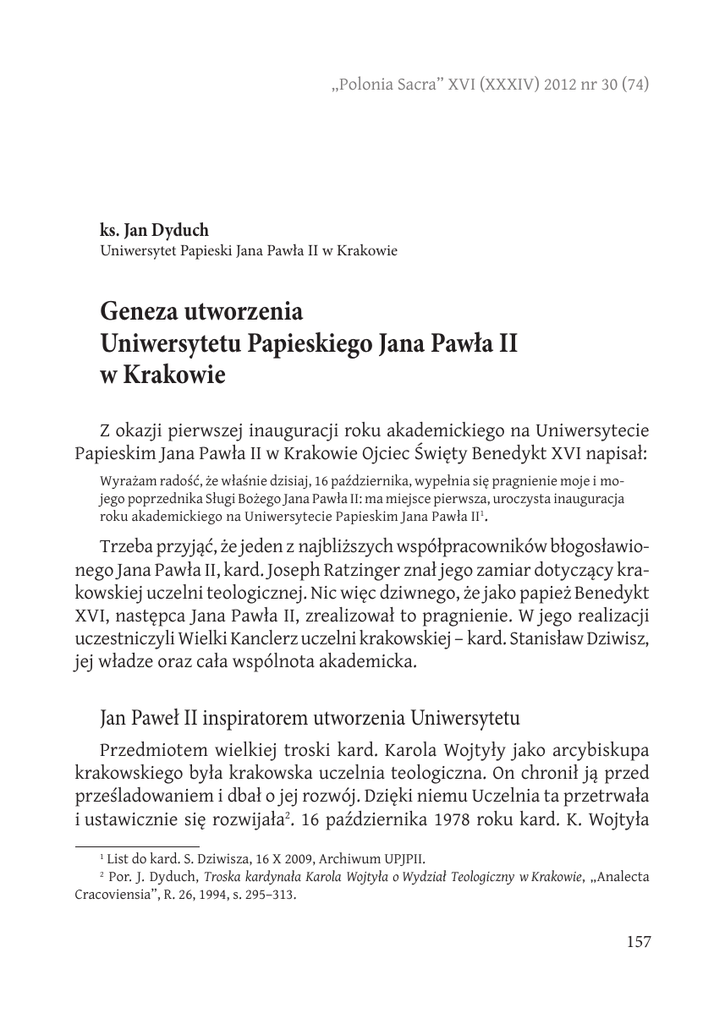 „Polonia Sacra” XVI (XXXIV) 2012 nr 30 (74) ks. Jan Dyduch Uniwersytet Papieski Jana Pawła II w Krakowie Geneza utworzenia Uniwersytetu Papieskiego Jana Pawła II w Krakowie Z okazji pierwszej inauguracji roku akademickiego na Uniwersytecie Papieskim Jana Pawła II w Krakowie Ojciec Święty Benedykt XVI napisał: Wyrażam radość, że właśnie dzisiaj, 16 października, wypełnia się pragnienie moje i mojego poprzednika Sługi Bożego Jana Pawła II: ma miejsce pierwsza, uroczysta inauguracja roku akademickiego na Uniwersytecie Papieskim Jana Pawła II1. Trzeba przyjąć, że jeden z najbliższych współpracowników błogosławionego Jana Pawła II, kard. Joseph Ratzinger znał jego zamiar dotyczący krakowskiej uczelni teologicznej. Nic więc dziwnego, że jako papież Benedykt XVI, następca Jana Pawła II, zrealizował to pragnienie. W jego realizacji uczestniczyli Wielki Kanclerz uczelni krakowskiej – kard. Stanisław Dziwisz, jej władze oraz cała wspólnota akademicka. Jan Paweł II inspiratorem utworzenia Uniwersytetu Przedmiotem wielkiej troski kard. Karola Wojtyły jako arcybiskupa krakowskiego była krakowska uczelnia teologiczna. On chronił ją przed prześladowaniem i dbał o jej rozwój. Dzięki niemu Uczelnia ta przetrwała i ustawicznie się rozwijała2. 16 października 1978 roku kard. K. Wojtyła List do kard. S. Dziwisza, 16 X 2009, Archiwum UPJPII. Por. J. Dyduch, Troska kardynała Karola Wojtyła o Wydział Teologiczny w Krakowie, „Analecta Cracoviensia”, R. 26, 1994, s. 295–313. 1 2 157 został wybrany pasterzem Kościoła powszechnego. Tym samym zakończył się okres krakowski jego opieki nad krakowską uczelnią teologiczną, ale nie zakończyła się troska o nią. Można powiedzieć, że rozpoczął się okres nowej, jeszcze skuteczniejszej i o większych rozmiarach opieki nad tą Uczelnią i zainteresowania papieża Jana Pawła II jej sprawami. Wyrazem tego były spotkania ze wspólnotą akademicką Uczelni podczas pielgrzymek do ojczyzny, a także w Rzymie przy różnych okazjach. Były orędzia wysyłane na inaugurację roku akademickiego, przemówienia wygłaszane w takich czy innych okolicznościach. Można mówić o ustawicznym kontakcie Jana Pawła II z krakowską Uczelnią3. Już podczas I pielgrzymki do ojczyzny Jan Paweł II spotkał się z pracownikami Papieskiego Wydziału Teologicznego w Krakowie dnia 9 czerwca 1979 roku. W przemówieniu wygłoszonym z tej okazji podkreślił: Z tego, co powiedziałem, wynika, że rzeczywistością jest Papieski Wydział Teologiczny, a prócz tego jest projekt, który w nim tkwi. Reszta zależy w znacznej mierze od tego, w jaki sposób Uczelnia sama, Kościół Krakowski, jego widzialna głowa będą ten projekt rozwijać i realizować4. Słowa te stwierdzają, że w Papieskim Wydziale Teologicznym istnieją możliwości dalszego rozwoju, których realizacja zależy przede wszystkim od wspólnoty akademickiej. Przywołaną wypowiedź można także postrzegać jako zachętę i wezwanie do dalszego rozwoju. Patrząc już z pewnego dystansu czasowego, można dostrzec, że wypowiedź Papieża stała się bodźcem dla ówczesnej kadry akademickiej, władz Uczelni do troski o jej rozwój, o zintensyfikowanie pracy naukowo-dydaktycznej, do powiększania kwalifikacji naukowych i liczby pracowników. Ten dynamiczny rozwój doprowadził do ważnej decyzji Jana Pawła II, wyrażonej w motu proprio Beata Hedvigis z 8 grudnia 1981 roku, ustanawiającego Papieską Akademię Teologiczną w Krakowie5. W dokumencie Papież napisał: Mając przeto na uwadze przyszły rozwój Uczelni […] ustanawiamy […] i erygujemy mocą tego pisma i powagą naszą apostolską Papieską Akademię w Krakowie, przyznając jej prawa, honory, przywileje i obowiązki, jakie w całym katolickim świecie przysługują tego rodzaju uczelniom i powierzamy ją opiece Archidiecezji Krakowskiej6. Por. tenże, Papież Jan Paweł II – protektor Papieskiej Akademii Teologicznej, [w:] Sympozjum naukowe z okazji 15-lecia pontyfikatu Jana Pawła II, red. J. Szczurek i R. Zawadzki, Kraków 1994, s. 107–121. 4 Jan Paweł II, Przemówienie 9 VI 1979, „Notificationes”, R. 117, 1979, s. 234–236. 5 „Notificationes”, R. 120, 1982, s. 65–70. 6 Tamże, s. 70. 3 158 Dokument papieski erygujący Papieską Akademię jest nie tylko zakończeniem pewnego etapu rozwoju krakowskiej Uczelni teologicznej, ale i rozpoczęciem nowego. Wyraźnie mówi Papież o przyznaniu Akademii uprawnień i zadań, które wieńczą jej dotychczasowy rozwój. Podkreśla także potrzebę jej przyszłego rozwoju, stąd można śmiało powiedzieć, że dokument ten rozpoczyna kolejny etap rozwoju Akademii wiodący do utworzenia Uniwersytetu7. Drodze tej nadal patronuje Jan Paweł II, który śledzi dalsze losy Papieskiej Akademii i wspiera ją w wieloraki sposób. Tym bardziej, że jest ona w dalszym ciągu przedmiotem ataków komunistycznych władz państwowych w Polsce. Po bardzo krótkim okresie przerwy w atakach na Uczelnię krakowską, bowiem reżim komunistyczny był zajęty rozprawą z opozycją polityczną zgromadzoną w ruchu „Solidarność”, na nowo wszczęto jej prześladowania. Ich przejawem było choćby, wręcz maniakalne skreślanie przez cenzurę państwową nazwy „Papieska Akademia w Krakowie” i brak jakiegokolwiek uznania. W tej sytuacji każdy gest, każda wypowiedź Papieża miała swoje znaczenie. Wśród tychże warto przywołać orędzie na inaugurację roku akademickiego 1983/1984, w którym napisał: „Dlatego też wyrażam gorące życzenie, by Akademia nabrała pełnego obywatelstwa w świadomości i życiu Ojczyzny”8. Niezwykle wymowne było wydarzenie z II pielgrzymki Jana Pawła II do ojczyzny. W dniu 22 czerwca 1983 roku otrzymał doktorat honoris causa na Uniwersytecie Jagiellońskim. Było to w godzinach przedpołudniowych. Wieczorem tego samego dnia Papież spotkał się ze wspólnotą Papieskiej Akademii Teologicznej. Powi