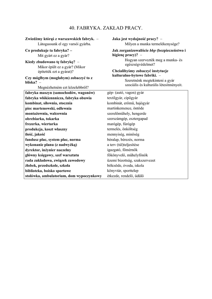 40. FABRYKA. ZAKŁAD PRACY. Zwiedźmy którąś z warszawskich fabryk. – Látogassunk el egy varsói gyárba. Jaka jest wydajność pracy? – Milyen a munka termelékenysége? Co produkuje ta fabryka? – Mit gyárt ez a gyár? Jak zorganizowaliście bhp (bezpieczeństwo i higienę pracy)? – Hogyan szervezték meg a munka- és egészségvédelmet? Kiedy zbudowano tę fabrykę? – Mikor épült ez a gyár? (Mikor építették ezt a gyárat)? Czy mógłbym (mogłabym) zobaczyć to z bliska? – Megnézhetném ezt közelebbről? fabryka maszyn (samochodów, wagonów) fabryka włókiennnicza, fabryka obuwia kombinat, siłownia, stocznia piec martenowski, odłewnia montażownia, walcownia obrebiarka, tokarka frezerka, wiertarka produkcja, koszt właszny ilość, jakość fundusz płac, system płac, norma wykonanie planu (z nadwyżką) dyrektor, inżynier naczelny główny księgowy, szef warsztatu rada zakładowa, związek zawodowy żłobek, przedszkole, szkoła biblioteka, boisko sportowe stołówka, ambulatorium, dom wypoczynkowy Chcialibyśmy zobaczyć instytucje kulturalno-bytowe fabriki. – Szeretnénk megtekinteni a gyár szociális és kulturális létesítményeit. gép- (autó, vagon) gyár textilgyár, cipőgyár kombinát, erőmű, hajógyár martinkemence, öntöde szerelőműhely, hengerde szerszámgép, esztergapad marógép, fúrógép termelés, önköltség mennyiség, minőség béralap, bérezés, norma a terv (túl)teljesítése igazgató, főmérnök főkönyvelő, műhelyfőnök üzemi bizottság, szakszervezet bölcsöde, óvoda, iskola könyvtár, sporttelep étkezde, rendelő, üdülő