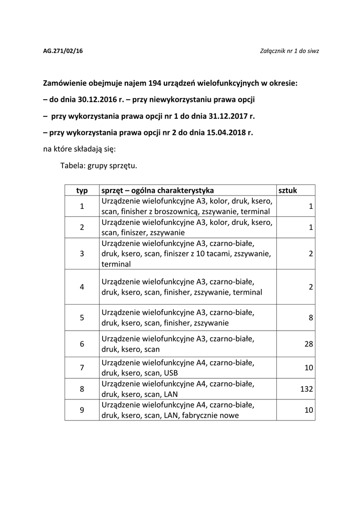 AG.271/02/16 Załącznik nr 1 do siwz Zamówienie obejmuje najem 194 urządzeń wielofunkcyjnych w okresie: – do dnia 30.12.2016 r. – przy niewykorzystaniu prawa opcji – przy wykorzystania prawa opcji nr 1 do dnia 31.12.2017 r. – przy wykorzystania prawa opcji nr 2 do dnia 15.04.2018 r. na które składają się: Tabela: grupy sprzętu. typ 1 2 3 sprzęt – ogólna charakterystyka sztuk Urządzenie wielofunkcyjne A3, kolor, druk, ksero, scan, finisher z broszownicą, zszywanie, terminal Urządzenie wielofunkcyjne A3, kolor, druk, ksero, scan, finiszer, zszywanie Urządzenie wielofunkcyjne A3, czarno-białe, druk, ksero, scan, finiszer z 10 tacami, zszywanie, terminal 1 1 2 4 Urządzenie wielofunkcyjne A3, czarno-białe, druk, ksero, scan, finisher, zszywanie, terminal 2 5 Urządzenie wielofunkcyjne A3, czarno-białe, druk, ksero, scan, finisher, zszywanie 8 6 Urządzenie wielofunkcyjne A3, czarno-białe, druk, ksero, scan 28 7 8 9 Urządzenie wielofunkcyjne A4, czarno-białe, druk, ksero, scan, USB Urządzenie wielofunkcyjne A4, czarno-białe, druk, ksero, scan, LAN Urządzenie wielofunkcyjne A4, czarno-białe, druk, ksero, scan, LAN, fabrycznie nowe 10 132 10 Oraz serwis kontraktowy drukarek Zamawiającego w terminach jw. pozycja sprzęt – ogólna charakterystyka 1 Samsung SCX-4729FD sztuk 25 Zszywki do urządzeń A3 w ilości 50 000 sztuk w opakowaniach po minimum 1000 sztuk. Opis przedmiotu zamówienia według Wspólnego Słownika Zamówień (CPV): NAZWA Drukarki laserowe Słownictwo główne – KOD 30232110-8 Przedmiot zamówienia obejmuje: a) najem sprzętu b) dostarczenie sprzętu transportem własnym na koszt i ryzyko Wykonawcy, c) rozładowanie i wniesienie sprzętu do siedzib Zamawiającego, d) podłączenie i konfigurację sprzętu w siedzibach Zamawiającego, e) przeszkolenie co najmniej 3 pracowników Zamawiającego w zakresie obsługi urządzeń i konfiguracji sterowników, f) serwis kontraktowy urządzeń będących własnością Zamawiającego. WYMAGANIA: 1. Oferowany przedmiot zamówienia musi spełnić wszystkie parametry ilościowe i jakościowe określone w niniejszej SIWZ. 2. Wykonawca może zaoferować sprzęt o parametrach lepszych lub równych niż określone w niniejszym załączniku. O ile inaczej nie zaznaczono, wszelkie zapisy „Opis minimalnych wymagań” należy odczytywać jako parametry minimalne. 3. Najmowany sprzęt wraz z serwisem kontraktowym oraz sprzęt objęty serwisem kontraktowym będący własnością Zamawiającego będzie używany przez niego w biurach terenowych na terenie całego województwa wielkopolskiego, statystycznie równo rozłożony, średnio po jednym urządzeniu w każdej gminie województwa. 4. Wykonawca zapewni pełną obsługę serwisowo-eksploatacyjną dostarczonych urządzeń wielofunkcyjnych w tym: przeglądy, regulacje, naprawy, wymiany uszkodzonych części i podzespołów, bezpłatne tonery i inne materiały eksploatacyjne (z wyjątkiem papieru i zszywek), dostawy i inne działania zapewniające prawidłowe funkcjonowanie oraz bezawaryjną pracę urządzeń. 5. Wykonawca zagwarantuje u Zamawiającego odpowiedni zapas tonerów w ilościach wynikających na podstawie zgłoszonego przez Zamawiającego zapotrzebowania. 6. Urządzenia czarno-białe A3 w grupach: 3, 4, 5 i 6 muszą obsługiwać ten sam typ tonera. 7. Rozpoczęcie naprawy urządzeń objętych niniejszym zamówieniem powinno nastąpić w czasie do 3 dni roboczych od otrzymania zgłoszenia (w Poznaniu) oraz w czasie do 5 dni roboczych (poza Poznaniem). W przypadku braku możliwości naprawy w ciągu 7 dni od zgłoszenia usterki Wykonawca dostarczy w miejsce pracy urządzenia uszkodzonego urządzenie zastępcze na czas naprawy pozwalające na wydruk, kopiowanie i skanowanie w formacie A4, pracujące w sieci komputerowej Ethernet, o identycznych kosztach wydruku strony jak w ofercie. 8. Zamawiający wymaga, aby wszystkie zaoferowane w postępowaniu przetargowym urządzenia pochodziły od jednego producenta i były tej samej marki. 9. Zamawiający wymaga, aby kolorowe ekrany dotykowe we wszystkich zaoferowanych urządzeniach wielofunkcyjnych formatu A3 (grupa 1-6), posiadały jednolity układ wyświetlanych komunikatów. 10. Zamawiający wymaga, aby wyświetlacze we wszystkich zaoferowanych urządzeniach wielofunkcyjnych formatu A4 (Typ 7-9), posiadały jednolity układ wyświetlanych komunikatów. 11. W ofercie należy podać producenta / model / typ oferowanego urządzenia. 12. Dostarczony sprzęt w grupie 9 musi być fabrycznie nowy. 13. Oprogramowanie Zamawiającego to produkty firmy Microsoft, tj. systemy operacyjne z rodziny Windows XP, Vista i 7. Wymaga się, aby dostarczony sprzęt posiadał sterowniki dla powyższych systemów operacyjnych. 14. Karty zbliżeniowe używane przez zamawiającego: Unique. Urządzenia drukujące muszą współpracować z podanym typem kart. 15. Ponadto, w ramach realizacji zamówienia Wykonawca będzie zobowiązany do przekazania Zamawiającemu szczegółowych instrukcji obsługi i konserwacji dla każdej właściwej jednostki dostarczonego sprzętu w dzierżawie oraz zapewnienia świadczenia serwisu w miejscach dostawy i instalacji sprzętu. 16. Z czynności odbioru przedmiotu zamówienia spisany będzie protokół odbioru, potwierdzający zgodność dostarczonego sprzętu z ofertą przetargową oraz poprawność działania sprzętu. 17. Protokół odbioru przedmiotu zamówienia podpisany przez upoważnionego przedstawiciela Zamawiającego i Wykonawcy będzie podstawą do wystawienia faktury. 18. Przyjmuje się datę dostawy jako datę bezusterkowego odbioru, potwierdzonego protokołem odbioru. 19. Wszystkie dostarczone sprzęty muszą zostać oznaczone nalepkami pozwalającymi zidentyfikować Wykonawcę. 20. Zamawiający posiada oprogramowanie do zarządzania drukiem firmy Printoscope. Wszystkie oferowane przez Wykonawcę urządzenia wielofunkcyjne muszą współpracować z posiadanym przez Zamawiającego oprogramow