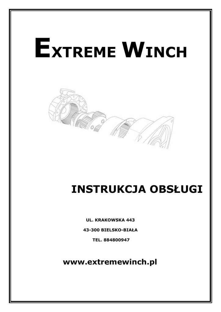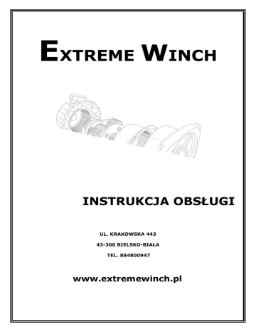 EXTREME WINCH INSTRUKCJA OBSŁUGI UL. KRAKOWSKA 443 43-300 BIELSKO-BIAŁA TEL. 884800947 www.extremewinch.pl KARTA GWARANCYJNA 1. Gwarantem jest firma PARTNER 2. Termin gwarancji wynosi 24 m-ce, licząc od daty zakupu na karcie gwarancyjnej sygnowanej pieczęcią firmową. 3. Klient zobowiązany jest dostarczyć wadliwy sprzęt do miejsca zakupu na własny koszt. 4. Sprzęt powinien być dostarczony do miejsca zakupu w oryginalnym opakowaniu. W przypadku braku kompletnego opakowania ryzyko uszkodzenia w trakcie transportu ponosi reklamujący. 5. Naprawy sprzętu w okresie gwarancyjnym wykonywane są przez Centralny Punkt Serwisowy lub inne upoważnione przez gwaranta autoryzowane punkty serwisowe. 6. W przypadku stwierdzenia, w okresie ważności gwarancji wady lub uszkodzenia sprzętu, zostanie ona bezpłatnie usunięta w ciągu 14 dni roboczych od daty dostarczenia sprzętu do CPU lub innego wskazanego miejsca przez gwaranta. 7. Warunkiem przyjęcia urządzenia do naprawy gwarancyjnej jest dostarczenie przez reklamującego: czytelnie i poprawnie wypełnionej karty gwarancyjnej dowodu zakupu (paragon / faktura) reklamowanego towaru (bez akcesoriów) z nienaruszonymi plombami Punkt serwisowy może odmówić wykonania naprawy gwarancyjnej w przypadku stwierdzenia niezgodności danych w dokumentach i na sprzęcie, naruszenia plomb lub zmiany/naprawy dokonane przez osoby nieupoważnione. 7. Gwarancja nie obejmuje sprzętu : uszkodzonego przez czynniki zewnętrzne (uszkodzenia mechaniczne, zanieczyszczenia, zalania, zjawiska atmosferyczne). zmienionego lub użytkowanego niezgodnie z przeznaczeniem uszkodzonego na skutek niewłaściwego użytkowania lub nieprawidłowej instalacji. gwarancja nie obejmuje baterii i akumulatorów jeśli urządzenia takie posiadają 8. W przypadku nieuzasadnionej reklamacji (po stwierdzeniu prawidłowego działania sprzętu przez sprzedawcę lub punkt serwisowy) Klient pokrywa koszty sprawdzenia sprzętu oraz koszty transportu urządzenia do i od punktu serwisowego. 9. Produkty przeznaczone do montażu podlegają gwarancji tylko i wyłącznie pod warunkiem zamontowania ich w specjalistycznych serwisach lub zakładach usługowych wytyczonych lub uzgodniony przez sprzedawcę 10. Naprawa może ulec przedłużeniu z powodu braku dostępności części do 30 dni – o tym fakcie Klient zostanie poinformowany telefonicznie lub mailowo Oświadczam, że zapoznałem/am się i akceptuje warunki zawarte w umowie gwarancyjnej dołączonej do instrukcji obsługi ................................... czytelny podpis kupującego Data zakupu Nazwa/typ Pieczątka sklepu , podpis sprzedawcy ADNOTACJE PUNKTU SERWISOWEGO www.extremewinch.pl PRZED ROZPOCZECIEM PRACY NALEŻY DOKŁADNIE ZAPOZNAĆ SIĘ Z INSTRUKCJĄ UWAGA: Proszę przestrzegać wszystkich zaleceń i wskazówek dla własnego bezpieczeństwa. Nieprzestrzeganie poniższych zasad może doprowadzić do poważnych szkód. ZASADY BEZPIECZEŃSTWA 1. Należy zawsze zakładać odpowiednie ubranie robocze. Podczas pracy należy zdjąć wszelkiego rodzaju biżuterię. Długie włosy należy schować pod odpowiednim nakryciem głowy. 2. Podczas pracy zawsze należy stosować rękawice ochronne. Nigdy nie należy dotykać liny stalowej gołymi rekami, gdyż grozi to pokaleczeniem rąk. 3. Zalecane jest stosowanie butów z antypoślizgową podeszwą. 4. W przypadku wyciągarek z liną stalową, bezwzględnie konieczne jest zabezpieczenie ludzi oraz otoczenia przed możliwym zerwaniem liny lub wyrwaniem jej z miejsca zamocowania. 5. Zawsze należy zachować bezpieczny odstęp podczas pracy urządzenia. Zabrania się stania w pobliżu promienia rażenia liny w przypadku jej zerwania (zalecamy odległość 1,5 razy większą, niż długość wyciągniętej z bębna liny) 6. Nie wolno stawać lub przechodzić pod naprężoną lina. 7. Wszystkie osoby niezwiązane z pracą wyciągarki należy trzymać z daleka. 8. Podczas pracy należy zwracać uwagę na własną stabilność 9. Pamiętaj, że urywająca lina może spowodować poważne obrażenia a nawet śmierć! 10. Liny stalowej należy używać tylko do celów zgodnych z przeznaczeniem. Nie wolno przemieszczać urządzenia ciągnąc je za linę. W przypadku rozwijania liny na bębnie zawsze trzeba pozostawić 5 zwojów liny. 11. Przy nawijaniu liny zawsze należy pracować w skórzanych rękawicach. Aby prawidłowo nawinąć linę należy obciążyć ją przy użyciu ręki. Jedną ręką należy trzymać linę, a drugą pilota sterującego. Nawijanie należy rozpocząć w jak największej odległości od wyciągarki, w wypośrodkowanym ustawieniu, następnie włączyć urządzenie i rozpocząć nawijanie obciążonej ręką liny stalowej. Czynność tę należy wykonywać powoli i w pełni pod kontrolą. Lina nie powinna wyślizgiwać się z ręki, nie zbliżać się za mocno do urządzenia. Wyłączyć wyciągarkę i czynność powtarzać tak długo, aż do nawinięcia pozostanie 1 metr liny. Następnie należy wyłączyć urządzenie, a nawijanie dokończyć manualnie. Podczas manualnego nawijania bieg w wyciągarce powinien być zwolniony. Jeśli bęben znajduje się w obudowie należy nawijać resztę liny przy włączonym urządzeniu. Użycie rąk jest tu zakazane. 12. Nie doprowadzać do nadmiernej pracy wyciągarki. W przypadku, gdy silnik będzie gorący należy natychmiast przerwać pracę i poczekać do jego ochłodzenia. Jeśli silnik się przepalił należy natychmiast odłączyć urządzenie od źródła prądu. 13. Nie przekraczać maksymalnej siły nośnej. 14. Unikać niepożądanego włączenia. Bieg wyciągarki powinien być zawsze zwolniony, kiedy urządzenie nie jest używane. Należy też wyłączyć wyłącznik główny. W czasie pracy bieg powinien być w pełni zaciągnięty. 15. Przed użyciem należy dokładnie sprawdzić wyciągarkę, czy nie ma uszkodzeń. Jeśli zostaną stwierdzone uszkodzenia należy skontaktować się z serwisem. 16. Zaleca się podłącza
