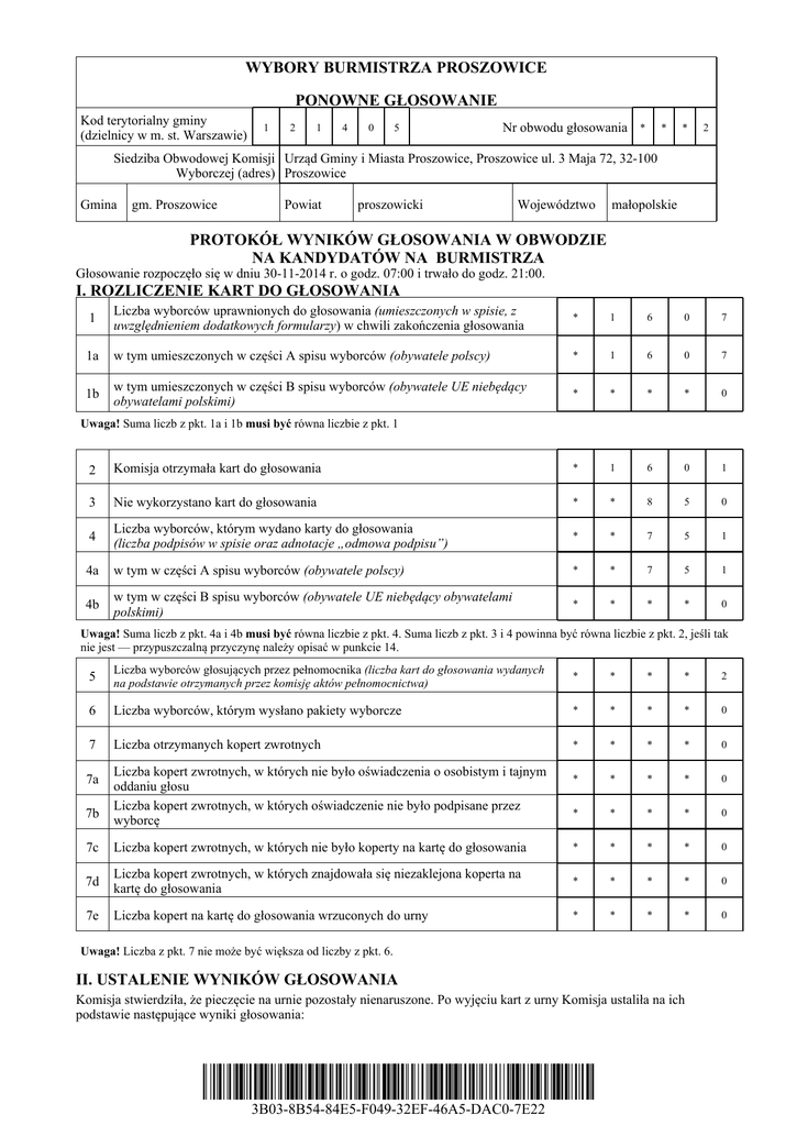 WYBORY BURMISTRZA PROSZOWICE PONOWNE GŁOSOWANIE Kod terytorialny gminy (dzielnicy w m. st. Warszawie) 1 2 1 4 0 5 Nr obwodu głosowania * * * 2 Siedziba Obwodowej Komisji Urząd Gminy i Miasta Proszowice, Proszowice ul. 3 Maja 72, 32-100 Wyborczej (adres) Proszowice Gmina gm. Proszowice Powiat proszowicki Województwo małopolskie PROTOKÓŁ WYNIKÓW GŁOSOWANIA W OBWODZIE NA KANDYDATÓW NA BURMISTRZA Głosowanie rozpoczęło się w dniu 30-11-2014 r. o godz. 07:00 i trwało do godz. 21:00. I. ROZLICZENIE KART DO GŁOSOWANIA 1 Liczba wyborców uprawnionych do głosowania (umieszczonych w spisie, z uwzględnieniem dodatkowych formularzy) w chwili zakończenia głosowania * 1 6 0 7 1a w tym umieszczonych w części A spisu wyborców (obywatele polscy) * 1 6 0 7 1b w tym umieszczonych w części B spisu wyborców (obywatele UE niebędący obywatelami polskimi) * * * * 0 Uwaga! Suma liczb z pkt. 1a i 1b musi być równa liczbie z pkt. 1 2 Komisja otrzymała kart do głosowania * 1 6 0 1 3 Nie wykorzystano kart do głosowania * * 8 5 0 4 Liczba wyborców, którym wydano karty do głosowania (liczba podpisów w spisie oraz adnotacje „odmowa podpisu”) * * 7 5 1 4a w tym w części A spisu wyborców (obywatele polscy) * * 7 5 1 4b w tym w części B spisu wyborców (obywatele UE niebędący obywatelami polskimi) * * * * 0 Uwaga! Suma liczb z pkt. 4a i 4b musi być równa liczbie z pkt. 4. Suma liczb z pkt. 3 i 4 powinna być równa liczbie z pkt. 2, jeśli tak nie jest — przypuszczalną przyczynę należy opisać w punkcie 14. 5 Liczba wyborców głosujących przez pełnomocnika (liczba kart do głosowania wydanych na podstawie otrzymanych przez komisję aktów pełnomocnictwa) * * * * 2 6 Liczba wyborców, którym wysłano pakiety wyborcze * * * * 0 7 Liczba otrzymanych kopert zwrotnych * * * * 0 * * * * 0 * * * * 0 7a 7b Liczba kopert zwrotnych, w których nie było oświadczenia o osobistym i tajnym oddaniu głosu Liczba kopert zwrotnych, w których oświadczenie nie było podpisane przez wyborcę 7c Liczba kopert zwrotnych, w których nie było koperty na kartę do głosowania * * * * 0 7d Liczba kopert zwrotnych, w których znajdowała się niezaklejona koperta na kartę do głosowania * * * * 0 7e Liczba kopert na kartę do głosowania wrzuconych do urny * * * * 0 Uwaga! Liczba z pkt. 7 nie może być większa od liczby z pkt. 6. II. USTALENIE WYNIKÓW GŁOSOWANIA Komisja stwierdziła, że pieczęcie na urnie pozostały nienaruszone. Po wyjęciu kart z urny Komisja ustaliła na ich podstawie następujące wyniki głosowania: 3B03-8B54-84E5-F049-32EF-46A5-DAC0-7E22 8 Liczba kart wyjętych z urny 8a w tym liczba kart wyjętych z kopert na karty do głosowania * * 7 5 1 * * * * 0 Uwaga! Liczba z pkt. 8 pomniejszona o liczbę z pkt. 8a powinna być równa liczbie z pkt. 4. Dodatkowo liczba z pkt. 8a nie może być większa od liczby z pkt. 7e; jeśli tak nie jest — przypuszczalną przyczynę należy opisać w punkcie 15. Liczba kart nieważnych (innych niż urzędowo ustalone lub nieopatrzonych 9 pieczęcią obwodowej komisji wyborczej) 10 Liczba kart ważnych * * * * 0 * * 7 5 1 * * * * 6 Uwaga! Suma liczb z pkt. 9 i 10 musi być równa liczbie z pkt. 8. Jeśli w pkt. 9 liczba jest większa niż 0, przyczynę należy opisać w pkt. 16. 11 Liczba głosów nieważnych (z kart ważnych) 11a w tym liczba głosów nieważnych z powodu postawienia znaku „X” obok nazwiska dwóch kandydatów * * * * 2 11b w tym liczba głosów nieważnych z powodu niepostawienia znaku „X” obok nazwiska żadnego kandydata * * * * 4 * * 7 4 5 Uwaga! Suma liczb z pkt 11a. i 11b. musi być równa lub mniejsza od liczby z pkt 11. Liczba głosów ważnych oddanych łącznie na wszystkich kandydatów 12 (z kart ważnych) Uwaga! 13. Lp. Suma liczb z pkt. 11 i 12 musi być równa liczbie z pkt. 10. Na poszczególnych kandydatów na wójta, burmistrza, prezydenta miasta *) oddano następujące liczby głosów ważnych: Nazwisko i imię - imiona Zgłoszony przez Komitet Wyborczy Liczba głosów ważnych 1. CICHY Grzegorz Rafał zgłoszony przez KWW KPR Razem * * 3 9 3 2. TOMASIK Jacek Andrzej zgłoszony przez KWW Wspólny Samorząd * * 3 5 2 * * 7 4 5 Razem Uwaga! Suma głosów oddanych na wszystkich kandydatów (rubryka „Razem”) i głosów nieważnych (pkt 11) musi być równa liczbie z pkt 10, czyli liczbie kart ważnych. 3B03-8B54-84E5-F049-32EF-46A5-DAC0-7E22 III. UWAGI I ADNOTACJE 14. **) Uwagi o przypuszczalnej przyczynie ewentualnej różnicy pomiędzy sumą liczb z pkt. 3 i 4 a liczbą z pkt. 2; jeżeli różnica nie występuje, wpisać „brak uwag”: Brak uwag. 15. **) Uwagi o przypuszczalnej przyczynie ewentualnej różnicy pomiędzy liczbą z pkt. 8 pomniejszoną o liczbę z pkt 8 a a liczbą z pkt. 4; jeżeli różnica nie występuje, wpisać „brak uwag”: brak uwag 16. **) Uwagi o przypuszczalnej przyczynie wystąpienia kart nieważnych (pkt. 9); jeżeli liczba w pkt. 9 wynosi 0, wpisać „brak uwag”: brak uwag 17. **) W trakcie głosowania wydano następujące zarządzenia; jeżeli nie wydano, wpisać „brak zarządzeń”: brak zarządzeń 18. **) Adnotacja o wniesieniu przez mężów zaufania uwag z wymienieniem konkretnych zarzutów ***); jeżeli nie ma, wpisać „brak zarzutów” lub „brak mężów zaufania w obwodzie”: BYło dwóch mężów zaufania - nie wnieśli uwag. 19. **) Adnotacja o wniesieniu przez członków Komisji uwag z wymienieniem konkretnych zarzutów ***); jeżeli nie ma, wpisać „brak zarzutów”: brak zarzutów 20. **) Inne uwagi; jeżeli nie ma, wpisać „brak uwag”: brak uwag Przy sporządzeniu protokołu obecni byli członkowie Komisji: 1. Cikała Władysława - PRZEWODNICZĄCY …………………………………… 2. Anioł Joanna Maria - ZASTĘPCA …………………………………… 3. Szymkiewicz Agata Małgorzata - CZŁONEK …………………………………… 4. Sierant Stanisław Julian - CZŁONEK ……………………