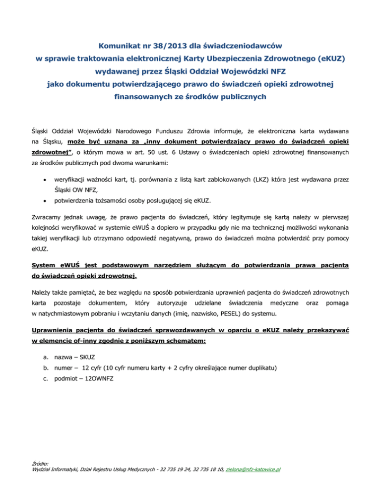 Komunikat nr 38/2013 dla świadczeniodawców w sprawie traktowania elektronicznej Karty Ubezpieczenia Zdrowotnego (eKUZ) wydawanej przez Śląski Oddział Wojewódzki NFZ jako dokumentu potwierdzającego prawo do świadczeń opieki zdrowotnej finansowanych ze środków publicznych Śląski Oddział Wojewódzki Narodowego Funduszu Zdrowia informuje, że elektroniczna karta wydawana na Śląsku, może być uznana za „inny dokument potwierdzający prawo do świadczeń opieki zdrowotnej”, o którym mowa w art. 50 ust. 6 Ustawy o świadczeniach opieki zdrowotnej finansowanych ze środków publicznych pod dwoma warunkami: weryfikacji ważności kart, tj. porównania z listą kart zablokowanych (LKZ) która jest wydawana przez Śląski OW NFZ, potwierdzenia tożsamości osoby posługującej się eKUZ. Zwracamy jednak uwagę, że prawo pacjenta do świadczeń, który legitymuje się kartą należy w pierwszej kolejności weryfikować w systemie eWUŚ a dopiero w przypadku gdy nie ma technicznej możliwości wykonania takiej weryfikacji lub otrzymano odpowiedź negatywną, prawo do świadczeń można potwierdzić przy pomocy eKUZ. System eWUŚ jest podstawowym narzędziem służącym do potwierdzania prawa pacjenta do świadczeń opieki zdrowotnej. Należy także pamiętać, że bez względu na sposób potwierdzania uprawnień pacjenta do świadczeń zdrowotnych karta pozostaje dokumentem, który autoryzuje udzielane świadczenia medyczne oraz pomaga w natychmiastowym pobraniu i wczytaniu danych (imię, nazwisko, PESEL) do systemu. Uprawnienia pacjenta do świadczeń sprawozdawanych w oparciu o eKUZ należy przekazywać w elemencie of-inny zgodnie z poniższym schematem: a. nazwa – SKUZ b. numer – 12 cyfr (10 cyfr numeru karty + 2 cyfry określające numer duplikatu) c. podmiot – 12OWNFZ Źródło: Wydział Informatyki, Dział Rejestru Usług Medycznych - 32 735 19 24, 32 735 18 10, [email protected]