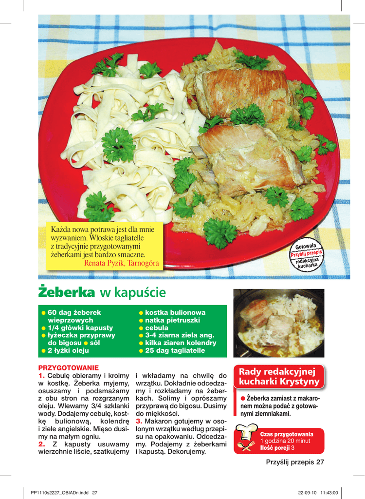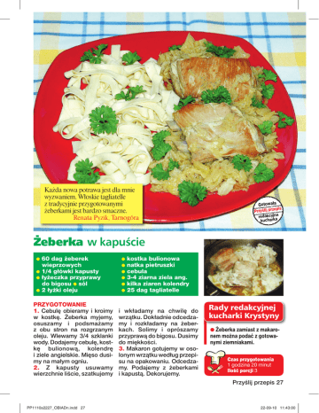 Każda nowa potrawa jest dla mnie wyzwaniem. Włoskie tagliatelle z tradycyjnie przygotowanymi żeberkami jest bardzo smaczne. Renata Pyzik, Tarnogóra Gotowała pis Przyślij prze redakcyjna kucharka Żeberka w kapuście 60 dag żeberek wieprzowych ● 1/4 główki kapusty ● łyżeczka przyprawy do bigosu ● sól ● 2 łyżki oleju ● PRZYGOTOWANIE 1. Cebulę obieramy i kroimy w kostkę. Żeberka myjemy, osuszamy i podsmażamy z obu stron na rozgrzanym oleju. Wlewamy 3/4 szklanki wody. Dodajemy cebulę, kostkę bulionową, kolendrę i ziele angielskie. Mięso dusimy na małym ogniu. 2. Z kapusty usuwamy wierzchnie liście, szatkujemy ● ● ● ● ● ● kostka bulionowa natka pietruszki cebula 3-4 ziarna ziela ang. kilka ziaren kolendry 25 dag tagliatelle i wkładamy na chwilę do wrzątku. Dokładnie odcedzamy i rozkładamy na żeberkach. Solimy i oprószamy przyprawą do bigosu. Dusimy do miękkości. 3. Makaron gotujemy w osolonym wrzątku według przepisu na opakowaniu. Odcedzamy. Podajemy z żeberkami i kapustą. Dekorujemy. Rady redakcyjnej kucharki Krystyny ● Żeberka zamiast z makaro- nem można podać z gotowanymi ziemniakami. Czas przygotowania 1 godzina 20 minut Ilość porcji 3 Przyślij przepis 27 PP1110s2227_OBIADn.indd 27 22-09-10 11:43:00
