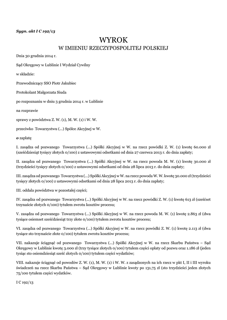 Sygn. akt I C 192/13 WYROK W IMIENIU RZECZYPOSPOLITEJ POLSKIEJ Dnia 30 grudnia 2014 r. Sąd Okręgowy w Lublinie I Wydział Cywilny w składzie: Przewodniczący SSO Piotr Jakubiec Protokolant Małgorzata Siuda po rozpoznaniu w dniu 3 grudnia 2014 r. w Lublinie na rozprawie sprawy z powództwa Z. W. (1), M. W. (1) i W. W. przeciwko Towarzystwu (...) Spółce Akcyjnej w W. o zapłatę I. zasądza od pozwanego Towarzystwa (...) Spółki Akcyjnej w W. na rzecz powódki Z. W. (1) kwotę 60.000 zł (sześćdziesiąt tysięcy złotych 0/100) z ustawowymi odsetkami od dnia 27 czerwca 2013 r. do dnia zapłaty; II. zasądza od pozwanego Towarzystwa (...) Spółki Akcyjnej w W. na rzecz powoda M. W. (1) kwotę 30.000 zł (trzydzieści tysięcy złotych 0/100) z ustawowymi odsetkami od dnia 28 lipca 2013 r. do dnia zapłaty; III. zasądza od pozwanego Towarzystwa (...) Spółki Akcyjnej w W. na rzecz powoda W. W. kwotę 30.000 zł (trzydzieści tysięcy złotych 0/100) z ustawowymi odsetkami od dnia 28 lipca 2013 r. do dnia zapłaty; III. oddala powództwa w pozostałej części; IV. zasądza od pozwanego Towarzystwa (...) Spółki Akcyjnej w W. na rzecz powódki Z. W. (1) kwotę 613 zł (sześćset trzynaście złotych 0/100) tytułem zwrotu kosztów procesu; V. zasądza od pozwanego Towarzystwa (...) Spółki Akcyjnej w W. na rzecz powoda M. W. (1) kwotę 2.863 zł (dwa tysiące osiemset sześćdziesiąt trzy złote 0/100) tytułem zwrotu kosztów procesu; VI. zasądza od pozwanego Towarzystwa (...) Spółki Akcyjnej w W. na rzecz powódki Z. W. (1) kwotę 2.113 zł (dwa tysiące sto trzynaście złote 0/100) tytułem zwrotu kosztów procesu; VII. nakazuje ściągnąć od pozwanego Towarzystwa (...) Spółki Akcyjnej w W. na rzecz Skarbu Państwa – Sąd Okręgowy w Lublinie kwotę 3.000 zł (trzy tysiące złotych 0/100) tytułem części opłaty od pozwu oraz 1.186 zł (jeden tysiąc sto osiemdziesiąt sześć złotych 0/100) tytułem części wydatków; VIII. nakazuje ściągnąć od powodów Z. W. (1), M. W. (1) i W. W. z zasądzonych na ich rzecz w pkt I, II i III wyroku świadczeń na rzecz Skarbu Państwa – Sąd Okręgowy w Lublinie kwoty po 131,75 zł (sto trzydzieści jeden złotych 75/100 tytułem części wydatków. I C 192/13 UZASADNIENIE Pozwem z dnia 19 lutego 2013 roku (data wpływu) skierowanym przeciwko Towarzystwu (...) Spółce Akcyjnej z siedzibą w W. powodowie Z. W. (1), M. W. (1) i W. W. wystąpili o zasądzenie od strony pozwanej na rzecz: • Z. W. (1) – kwoty 80.000,-zł, • M. W. (1) – kwoty 40.000,-zł, • W. W. – kwoty 40.000,-zł, wraz z ustawowymi odsetkami od dnia doręczenia pozwu pozwanemu do dnia zapłaty – tytułem zadośćuczynienia za krzywdę doznaną wskutek śmierci M. W. (2). Powodowie wnieśli również o zasądzenie od pozwanego na ich rzecz zwrotu kosztów procesu (petitum pozwu, k. 2-3). W uzasadnieniu pozwu powodowie podnieśli, że w dniu 8 sierpnia 2011 r. w miejscowości Ś. doszło do wypadku drogowego, w którym uczestniczyli jadący rowerem M. W. (2) oraz pojazd ciężarowy marki V. o nr rej. (...) wraz z naczepą, kierowany przez Z. W. (2). Do wypadku doszło w momencie, gdy pojazd ciężarowy wyprzedzał rowerzystę. Wskutek kontaktu pojazdów M. W. (2) został przewrócony, co doprowadziło do poniesienia przez niego obrażeń ciała, które spowodowały jego zgon. Wszczęte w sprawie postępowanie karne zostało ostatecznie umorzone. Wedle ustaleń organów ścigania sprawcą zdarzenia był kierujący rowerem – zmarły M. W. (2). Powodowie nie mogąc się zgodzić z wnioskami opinii biegłego w postępowaniu karnym, wywołali własną opinię celem ustalenia przyczyn zaistnienia wypadku. Z prywatnej opinii rzeczoznawcy P. S. wynika, że sprawcą wypadku był kierujący pojazdem ciężarowym. O takowym świadczą uszkodzenia roweru, którym poruszał się zmarły M. W. (2). Rower zmarłego posiada uszkodzenia wyłącznie w tylnej części - uszkodzony jest bagażnik i błotnik tylny, nie ma natomiast uszkodzeń części przedniej roweru, co winno mieć miejsce, gdyby rowerzysta skręcając najechał na naczepę pojazdu ciężarowego. Nadto do wypadku doszło na łuku drogi, czyli w miejscu, w którym kierujący pojazdem ciężarowym nie powinien podejmować manewru wyprzedzania. W ocenie powodów winę za zaistniałe zdarzenie ponosi zatem kierujący pojazdem ciężarowym. Zmarły M. W. (2) w chwili śmierci miał 84 lata. Był on dla rodziny ogromnym wsparciem – w szczególności dla swojej żony Z. W. (1). Pomimo podeszłego wieku był pracowitym i aktywnym życiowo mężczyzną. Powodowie bardzo mocno przeżyli jego śmierć. W szczególności niespodziewana i tragiczna śmierć męża odbiła się negatywnie na stanie zdrowia psychicznego powódki oraz wywołała ogromny wpływ na jej sytuację życiową, znacznie ją pogarszając. Powódka do dnia dzisiejszego nie może pogodzić się ze śmiercią męża, z którym wiązały ją bardzo silne i głębokie relacje. Podobnie zaistniałą sytuację przeżywają synowie zmarłego. Mogli oni liczyć na wsparcie ze strony swojego ojca, który był dla nich autorytetem, na jego cenną pomoc oraz poradę (uzasadnienie pozwu, k. 3-5). W odpowiedzi na pozew z dnia 26 lipca 2013 roku pozwany Towarzystwo (...) Spółka Akcyjna z siedzibą w W. wniósł o oddalenie powództwa w całości oraz zasądzenia na jego rzecz kosztów procesu według norm przepisanych. W uzasadnieniu odpowiedzi na pozew pozwany podniósł, że w związku ze zgłoszeniem przez powodów roszczeń odszkodowawczych pozwany przeprowadził szczegółowe postępowanie wyjaśniające, w wyniku którego odmówił przyjęcia odpowiedzialności za zgłoszone zdarzenie. W świetle wywołanej w toku postępowania przygotowawczego opinii biegłego z zakresu motoryzacji i ruchu drogowego bezpośrednią przyczyną wypadku drogowego był podjęty przez kierującego rowerem – M. W. (2), manewr skrętu w lewo. Nieprawidłowo