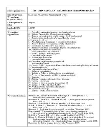 Nazwa przedmiotu: HISTORIA KOŚCIOŁA – STARO YTNA I