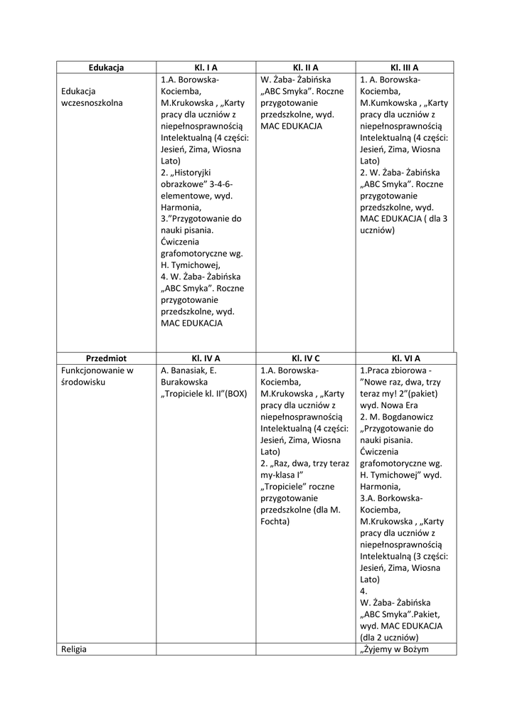 Edukacja Edukacja wczesnoszkolna Przedmiot Funkcjonowanie w środowisku Religia Kl. I A 1.A. BorowskaKociemba, M.Krukowska , „Karty pracy dla uczniów z niepełnosprawnością Intelektualną (4 części: Jesień, Zima, Wiosna Lato) 2. „Historyjki obrazkowe” 3-4-6elementowe, wyd. Harmonia, 3.”Przygotowanie do nauki pisania. Ćwiczenia grafomotoryczne wg. H. Tymichowej, 4. W. Żaba- Żabińska „ABC Smyka”. Roczne przygotowanie przedszkolne, wyd. MAC EDUKACJA Kl. II A W. Żaba- Żabińska „ABC Smyka”. Roczne przygotowanie przedszkolne, wyd. MAC EDUKACJA Kl. III A 1. A. BorowskaKociemba, M.Kumkowska , „Karty pracy dla uczniów z niepełnosprawnością Intelektualną (4 części: Jesień, Zima, Wiosna Lato) 2. W. Żaba- Żabińska „ABC Smyka”. Roczne przygotowanie przedszkolne, wyd. MAC EDUKACJA ( dla 3 uczniów) Kl. IV A A. Banasiak, E. Burakowska „Tropiciele kl. II”(BOX) Kl. IV C 1.A. BorowskaKociemba, M.Krukowska , „Karty pracy dla uczniów z niepełnosprawnością Intelektualną (4 części: Jesień, Zima, Wiosna Lato) 2. „Raz, dwa, trzy teraz my-klasa I” „Tropiciele” roczne przygotowanie przedszkolne (dla M. Fochta) Kl. VI A 1.Praca zbiorowa ”Nowe raz, dwa, trzy teraz my! 2”(pakiet) wyd. Nowa Era 2. M. Bogdanowicz „Przygotowanie do nauki pisania. Ćwiczenia grafomotoryczne wg. H. Tymichowej” wyd. Harmonia, 3.A. BorkowskaKociemba, M.Krukowska , „Karty pracy dla uczniów z niepełnosprawnością Intelektualną (3 części: Jesień, Zima, Wiosna Lato) 4. W. Żaba- Żabińska „ABC Smyka”.Pakiet, wyd. MAC EDUKACJA (dla 2 uczniów) „Żyjemy w Bożym świecie” podręcznik do nauki religii kl.I Logopedia 1. B. Blok, B. Brzeska, Z. Marszałek „Uczę się rozumieć innych. Mówienie i myślenie” wyd. Harmonia 2. B. Blok, B. Brzeska, Z. Marszałek„Uczę się rozumieć innych. Emocje i gesty” wyd. Harmonia, 3. B. Blok, B. Brzeska, Z. Marszałek„Uczę się rozumieć innych. Patrzenie i wskazywanie” wyd. Harmonia. 1. J. Mikulska „Posłuchaj, pokaż, odpowiedz. Część 1,” wyd. WIR 2. A. TorańskaSzyfelbein „Posłuchaj, pokaż, odpowiedz. Część 2” wyd. Harmonia 3. M. Bryła, A. Muszyńska „Wędrówka języczka podróżniczka w świat mowy” + płyta CD. Wyd. Harmonia 1. B. Sawicka „Dźwięczna czy bezdźwięczna. Cz.I. Wyrazy i cz. II Zdania. Wyd. Harmonia 2. J. Góral-Półrola, S. Zakrzewska „Będę mówić poprawnie z. 1 – 4” wyd: MAC EDUKACJA,