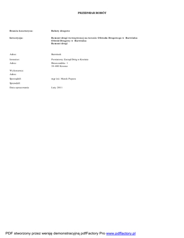 PRZEDMIAR ROBÓT B ran ż a k os z torys u : Roboty drogowe In we stycja: Re m on t drogi we wn ę trz n e j n a te re n i e O bwodu Drogowe go w B arwi n k u O bwód Drogowy w B arwi n k u Re m on t drogi Adres: Barwinek Inwestor: P owiatowy Zarząd Dróg w Krośnie Adres: Bieszczadzka 1 38-400 Krosno Wykonawca: Adres: Sporządził: mgr inż. Marek Pepera Sprawdził: Data opracowania Luty 2011 PDF stworzony przez wersję demonstracyjną pdfFactory Pro www.pdffactory.pl Lp Kod O pi s, l ok al i z acja i wyl i cz e n i a Jm . Il ości sk ł adowe Raz e m 1 2 3 4 5 6 1 45100000- 8 C PV D-M-00.00.00 RO B O TY PRZYGO TO W AW C ZE 1.1 KNNR 1 01110200 D-01.00.00 Roboty pomiarowe przy liniowych robotach ziemnych (drogi). T rasa dróg w terenie pagórkowatym lub górskim km 0,2 km 1.2 KNNR 6 08020400 D-01.00.00 Mechaniczne rozebranie nawierzchni z mas mineralno-bitumicznych o grubości 4 cm m2 5,0*160,0 m2 1.3 KNNR 6 08010200 D-01.00.00 Mechaniczne rozebranie podbudowy z kruszywa o grubości 15 cm m2 5,0*160,0+(5,0+15,0)/2*20,0 m2 1.4 KNNR 6 08030400 D-01.00.00 Mechaniczne rozebranie nawierzchni z kostki brukowej na podsypce cementowo-piaskowej m2 (5,0+15,0)/2*20,0 m2 2 45233220- 7 C PV PO DB UDO W A 2.1 KNNR 6 01110200 D-04.05.00; D04.05.01 P odbudowy z gruntu stabilizowanego spoiwem Silment CQ25 w ilości ponad 25 kg na 1 m2,grubość warstwy po zagęszczeniu 30cm,wykonywane mieszarką do stabilizacji gruntu,doczepną m2 1200,0 m2 2.2 KNNR 6 01130600 D - 04.04.04 Górna warstwa podbudowy z kruszywa łamanego,grubość warstwy po zagęszczeniu 15 cm m2 1200,0 m2 2.3 KNKRB 6 1002- 0700 D-04.03.01 Skropienie bitumem nawierzchni drogowych (asfaltem) - skropienie górnej warstwy podbudowy m2 1200,0 m2 3 45233220- 7 C PV NAW IERZC HNIA 3.1 KNNR 6 03080303 D-05.03.05b Nawierzchnie z mieszanek mineralno-asfaltowych standard II,warstwa wiążąca,grubość warstwy po zagęszczeniu 6 cm.T ransport mieszanki samochodem samowyład.5-10t m2 4,0*160,0+(5,0+15,0)/2*20,0 m2 3.2 KNNR 6 03090203 D-05.03.05b Nawierzchnie z mieszanek mineralno-asfaltowych standard II,warstwa ścieralna,grub.warstwy po zagęszczeniu 4 cm.T ransport mieszanki samochodem samowyład.5-10 t m2 840,0 m2 Dolna warstwa jezdni przy nawierzchniach żwirowych,kruszywo rozścielane ręcznie,grubość warstwy po zagęszczeniu 15 cm m2 160,0*1,5*2 m2 3.3 KNNR 6 02020200 D-05.01.03 4 45233280- 5 C PV O ZNAKO W ANIE I URZĄDZENIA B RD 4.1 KNNR 6 07030200 D-07.05.01 Bariery ochronne stalowe jednostronne,masa 1 m barier 39,0 kg 4.2 KNNR 6 07020100 D-07.02.01 4.3 KNNR 6 07020500 D-07.02.01 160,0*2 0,200 0,200 800,000 800,000 1 000,000 1 000,000 200,000 200,000 1 200,000 1 200,000 1 200,000 1 200,000 1 200,000 1 200,000 840,000 840,000 840,000 840,000 480,000 480,000 m m P ionowe znaki drogowe,słupki z rur stalowych o średnicy 50 mm szt. 4 szt. P ionowe znaki drogowe,znaki zakazu,nakazu,ostrzegawcze i informacyjne o powierzchni ponad 0,3 m2 szt. 4 szt. PDF stworzony przez wersję demonstracyjną pdfFactory Pro www.pdffactory.pl 320,000 320,000 4,000 4,000 4,000 4,000