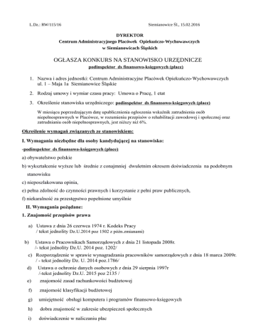 L.Dz.: RW/115/16 Siemianowice Śl., 15.02.2016 DYREKTOR Centrum Administracyjnego Placówek Opiekuńczo-Wychowawczych w Siemianowicach Śląskich OGŁASZA KONKURS NA STANOWISKO URZĘDNICZE podinspektor ds finansowo-księgowych (płace) 1. Nazwa i adres jednostki: Centrum Administracyjne Placówek Opiekuńczo-Wychowawczych ul. 1 – Maja 1a Siemianowice Śląskie 2. Rodzaj umowy i wymiar czasu pracy: Umowa o Pracę, 1 etat 3. Określenie stanowiska urzędniczego: podinspektor ds finansowo-księgowych (płace) W miesiącu poprzedzającym datę upublicznienia ogłoszenia wskaźnik zatrudnienia osób niepełnosprawnych w Placówce, w rozumieniu przepisów o rehabilitacji zawodowej i społecznej oraz zatrudnianiu osób niepełnosprawnych, jest niższy niż 6%. Określenie wymagań związanych ze stanowiskiem: I. Wymagania niezbędne dla osoby kandydującej na stanowisko: -podinspektor ds finansowo-księgowych (płace) a) obywatelstwo polskie b) wykształcenie wyższe lub średnie z conajmniej dwuletnim okresem doświadczenia na podobnym stanowisku c) nieposzlakowana opinia, e) pełna zdolność do czynności prawnych i korzystanie z pełni praw publicznych, f) niekaralność za przestępstwo popełnione umyślnie II. Wymagania pożądane: 1. Znajomość przepisów prawa a) Ustawa z dnia 26 czerwca 1974 r. Kodeks Pracy / tekst jednolity Dz.U.2014 poz 1502 z późn.zmianami) b) Ustawa o Pracownikach Samorządowych z dnia 21 listopada 2008r. /- tekst jednolity Dz.U. 2014 poz. 1202/ c) Rozporządzenie w sprawie wynagradzania pracowników samorządowych z dnia 18 marca 2009r. / - tekst jednolity Dz. U. 2014 poz.1786/ d) Ustawa o ochronie danych osobowych z dnia 29 sierpnia 1997r /-tekst jednolity Dz.U. 2015 poz 2135 / e) znajomość zasad rachunkowości budżetowej f) znajomość klasyfikacji budżetowej g) umiejętność obsługi komputera i programów finansowo-księgowych h) dobra znajomość w zakresie ubezpieczeń społecznych i) doświadczenie w naliczaniu płac i) umiejętność pracy w zespole j) obowiązkowość, dokładność, sumienność III. Zakres zadań na stanowisku: 1. Naliczanie i rozliczanie wynagrodzeń z umów o pracę oraz umów zleceń 2. Obsługa programu płacowego 3. Sporządzanie list płac 4. Sporządzanie zestawień płac dotyczących księgowań na kontach 5. Sporządzanie dokumentacji finansowej, deklaracji - rozliczenia z budżetem, ZUS, US i inne 6. Sporządzanie informacji i sprawozdawczości dotyczących zatrudnienia i płac dla GUS 7. Sporządzanie informacji sprawozdawczej dotyczącej PFRON 8. Obsługa programu Płatnik-terminowość przesyłania dokumentacji : - pracowników Centrum - wychowanków Centrum 9. Przygotowanie zestawień do sprawozdań finansowych 10. Prowadzenie dokumentacji i spraw związanych z ubezpieczeniem zdrowotnym wychowanków i pracowników. 11. Rozliczanie i sprawozdawczość z programów dostarczania żywności dla ubogich wg. potrzeb 12. Przygotowywanie dokumentów do zapłaty przelewem 13. Prowadzenie kasy Centrum i sporządzanie dokumentacji z tym związanej zgodnie z instrukcją kasową CAPOW. 14. Wykonywanie poleceń służbowych przełożonych IV. Wymagane dokumenty i oświadczenia 1. CV i list motywacyjny. 2. Kopie dokumentów potwierdzających posiadanie wymaganego wykształcenia, kopie dokumentów o ukończonych kursach podnoszących kwalifikacje. 3. Kopie dokumentów potwierdzających staż pracy, 4. Posiadane referencje, opinie o pracy wydane przez poprzednich pracodawców. 5. Oświadczenie, że kandydat ma pełną zdolność do czynności prawnych oraz korzysta z pełni praw publicznych, 6. Oświadczenie, że kandydat nie był prawomocnie skazany za przestępstwo przeciwko mieniu, przeciwko obrotowi gospodarczemu, przeciwko działalności instytucji państwowych oraz samorządu terytorialnego, przeciwko wiarygodności dokumentów lub za przestępstwo skarbowe. 7. Oświadczenie o wyrażeniu zgody na przetwarzanie danych osobowych zawartych w podaniu o pracę w zakresie niezbędnym do realizacji procesu rekrutacji - zgodnie z ustawą o ochronie danych osobowych /t.j. Dz.U. 2015 poz. 2135 / Wymagane dokumenty aplikacyjne należy składać osobiście w zamkniętej kopercie lub wysłać za pośrednictwem poczty listem poleconym. Koperta z ofertą powinna być opatrzona adnotacją : Nabór na wolne stanowisko: podinspektor ds finansowo-księgowych (płace) w Administracyjnym Placówek Opiekuńczo-Wychowawczych w Siemianowicach Śląskich” Centrum oraz swoim imieniem, nazwiskiem, adresem do korespondencji, numerem telefonu. Dokumenty należy dostarczyć w terminie do dnia 26.02.2016 (decyduje data stempla pocztowego nadania listu do Centrum Administracyjnego Placówek Opiekuńczo -Wychowawczych w Siemianowicach Śląskich) na adres: Centrum Administracyjne Placówek Opiekuńczo-Wychowawczych w Siemianowicach Śląskich 41–100 Siemianowice Śląskie, ul. 1 Maja 1a II piętro - sekretariat CAPOW Aplikacje, dostarczone do CAPOW lub nadane pocztą po wyżej wyznaczonym terminie nie będą rozpatrywane. Rozstrzygnięcie naboru nastąpi na zasadach określonych w ustawie o pracownikach samorządowych Etap I - sprawdzenie kompletności dokumentacji zawartej w ofercie i jej zgodności z pod względem formalnym z wymaganiami Etap II -test wiedzy i umiejętności praktycznych Etap III - rozmowa kwalifikacyjna. Kandydat wybrany w naborze będzie zobowiązany przedłożyć, najpóźniej w dniu zawarcia z nim umowy o pracę, oryginał zaświadczenia o braku prawomocnego skazania za przestępstwo umyślne, uzyskanego na swój koszt z Krajowego Rejestru Karnego. Oferty odrzucone w poszczególnych etapach rekrutacji zostaną komisyjnie zniszczone prosimy nie załączać oryginałów dokumentów do oferty pracy, a jedynie kserokopie. O terminie i miejscu Etapu II i III naboru zakwalifikowani kandydaci zostaną powiadomieni telefonicznie. Dyrektor CAPOW w Siemianowicach Śląskich mgr Katarzyna Stawik