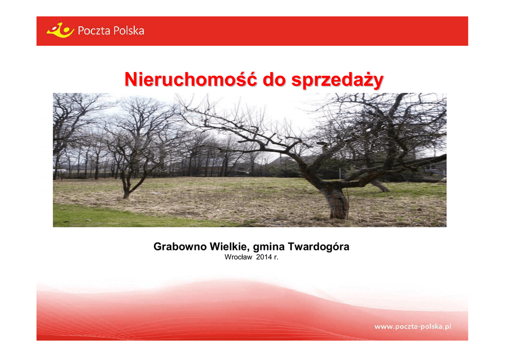 Nieruchomość do sprzedaży Grabowno Wielkie, gmina Twardogóra Wrocław 2014 r. Przedmiot sprzedaży: Prawo wieczystego użytkowania niezabudowanej działki oznaczonej w ewidencji gruntów numerem 322/7 obszaru 1656 m² położonej w miejscowości Grabowno Wielkie, gminie Twardogóra. Przewidywana cena wywoławcza: 38 000,00 zł netto Przewidywany termin przetargu: wrzesień 2014 r. Przedmiot sprzedaży: 3 Miejscowość Grabowno Wielkie, woj. dolnośląskie Gmina / Powiat Twardogóra / oleśnicki Działka ewidencyjna 322/7 obręb Grabowno Wielkie, obszar 1656 m² Księga wieczysta Sąd Rejonowy w Oleśnicy V Wydział Ksiąg Wieczystych KW Nr WR1E/00093108/9 Grabowno Wielkie Działka 322/7 Grunt Działka oznaczona numerem 322/7 to teren o kształcie nieregularnym zbliżonym to trójkąta, ogrodzona płytami żelbetowych prefabrykowanymi o wysokości 1 metra, z bezpośrednim dostępem do drogi wiejskiej o nawierzchni utwardzonej asfaltem, bez utwardzonych ciągów dla pieszych, oświetlonej. Nieruchomość niezabudowana, nieużytkowana, porośnięta trawą i chwastami oraz pojedyńczymi drzewami owocowymi bez wartości użytkowej. Na działce znajduje się słup energetyczny rozkraczny niskiego napięcia z lampa oświetleniową. Działka posiada dostęp do podstawowego uzbrojenia w sieci infrastruktury technicznej. Brak miejscowego planu zagospodarowania przestrzennego. W studium uwarunkowań i kierunków zagospodarowania przestrzennego Gminy Twardogóra działka stanowi teren usług sfery społecznej oraz tereny zabudowy mieszkaniowej o niskiej intensywności. Dostępność komunikacyjna Wieś położona w północno- wschodnim krańcu województwa dolnośląskiego w powiecie oleśnickim, gminie Twardogóra. Wieś graniczy z Twardogórą, Grabownem Małym, Dobroszycami, Białym Błotem i Bukowinką. Dojazd komunikacją publiczną do Grabowna Wielkiego zapewniają pociągi PKP kursujące między innymi z Kalisza, Krotoszyna, Ostrowa Wielkopolskiego i Wrocławia. Dojazd samochodem trasą E67 (S8) w stronę Sycowa. W Oleśnicy z S8 należy zjechać na DK340. Za Dobroszycami z tej trasy należy skręcić w prawo w lokalną drogę prowadzącą do Grabowna Wielkiego Otoczenie nieruchomości Nieruchomość położona w centralnej części wsi wśród zabudowy mieszkaniowej w bezpośrednim sąsiedztwie boiska szkolnego, szkoły i kościoła. Nieruchomość graniczy: • od strony południowej z drogą wiejską • od strony północnej z działką zabudowaną na której znajduje zabudowa jednorodzinna • od strony zachodniej z drogą publiczną dwukierunkową • od strony wschodniej z boiskiem szkolnym, szkołą Dane kontaktowe: Pion Infrastruktury ul. Ibn Siny Avicenny 21 50-900 Wrocław Andrzej Jurczyński - Tel. 71/ 360-39-71