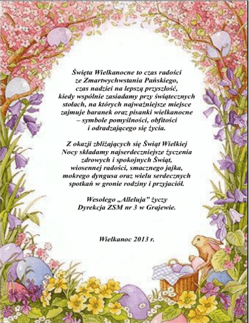 Święta Wielkanocne to czas radości ze Zmartwychwstania Pańskiego, czas nadziei na lepszą przyszłość, kiedy wspólnie zasiadamy przy świątecznych stołach, na których najważniejsze miejsce zajmuje baranek oraz pisanki wielkanocne – symbole pomyślności, obfitości i odradzającego się życia. Z okazji zbliżających się Świąt Wielkiej Nocy składamy najserdeczniejsze życzenia zdrowych i spokojnych Świąt, wiosennej radości, smacznego jajka, mokrego dyngusa oraz wielu serdecznych spotkań w gronie rodziny i przyjaciół. Wesołego „Alleluja” życzy Dyrekcja ZSM nr 3 w Grajewie. Wielkanoc 2013 r.