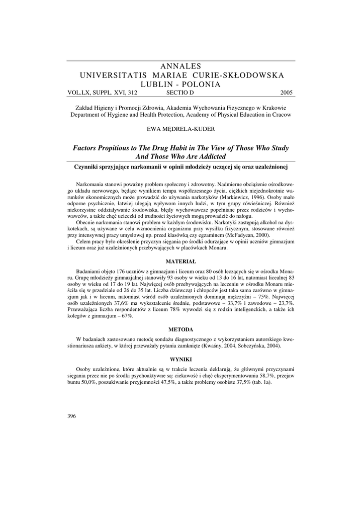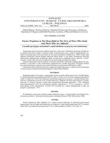 ANNALES UNIVERSITATIS MARIAE CURIE-SKŁODOWSKA LUBLIN - POLONIA VOL.LX, SUPPL. XVI, 312 SECTIO D 2005 Zakład Higieny i Promocji Zdrowia, Akademia Wychowania Fizycznego w Krakowie Department of Hygiene and Health Protection, Academy of Physical Education in Cracow EWA MĘDRELA-KUDER Factors Propitious to The Drug Habit in The View of Those Who Study And Those Who Are Addicted Czynniki sprzyjające narkomanii w opinii młodzieży uczącej się oraz uzależnionej Narkomania stanowi poważny problem społeczny i zdrowotny. Nadmierne obciążenie ośrodkowego układu nerwowego, będące wynikiem tempa współczesnego życia, ciężkich niejednokrotnie warunków ekonomicznych może prowadzić do używania narkotyków (Markiewicz, 1996). Osoby mało odporne psychicznie, łatwiej ulegają wpływom innych ludzi, w tym grupy rówieśniczej. Również niekorzystne oddziaływanie środowiska, błędy wychowawcze popełniane przez rodziców i wychowawców, a także chęć ucieczki od trudności życiowych mogą prowadzić do nałogu. Obecnie narkomania stanowi problem w każdym środowisku. Narkotyki zastępują alkohol na dyskotekach, są używane w celu wzmocnienia organizmu przy wysiłku fizycznym, stosowane również przy intensywnej pracy umysłowej np. przed klasówką czy egzaminem (McFadyean, 2000). Celem pracy było określenie przyczyn sięgania po środki odurzające w opinii uczniów gimnazjum i liceum oraz już uzależnionych przebywających w placówkach Monaru. MATERIAŁ Badaniami objęto 176 uczniów z gimnazjum i liceum oraz 80 osób leczących się w ośrodku Monaru. Grupę młodzieży gimnazjalnej stanowiły 93 osoby w wieku od 13 do 16 lat, natomiast licealnej 83 osoby w wieku od 17 do 19 lat. Najwięcej osób przebywających na leczeniu w ośrodku Monaru mieściła się w przedziale od 26 do 35 lat. Liczba dziewcząt i chłopców jest taka sama zarówno w gimnazjum jak i w liceum, natomiast wśród osób uzależnionych dominują mężczyźni – 75%. Najwięcej osób uzależnionych 37,6% ma wykształcenie średnie, podstawowe – 33,7% i zawodowe – 23,7%. Przeważająca liczba respondentów z liceum 78% wywodzi się z rodzin inteligenckich, a także ich kolegów z gimnazjum – 67%. METODA W badaniach zastosowano metodę sondażu diagnostycznego z wykorzystaniem autorskiego kwestionariusza ankiety, w której przeważały pytania zamknięte (Kwaśny, 2004, Sobczyńska, 2004). WYNIKI Osoby uzależnione, które aktualnie są w trakcie leczenia deklarują, że głównymi przyczynami sięgania przez nie po środki psychoaktywne są: ciekawość i chęć eksperymentowania 58,7%, przejaw buntu 50,0%, poszukiwanie przyjemności 47,5%, a także problemy osobiste 37,5% (tab. 1a). 396 Tab. 1. Przyczyny sięgania po środki psychoaktywne w opinii ankietowanych osoby uzależnione Kategorie badawcze problemy osobiste sytuacja rodzinna problemy szkolne i zawodowe ciekawość lub eksperymentowanie presja rówieśników zlikwidowanie nudy poszukiwanie przyjemności przejaw buntu obniżenie lęku lub dodanie sobie odwagi zlikwidowanie smutku i przygnębienia samotność odczuwanie pustki w życiu brak podania powodu inne Mężczyźni 36,6 20,0 15,0 65,0 18,3 35,0 55,0 50,0 25,0 35,0 23,3 21,6 5,0 13,3 Kobiety 40,0 35,0 10,0 40,0 5,0 5,0 25,0 50,0 25,0 35,0 20,0 30,0 10,0 5,0 Ogółem 37,5 23,7 13,7 58,7 15,0 27,5 47,5 50,0 25,0 35,0 22,5 23,7 6,2 11,2 uczniowie Kategorie badawcze nie sięgają sytuacje stresowe impreza problemy w szkole problemy w domu dla przyjemności Gimnazjum dziewczęta chłopcy 76,7 62,0 0,0 2,0 9,3 14,0 2,3 2,0 2,3 0,0 9,4 20,0 Liceum dziewczęta chłopcy 78,6 78,0 0,0 2,4 9,5 7,3 4,8 0,0 2,4 0,0 4,7 12,3 Znaczny odsetek 35% respondentów stwierdza, że likwidowanie smutku i przygnębienia również stanowi ważny problem, który powoduje, że zażywali wtedy narkotyki. Niepokojący jest fakt, że 38% uczniów gimnazjum sięga po narkotyki, a odsetek ten w liceum jest mniejszy i wynosi 22% (tab. 1b). W grupie tej uzależnienie od tych środków deklaruje 10% chłopców z gimnazjum i 1,2% młodzieży z liceum (ryc. 3). Jako główne przyczyny tego zjawiska uczniowie podają: poszukiwanie przyjemności 20% chłopców gimnazjum i 12,3% chłopców liceum, a także imprezy młodzieżowe 14% chłopców z gimnazjum i 9,5% dziewcząt z liceum. Problemy w domu 2,4% lub w szkole 4,8% też stanowią powód aby zdecydować się na narkotyki (tab. 1b). Ryc. 1. Źródło wiedzy o konsekwencjach używania narkotyków (osoby uzależnione) rodzice ogółem kobiety mężczyźni media własne doświadczenie koledzy szkoła 0 10 20 30 40 50 60 % 70 397 Ryc. 2. Osoby, które omawiają problem uzależnień w szkole liceum chłopcy liceum dziewczęta gimnazjum chłopcy gimnazjum dziewczęta nie są omawiane inna osoba psycholog lekarz lub pielęgniarka wychowawca 0 10 20 30 40 50 60 % 70 Osoby uzależnione przebywające w placówkach Monaru podają, że głównym źródłem wiedzy o konsekwencjach stosowania narkotyków byli ich koledzy 61,2%, a w dalszej kolejności media 47,5% (ryc. 1). W szkole zagadnienia te poruszano stosunkowo rzadko 17,5% (ryc. 1). Nieznaczny odsetek 12,2% uczniów szkół stwierdza, że problemy te nie są omawiane w szkołach. Ponad 60% uczniów gimnazjum i liceum stwierdza, że najczęściej zagadnienia dotyczące szkodliwości środków psychoaktywnych omawiają wychowawcy, a także psycholodzy 48% (ryc. 2). Niepokojący jest fakt, że 72,5% ogółu uzależnionych uważa, że wiedza na temat narkomanii nie była wystarczająco rozpowszechniona w szkołach, do których respondenci uczęszczali. Ryc. 3. Skala narkomanii wśród uczniów 10 % 8 6 4 2 0 dziewczęta chłopcy ogółem dziewczęta gimnazjum chłopcy ogółem liceum OMÓWIENIE Uczniowie różnych typów szkół ogólnokształcących jako najczęstsze przyczyny skłaniające do przyjęcia środków psychoaktywnych podają ciekawość 62,7% oraz namowę kolegów (Hajduk i wsp., 2000). Nabycie narkotyków nie 