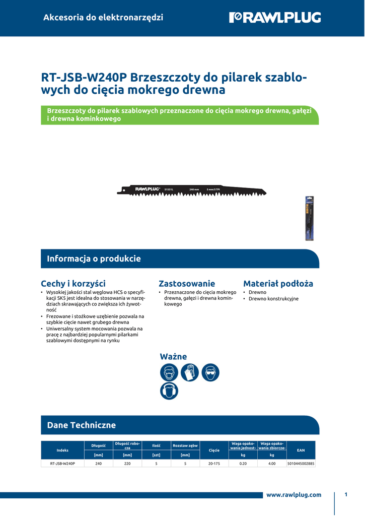 Akcesoria do elektronarzędzi RT-JSB-W240P Brzeszczoty do pilarek szablo wych do cięcia mokrego drewna Brzeszczoty do pilarek szablowych przeznaczone do cięcia mokrego drewna, gałęzi i drewna kominkowego S1531L 240 mm 5 mm/5 TPI Informacja o produkcie Cechy i korzyści Zastosowanie Materiał podłoża • Wysokiej jakości stal węglowa HCS o specyfi kacji SK5 jest idealna do stosowania w narzę dziach skrawających co zwiększa ich żywot ność • Frezowane i stożkowe uzębienie pozwala na szybkie cięcie nawet grubego drewna • Uniwersalny system mocowania pozwala na pracę z najbardziej popularnymi pilarkami szablowymi dostępnymi na rynku • Przeznaczone do cięcia mokrego drewna, gałęzi i drewna komin kowego • Drewno • Drewno konstrukcyjne Ważne Dane Techniczne Długość robo cza Ilość [mm] [mm] [szt] [mm] 240 220 5 5 Długość Indeks RT-JSB-W240P Rozstaw zębw Cięcie 20-175 Waga opako Waga opako wania jednost wania zbiorcze kg kg 0.20 4.00 EAN 5010445002885 www.rawlplug.com 1