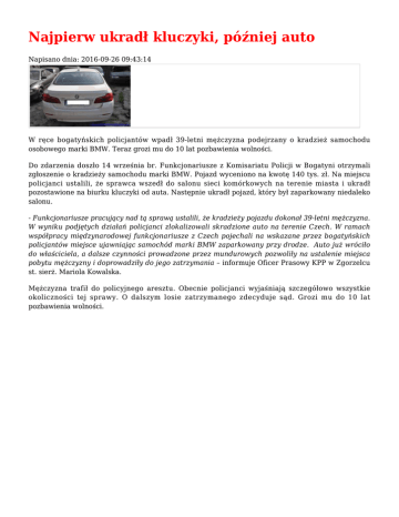 Najpierw ukradł kluczyki, później auto Napisano dnia: 2016-09-26 09:43:14 W ręce bogatyńskich policjantów wpadł 39-letni mężczyzna podejrzany o kradzież samochodu osobowego marki BMW. Teraz grozi mu do 10 lat pozbawienia wolności. Do zdarzenia doszło 14 września br. Funkcjonariusze z Komisariatu Policji w Bogatyni otrzymali zgłoszenie o kradzieży samochodu marki BMW. Pojazd wyceniono na kwotę 140 tys. zł. Na miejscu policjanci ustalili, że sprawca wszedł do salonu sieci komórkowych na terenie miasta i ukradł pozostawione na biurku kluczyki od auta. Następnie ukradł pojazd, który był zaparkowany niedaleko salonu. - Funkcjonariusze pracujący nad tą sprawą ustalili, że kradzieży pojazdu dokonał 39-letni mężczyzna. W wyniku podjętych działań policjanci zlokalizowali skradzione auto na terenie Czech. W ramach współpracy międzynarodowej funkcjonariusze z Czech pojechali na wskazane przez bogatyńskich policjantów miejsce ujawniając samochód marki BMW zaparkowany przy drodze. Auto już wróciło do właściciela, a dalsze czynności prowadzone przez mundurowych pozwoliły na ustalenie miejsca pobytu mężczyzny i doprowadziły do jego zatrzymania – informuje Oficer Prasowy KPP w Zgorzelcu st. sierż. Mariola Kowalska. Mężczyzna trafił do policyjnego aresztu. Obecnie policjanci wyjaśniają szczegółowo wszystkie okoliczności tej sprawy. O dalszym losie zatrzymanego zdecyduje sąd. Grozi mu do 10 lat pozbawienia wolności. Fot.: KPP Zgorzelec