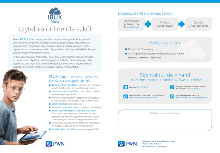 Dopasuj ofertę dla swojej szkoły: czytelnia online dla szkół Serwis IBUK Libra, należący do PWN, to wirtualna czytelnia, która pozwala stworzyć unikatową kolekcję książek online, dostosowaną do indywidualnych potrzeb szkoły. Księgozbiór liczy kilkanaście tysięcy tytułów, wydanych przez najważniejsze, renomowane polskie oficyny. Serwis udostępnia książki edukacyjne, popularnonaukowe i beletrystyczne. Dzięki zaawansowanej technologii i dostępowi online czytelnicy mogą korzystać z czytelni przez całą dobę, z dowolnego miejsca. Platforma umożliwia nie tylko czytanie książek, lecz także zaawansowaną pracę z tekstem. Z zasobów można korzystać za pomocą komputera, laptopa, tabletu czy smartfona. IBUK Libra – wiedza najwyższej jakości na wyciągnięcie ręki: dostęp online całą dobę z komputerów i większości urządzeń mobilnych, z terenu szkoły oraz z domu Obejrzyj listę publikacji na libra.ibuk.pl Wybierz pakiet książek Zamów u Reprezentanta Elastyczna oferta n Dostęp na 12 miesięcy n Cennik publikacji dostępny u Reprezentanta lub na www.wszpwn.com.pl/pl/ibuk Skontaktuj się z nami i uruchom czytelnię online w Twojej szkole: Zadzwoń 801 30 40 50 Zapytaj konsultanta online – napisz na Livechat: www.wszpwn.pl Napisz do nas – formularz kontaktowy na: www.wszpwn.com.pl/pl/kontakt/ Wyszukaj Reprezentanta na: www.wszpwn.com.pl/pl/reprezentanci s wobodny dobór tytułów z blisko 15 tys. publikacji renomowanych wydawnictw m inimum 5 jednoczesnych dostępów do danego tytułu (5 osób korzysta z danej książki w tym samym czasie) s zybki podgląd pełnych tekstów możliwość czytania w chmurze (własna półka książek) n owoczesne narzędzia do pracy z tekstem m.in. zaznaczanie fragmentów, tworzenie notatek, tagowanie, sprawdzanie zagadnień oraz treści książek z normatywnymi słownikami i encyklopediami PWN Twój Reprezentant Handlowy: p roste, łatwe i przyjemne dla użytkownika rozwiązanie, sprawdzone w edukacji na różnych poziomach w ysoka jakość serwisu gwarantowana przez PWN Wydawnictwo Szkolne PWN Sp. z o.o. infolinia: 801 30 40 50 www.wszpwn.pl www.pwn.pl