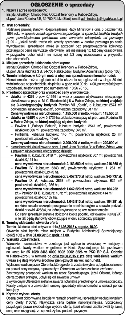 OGŁOSZENIE o sprzedaży 1. Nazwa i adres sprzedawcy: Instytut Gruźlicy i Chorób Płuc Oddział Terenowy w Rabce-Zdroju, ul. prof. Jana Rudnika 3 B, 34-700 Rabka-Zdrój, email: [email protected]. 2. Tryb sprzedaży: Podstawę prawną stanowi Rozporządzenie Rady Ministrów z dnia 5 października 1993 roku w sprawie zasad organizowania przetargu na sprzedaż środków trwałych przez przedsiębiorstwa państwowe oraz warunków odstąpienia od przetargu (§ 29 – „Jeżeli środki trwałe nie zostały sprzedane w drodze przetargu po cenie wywoławczej, sprzedawca może je sprzedać bez przeprowadzenia kolejnego przetargu po cenie najwyższej oferowanej, ale nie niższej niż 1/2 ceny oszacowania w przypadku ruchomości i nie niższej niż 2/3 ceny oszacowania w przypadku nieruchomości”). 3. Miejsce sprzedaży i składania ofert kupna: Instytut Gruźlicy i Chorób Płuc Oddział Terenowy w Rabce-Zdroju, ul. prof. Jana Rudnika 3 B, 34-700 Rabka-Zdrój, Budynek Administracji (pokój 103). 4. Termin i miejsce, w którym można obejrzeć sprzedawane nieruchomości: Nieruchomości można oglądać od dnia ukazania się ogłoszenia w ciągu 30 dni, w dni robocze od poniedziałku do piątku, w godz. od 8.00 do 14.00, po wcześniejszym uzgodnieniu telefonicznym pod numerem tel.: 18 26 76 155. 5. Przedmiot sprzedaży oraz wysokość ceny wywoławczej: · działka nr 4269 o pow. 0,1516 ha wraz z prawem użytkowania wieczystego, zlokalizowana przy ul. M. C. Skłodowskiej 6 w Rabce-Zdroju, na której znajduje się 3-kondygnacyjny budynek Pawilon VII „Korab”, o kubaturze: 2574 m3, powierzchni użytkowej: 452 m2, powierzchni zabudowy: 317 m2. Cena wywoławcza nieruchomości: 1.155.000 zł netto, wadium: 115.500 zł. · działka nr 4268/1 o pow. 0,1729 ha, zlokalizowana przy ul. prof. Jana Rudnika 3B w Rabce-Zdroju, na której znajdują się dwa budynki: - Pawilon I „Pałacyk Babuni”, kubatura budynku: 3547 m3, powierzchnia użytkowa: 686 m2, powierzchnia zabudowy: 373 m2, - Portiernia, kubatura budynku: 140 m3, powierzchnia użytkowa: 25 m2, powierzchnia zabudowy: 40 m2. Cena wywoławcza nieruchomości: 2.200.000 zł netto, wadium: 220.000 zł. · nieruchomości zlokalizowane przy ul. Prof. Jana Rudnika 3b w Rabce-Zdroju wraz z prawem użytkowania wieczystego działek: - Pawilon III, kubatura: 3418 m3, powierzchnia użytkowa: 807 m2, powierzchnia działki: 0,151 ha cena wywoławcza nieruchomości: 2.163.680 zł netto, wadium: 216.368 zł, - Pawilon IV, kubatura: 5343 m3, powierzchnia użytkowa: 1 261 m2, powierzchnia działki: 0,2473 ha cena wywoławcza nieruchomości: 3.457.370 zł netto, wadium: 345.737 zł, - Pawilon IX A, kubatura: 2868 m3, powierzchnia użytkowa: 624 m2, powierzchnia działki: 0,1366 ha cena wywoławcza nieruchomości: 1.642.220 zł netto, wadium: 164.222 zł, - Pawilon IX B, kubatura: 1872 m3, powierzchnia użytkowa: 414 m2, powierzchnia działki: 0,132 ha cena wywoławcza nieruchomości: 1.043.810 zł netto, wadium: 104.381 zł, na które zostało wszczęte postępowanie administracyjne w sprawie podziału działki nr ewid. 4268/4, na której usytuowane są ww. nieruchomości. Do ceny sprzedaży zostanie doliczona kwota podatku od towarów i usług VAT, o ile tak będą stanowiły obowiązujące w dniu sprzedaży przepisy. 6. Terminy składania i otwarcia ofert: Termin składania ofert upływa w dniu 31.08.2015 r. o godz. 10.00. Otwarcie ofert będzie miało miejsce w Budynku Administracji Sprzedającego (pokój 103) w dniu 31.08.2015 r. godz. 11.00. 7. Warunki uczestnictwa: Warunkiem uczestnictwa w przetargu jest wpłacenie określonej w niniejszym ogłoszeniu kwoty wadium w gotówce w Kasie Sprzedającego lub przelewem na konto Nr 25 1020 3466 0000 9302 0002 3226 w PKO BP S.A Oddział w Rabce-Zdroju w terminie do dnia 28.08.2015 r. (za datę wniesienia wadium uważa się datę wpływu środków pieniężnych na ww. rachunek). Wpłacone wadium przez Oferenta, którego oferta zostanie wybrana, będzie zaliczone na poczet ceny nabycia, a pozostałym Oferentom wadium zostanie zwrócone. Zastrzegamy przepadek wadium na rzecz Sprzedającego, jeżeli Oferent, którego oferta została przyjęta, uchyli się od zawarcia umowy. Z wyłonionym Oferentem zostanie zawarta notarialna przedwstępna umowa sprzedaży. Koszty związane z zawarciem umowy sprzedaży nieruchomości w całości ponosi kupujący. 8. Kryteria wyboru oferty. Ocena ofert dokonywana będzie w ramach przedmiotu sprzedaży według kryterium ceny oferty (100%). Najwyższa cena będzie najkorzystniejsza. Sprzedawcy przysługuje prawo swobodnego wyboru oferty, jeżeli oferenci zaofiarowali tę samą cenę oraz rezygnacja ze sprzedaży bez podania przyczyn.