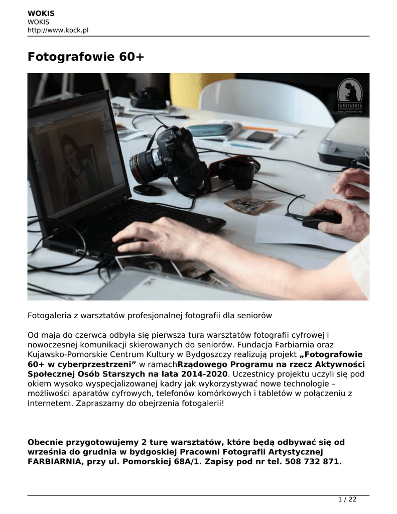 WOKIS WOKIS http://www.kpck.pl Fotografowie 60+ Fotogaleria z warsztatów profesjonalnej fotografii dla seniorów Od maja do czerwca odbyła się pierwsza tura warsztatów fotografii cyfrowej i nowoczesnej komunikacji skierowanych do seniorów. Fundacja Farbiarnia oraz Kujawsko-Pomorskie Centrum Kultury w Bydgoszczy realizują projekt „Fotografowie 60+ w cyberprzestrzeni” w ramachRządowego Programu na rzecz Aktywności Społecznej Osób Starszych na lata 2014-2020. Uczestnicy projektu uczyli się pod okiem wysoko wyspecjalizowanej kadry jak wykorzystywać nowe technologie – możliwości aparatów cyfrowych, telefonów komórkowych i tabletów w połączeniu z Internetem. Zapraszamy do obejrzenia fotogalerii! Obecnie przygotowujemy 2 turę warsztatów, które będą odbywać się od września do grudnia w bydgoskiej Pracowni Fotografii Artystycznej FARBIARNIA, przy ul. Pomorskiej 68A/1. Zapisy pod nr tel. 508 732 871. 1 / 22 WOKIS WOKIS http://www.kpck.pl Zajęcia są bezpłatne i odbywają się w nowoczesnym studio fotografii. Serdecznie zapraszamy wszystkich zainteresowanych! Koordynatorem projektu z ramienia Fundacji jest Katarzyna Gębarowska tel. 508 732 871 e-mail. [email protected] Koordynatorem projektu z ramienia Centrum jest Julian Waszak tel. 52 585 15 03 e-mail. [email protected] 2 / 22 WOKIS WOKIS http://www.kpck.pl 3 / 22 WOKIS WOKIS http://www.kpck.pl 4 / 22 WOKIS WOKIS http://www.kpck.pl 5 / 22 WOKIS WOKIS http://www.kpck.pl 6 / 22 WOKIS WOKIS http://www.kpck.pl 7 / 22 WOKIS WOKIS http://www.kpck.pl 8 / 22 WOKIS WOKIS http://www.kpck.pl 9 / 22 WOKIS WOKIS http://www.kpck.pl 10 / 22 WOKIS WOKIS http://www.kpck.pl 11 / 22 WOKIS WOKIS http://www.kpck.pl 12 / 22 WOKIS WOKIS http://www.kpck.pl 13 / 22 WOKIS WOKIS http://www.kpck.pl 14 / 22 WOKIS WOKIS http://www.kpck.pl 15 / 22 WOKIS WOKIS http://www.kpck.pl 16 / 22 WOKIS WOKIS http://www.kpck.pl 17 / 22 WOKIS WOKIS http://www.kpck.pl 18 / 22 WOKIS WOKIS http://www.kpck.pl 19 / 22 WOKIS WOKIS http://www.kpck.pl 20 / 22 WOKIS WOKIS http://www.kpck.pl 21 / 22 WOKIS WOKIS http://www.kpck.pl 22 / 22 Powered by TCPDF (www.tcpdf.org)