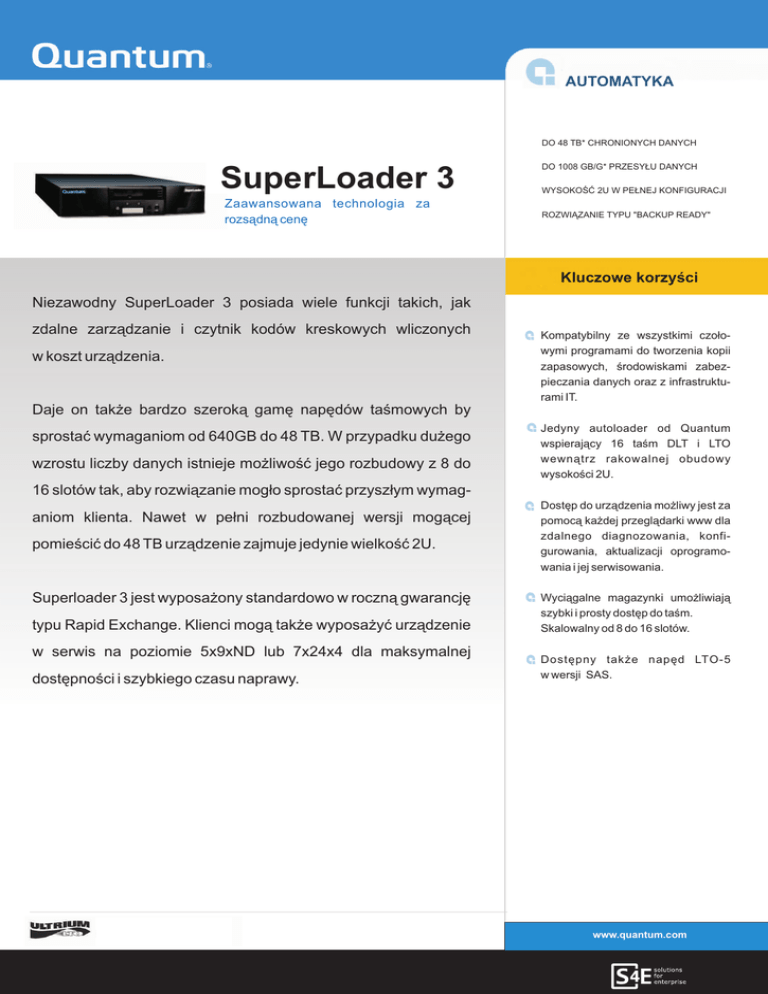 AUTOMATYKA DO 48 TB* CHRONIONYCH DANYCH SuperLoader 3 Zaawansowana technologia za rozs¹dn¹ cenê DO 1008 GB/G* PRZESY£U DANYCH WYSOKOŒÆ 2U W PE£NEJ KONFIGURACJI ROZWI¥ZANIE TYPU "BACKUP READY" Kluczowe korzyœci Niezawodny SuperLoader 3 posiada wiele funkcji takich, jak zdalne zarz¹dzanie i czytnik kodów kreskowych wliczonych w koszt urz¹dzenia. Kompatybilny ze wszystkimi czo³owymi programami do tworzenia kopii zapasowych, œrodowiskami zabezpieczania danych oraz z infrastrukturami IT. Daje on tak¿e bardzo szerok¹ gamê napêdów taœmowych by sprostaæ wymaganiom od 640GB do 48 TB. W przypadku du¿ego wzrostu liczby danych istnieje mo¿liwoœæ jego rozbudowy z 8 do Jedyny autoloader od Quantum wspieraj¹cy 16 taœm DLT i LTO wewn¹trz rakowalnej obudowy wysokoœci 2U. 16 slotów tak, aby rozwi¹zanie mog³o sprostaæ przysz³ym wymaganiom klienta. Nawet w pe³ni rozbudowanej wersji mog¹cej pomieœciæ do 48 TB urz¹dzenie zajmuje jedynie wielkoœæ 2U. Superloader 3 jest wyposa¿ony standardowo w roczn¹ gwarancjê typu Rapid Exchange. Klienci mog¹ tak¿e wyposa¿yæ urz¹dzenie w serwis na poziomie 5x9xND lub 7x24x4 dla maksymalnej dostêpnoœci i szybkiego czasu naprawy. Dostêp do urz¹dzenia mo¿liwy jest za pomoc¹ ka¿dej przegl¹darki www dla zdalnego diagnozowania, konfigurowania, aktualizacji oprogramowania i jej serwisowania. Wyci¹galne magazynki umo¿liwiaj¹ szybki i prosty dostêp do taœm. Skalowalny od 8 do 16 slotów. Dostêpny tak¿e napêd LTO-5 w wersji SAS. www.quantum.com SPECYFIKACJA TECHNICZNA SuperLoader 3 DZIA£ANIE POJEMNOŒÆ ORAZ WYDAJNOŒÆ NAPÊDÓW Typ napêdu Pojemnoœæ natywna/ z kompresj¹* (GB) DLT-V4 LTO-3HH SCSI LTO-3 nFC LTO-3HH SAS LT0-4 SCSI LTO-4HH SAS LTO-5 2,560 / 5,120 6,400 / 12,800 6,400 / 12,800 6,400 / 12,800 12,800 / 25,600 12,800 / 25,600 24,000 / 48,000 Wydajnoœæ natywna/ z kompresj¹* (GB/godz.) 36 / 72 245 / 324 288 / 576 245 / 490 432 / 864 432 / 864 504 / 1008 INTERFEJSY DLT-V4, LTO-2 HH: SDLT 600, DLT VS160: LTO-3: LTO-3HH: LTO-4: LTO-4HH: DLT-S4: LTO-5: Wymogi zasilania: Ultra 160 SCSI Ultra 160 SCSI 2Gb nFC Ultra 160 SCSI, 3Gb/s SAS Ultra 320 SCSI 3Gb/s SAS Ultra 320 SCSI, 4Gb nFC 6 Gb/s SAS Zarz¹dzanie: 10/100baseT Ethernet Dostêpne funkcje: Podgl¹d statusu systemu, Zdalne diagnozowanie, Dostêp do logów systemu, Konfiguracja, Update Firmware'u, Funkcjonalnoœci napêdów, Zdalne zarz¹dzanie, Aktualizacja zapasów o o Temperatury œrodowiska pracy: +10 C do +35 C Temperatura œrodowiska przechowywania: - 40o C do +65o C Maksymalna zmiennoœæ temperatur podczas pracy:10o C na godzinê Maksymalna zmiennoœæ temperatur przechowywania: 20o C na godzinê Wilgotnoœæ œrodowiska pracy 20% do 80% bez kondensacji Wilgotnoœæ œrodowiska przechowywania 10% do 90% bez kondensacji Stopieñ zmiennoœci wilgotnoœci œrodowiska: 10% na godzinê ZGODNOŒCI I CERTYFIKATY 400,000 <30 min 8 lub 16 Zintegrowane zarz¹dzanie poprzez przegl¹darki sieci www 90 to 256 VAC Bezpieczeñstwo: US (UL 1950) Kanada (CSA 22.2 No. 950) Europa (EN60950/IEC 950) EMI/RFI ECC Directive 89336 CD BS6527 (UK) EN 55022 (EU) EN 55024 (EU) CFR 47, 1995 FCC Rules Part 15B Class B (MDOC) IEC-003 Kanada V-3/97.04 VCCI Class B (Japonia) AS/NZS 3548 Australia/Nowa Zealandia (C-tick Mark) CNS 13438 BSMI Class A Tajwan * Zak³adana kompresja 2:1 WYMIARY FIZYCZNE (cm) Szerokoœæ: Wysokoœæ: D³ugoœæ: Ciê¿ar (kg): Pojedynczy frontowy slot na taœmy oraz mo¿liwoœæ za³adowania wszystkich taœm poprzez wyjmowane magazynki aktywne ŒRODOWISKO PRACY NIEZAWODNOŒÆ Wspó³czynnik MCBF: Wspó³czynnik MTTR: Iloœæ slotów: Zarz¹dzanie: Sposób ³adowania taœm: 42,42 8,66 69,85 14,06 Wiêcej Informacji na stronie www.s4e.pl S4E S.A. Ul. Biskupiñska 3B 30-732 Kraków Tel. +48 12 296 45 45