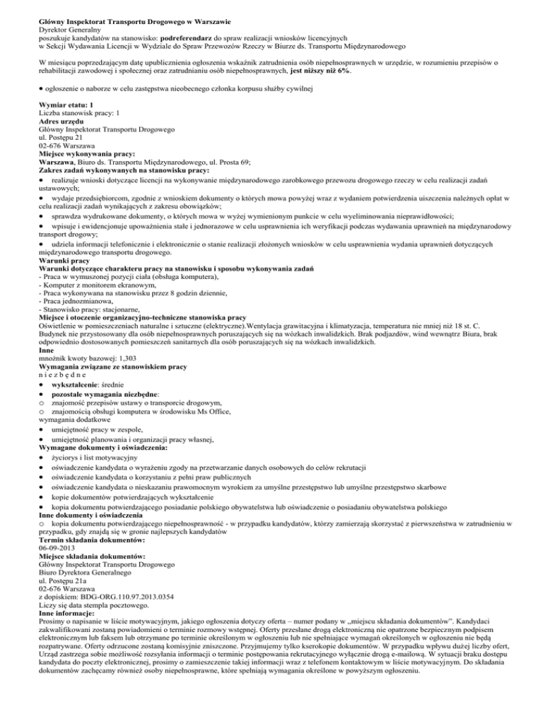 Główny Inspektorat Transportu Drogowego w Warszawie Dyrektor Generalny poszukuje kandydatów na stanowisko: podreferendarz do spraw realizacji wniosków licencyjnych w Sekcji Wydawania Licencji w Wydziale do Spraw Przewozów Rzeczy w Biurze ds. Transportu Międzynarodowego W miesiącu poprzedzającym datę upublicznienia ogłoszenia wskaźnik zatrudnienia osób niepełnosprawnych w urzędzie, w rozumieniu przepisów o rehabilitacji zawodowej i społecznej oraz zatrudnianiu osób niepełnosprawnych, jest niższy niż 6%. ogłoszenie o naborze w celu zastępstwa nieobecnego członka korpusu służby cywilnej Wymiar etatu: 1 Liczba stanowisk pracy: 1 Adres urzędu Główny Inspektorat Transportu Drogowego ul. Postępu 21 02-676 Warszawa Miejsce wykonywania pracy: Warszawa, Biuro ds. Transportu Międzynarodowego, ul. Prosta 69; Zakres zadań wykonywanych na stanowisku pracy: realizuje wnioski dotyczące licencji na wykonywanie międzynarodowego zarobkowego przewozu drogowego rzeczy w celu realizacji zadań ustawowych; wydaje przedsiębiorcom, zgodnie z wnioskiem dokumenty o których mowa powyżej wraz z wydaniem potwierdzenia uiszczenia należnych opłat w celu realizacji zadań wynikających z zakresu obowiązków; sprawdza wydrukowane dokumenty, o których mowa w wyżej wymienionym punkcie w celu wyeliminowania nieprawidłowości; wpisuje i ewidencjonuje upoważnienia stałe i jednorazowe w celu usprawnienia ich weryfikacji podczas wydawania uprawnień na międzynarodowy transport drogowy; udziela informacji telefonicznie i elektronicznie o stanie realizacji złożonych wniosków w celu usprawnienia wydania uprawnień dotyczących międzynarodowego transportu drogowego. Warunki pracy Warunki dotyczące charakteru pracy na stanowisku i sposobu wykonywania zadań - Praca w wymuszonej pozycji ciała (obsługa komputera), - Komputer z monitorem ekranowym, - Praca wykonywana na stanowisku przez 8 godzin dziennie, - Praca jednozmianowa, - Stanowisko pracy: stacjonarne, Miejsce i otoczenie organizacyjno-techniczne stanowiska pracy Oświetlenie w pomieszczeniach naturalne i sztuczne (elektryczne).Wentylacja grawitacyjna i klimatyzacja, temperatura nie mniej niż 18 st. C. Budynek nie przystosowany dla osób niepełnosprawnych poruszających się na wózkach inwalidzkich. Brak podjazdów, wind wewnątrz Biura, brak odpowiednio dostosowanych pomieszczeń sanitarnych dla osób poruszających się na wózkach inwalidzkich. Inne mnożnik kwoty bazowej: 1,303 Wymagania związane ze stanowiskiem pracy niezbędne wykształcenie: średnie pozostałe wymagania niezbędne: o znajomość przepisów ustawy o transporcie drogowym, o znajomością obsługi komputera w środowisku Ms Office, wymagania dodatkowe umiejętność pracy w zespole, umiejętność planowania i organizacji pracy własnej, Wymagane dokumenty i oświadczenia: życiorys i list motywacyjny oświadczenie kandydata o wyrażeniu zgody na przetwarzanie danych osobowych do celów rekrutacji oświadczenie kandydata o korzystaniu z pełni praw publicznych oświadczenie kandydata o nieskazaniu prawomocnym wyrokiem za umyślne przestępstwo lub umyślne przestępstwo skarbowe kopie dokumentów potwierdzających wykształcenie kopia dokumentu potwierdzającego posiadanie polskiego obywatelstwa lub oświadczenie o posiadaniu obywatelstwa polskiego Inne dokumenty i oświadczenia o kopia dokumentu potwierdzającego niepełnosprawność - w przypadku kandydatów, którzy zamierzają skorzystać z pierwszeństwa w zatrudnieniu w przypadku, gdy znajdą się w gronie najlepszych kandydatów Termin składania dokumentów: 06-09-2013 Miejsce składania dokumentów: Główny Inspektorat Transportu Drogowego Biuro Dyrektora Generalnego ul. Postępu 21a 02-676 Warszawa z dopiskiem: BDG-ORG.110.97.2013.0354 Liczy się data stempla pocztowego. Inne informacje: Prosimy o napisanie w liście motywacyjnym, jakiego ogłoszenia dotyczy oferta – numer podany w „miejscu składania dokumentów”. Kandydaci zakwalifikowani zostaną powiadomieni o terminie rozmowy wstępnej. Oferty przesłane drogą elektroniczną nie opatrzone bezpiecznym podpisem elektronicznym lub faksem lub otrzymane po terminie określonym w ogłoszeniu lub nie spełniające wymagań określonych w ogłoszeniu nie będą rozpatrywane. Oferty odrzucone zostaną komisyjnie zniszczone. Przyjmujemy tylko kserokopie dokumentów. W przypadku wpływu dużej liczby ofert, Urząd zastrzega sobie możliwość rozsyłania informacji o terminie postępowania rekrutacyjnego wyłącznie drogą e-mailową. W sytuacji braku dostępu kandydata do poczty elektronicznej, prosimy o zamieszczenie takiej informacji wraz z telefonem kontaktowym w liście motywacyjnym. Do składania dokumentów zachęcamy również osoby niepełnosprawne, które spełniają wymagania określone w powyższym ogłoszeniu.