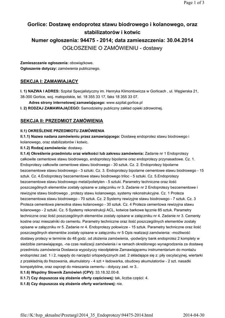 Page 1 of 3 Gorlice: Dostawę endoprotez stawu biodrowego i kolanowego, oraz stabilizatorów i kotwic Numer ogłoszenia: 94475 - 2014; data zamieszczenia: 30.04.2014 OGŁOSZENIE O ZAMÓWIENIU - dostawy Zamieszczanie ogłoszenia: obowiązkowe. Ogłoszenie dotyczy: zamówienia publicznego. SEKCJA I: ZAMAWIAJĄCY I. 1) NAZWA I ADRES: Szpital Specjalistyczny im. Henryka Klimontowicza w Gorlicach , ul. Węgierska 21, 38-300 Gorlice, woj. małopolskie, tel. 18 355 33 17, faks 18 355 33 07. Adres strony internetowej zamawiającego: www.szpital.gorlice.pl I. 2) RODZAJ ZAMAWIAJĄCEGO: Samodzielny publiczny zakład opieki zdrowotnej. SEKCJA II: PRZEDMIOT ZAMÓWIENIA II.1) OKREŚLENIE PRZEDMIOTU ZAMÓWIENIA II.1.1) Nazwa nadana zamówieniu przez zamawiającego: Dostawę endoprotez stawu biodrowego i kolanowego, oraz stabilizatorów i kotwic. II.1.2) Rodzaj zamówienia: dostawy. II.1.4) Określenie przedmiotu oraz wielkości lub zakresu zamówienia: Zadanie nr 1 Endoprotezy całkowite cementowe stawu biodrowego, endoprotezy bipolarne oraz endoprotezy przynasadowe. Cz. 1. Endoprotezy całkowite cementowe stawu biodrowego - 30 sztuk. Cz. 2. Endoprotezy bipolarne bezcementowe stawu biodrowego - 3 sztuki. Cz. 3. Endoprotezy bipolarne cementowe stawu biodrowego - 15 sztuk. Cz. 4.Endoprotezy bezcementowe stawu biodrowego triloc - 5 sztuki. Cz. 5.Endoprotezy bezcementowe stawu biodrowego metal/polietylen - 5 sztuki. Parametry techniczne oraz ilość poszczególnych elementów zostały opisane w załączniku nr 3. Zadanie nr 2 Endoprotezy bezcementowe i rewizyjne stawu biodrowego , protezy stawu kolanowego, systemy rekonstrukcyjne. Cz. 1 Proteza bezcementowa stawu biodrowego - 70 sztuk. Cz. 2 Systemy rewizyjne stawu biodrowego - 7 sztuk. Cz. 3 Proteza cementowa pierwotna stawu kolanowego - 30 sztuk. Cz. 4 Proteza cementowa rewizyjna stawu kolanowego - 2 sztuki. Cz. 5 Systemy rekonstrukcji ACL, kotwice barkowe łącznie 85 sztuk. Parametry techniczne oraz ilość poszczególnych elementów zostały opisane w załączniku nr 4. Zadanie nr 3. Cementy kostne oraz mieszalniki do cementu. Parametry techniczne oraz ilość poszczególnych elementów zostały opisane w załączniku nr 5. Zadanie nr 4. Endoprotezy połowicze - 15 sztuk. Parametry techniczne oraz ilość poszczególnych elementów zostały opisane w załączniku nr 5 Opis realizacji zamówienia: -możliwość dostawy protezy w terminie do 48 godz. od złożenia zamówienia, -podwójny bank endoprotez 2 komplety w siedzibie zamawiającego, -na czas realizacji zamówienia i w ramach określonego wynagrodzenia za dostawę przedmiotu zamówienia Dostawca wypożyczy nieodpłatnie Zamawiającemu instrumentarium do montażu endoprotez zad. 1 i 2, napędy do narzędzi ortopedycznych zad. 2 składające się z: piły oscylacyjnej, wiertarki z przekładnią do frezowania, akumulatory - 4 szt + ładowarka, obudowy akumulatorów - 2 szt. nasadki kompatybilne, oraz osprzęt do mieszania cementu - dotyczy zad. nr 3.. II.1.6) Wspólny Słownik Zamówień (CPV): 33.18.32.00-8. II.1.7) Czy dopuszcza się złożenie oferty częściowej: tak, liczba części: 4. II.1.8) Czy dopuszcza się złożenie oferty wariantowej: nie. file://K:\bzp_aktualne\Przetargi\2014_35_Endoprotezy\94475-2014.html 2014-04-30 Page 2 of 3 II.2) CZAS TRWANIA ZAMÓWIENIA LUB TERMIN WYKONANIA: Okres w miesiącach: 12. SEKCJA III: INFORMACJE O CHARAKTERZE PRAWNYM, EKONOMICZNYM, FINANSOWYM I TECHNICZNYM III.2) ZALICZKI III.4) INFORMACJA O OŚWIADCZENIACH LUB DOKUMENTACH, JAKIE MAJĄ DOSTARCZYĆ WYKONAWCY W CELU POTWIERDZENIA SPEŁNIANIA WARUNKÓW UDZIAŁU W POSTĘPOWANIU ORAZ NIEPODLEGANIA WYKLUCZENIU NA PODSTAWIE ART. 24 UST. 1 USTAWY III.4.1) W zakresie wykazania spełniania przez wykonawcę warunków, o których mowa w art. 22 ust. 1 ustawy, oprócz oświadczenia o spełnianiu warunków udziału w postępowaniu należy przedłożyć: III.4.2) W zakresie potwierdzenia niepodlegania wykluczeniu na podstawie art. 24 ust. 1 ustawy, należy przedłożyć: oświadczenie o braku podstaw do wykluczenia; aktualny odpis z właściwego rejestru lub z centralnej ewidencji i informacji o działalności gospodarczej, jeżeli odrębne przepisy wymagają wpisu do rejestru lub ewidencji, w celu wykazania braku podstaw do wykluczenia w oparciu o art. 24 ust. 1 pkt 2 ustawy, wystawiony nie wcześniej niż 6 miesięcy przed upływem terminu składania wniosków o dopuszczenie do udziału w postępowaniu o udzielenie zamówienia albo składania ofert; III.4.3) Dokumenty podmiotów zagranicznych Jeżeli wykonawca ma siedzibę lub miejsce zamieszkania poza terytorium Rzeczypospolitej Polskiej, przedkłada: III.4.3.1) dokument wystawiony w kraju, w którym ma siedzibę lub miejsce zamieszkania potwierdzający, że: nie otwarto jego likwidacji ani nie ogłoszono upadłości - wystawiony nie wcześniej niż 6 miesięcy przed upływem terminu składania wniosków o dopuszczenie do udziału w postępowaniu o udzielenie zamówienia albo składania ofert; III.4.3.2) zaświadczenie właściwego organu sądowego lub administracyjnego miejsca zamieszkania albo zamieszkania osoby, której dokumenty dotyczą, w zakresie określonym w art. 24 ust. 1 pkt 4-8 wystawione nie wcześniej niż 6 miesięcy przed upływem terminu składania wniosków o dopuszczenie do udziału w postępowaniu o udzielenie zamówienia albo składania ofert; III.4.4) Dokumenty dotyczące przynależności do tej samej grupy kapitałowej lista podmiotów należących do tej samej grupy kapitałowej w rozumieniu ustawy z dnia 16 lutego 2007 r. o ochronie konkurencji i konsumentów albo informacji o tym, że nie należy do grupy kapitałowej; III.5) INFORMACJA O DOKUMENTACH POTWIERDZAJĄCYCH, ŻE OFEROWANE DOSTAWY, USŁUGI LUB ROBOTY BUDOWLANE ODPOWIADAJĄ OKREŚLONYM WYMAGANIOM W zakresie potwierdzenia, że oferowane roboty budowlane, dostawy lub usługi odpowiadają określonym wymaganiom należy przedłożyć: file://K:\bzp_aktualne\Przetargi\2014_35_Endopro