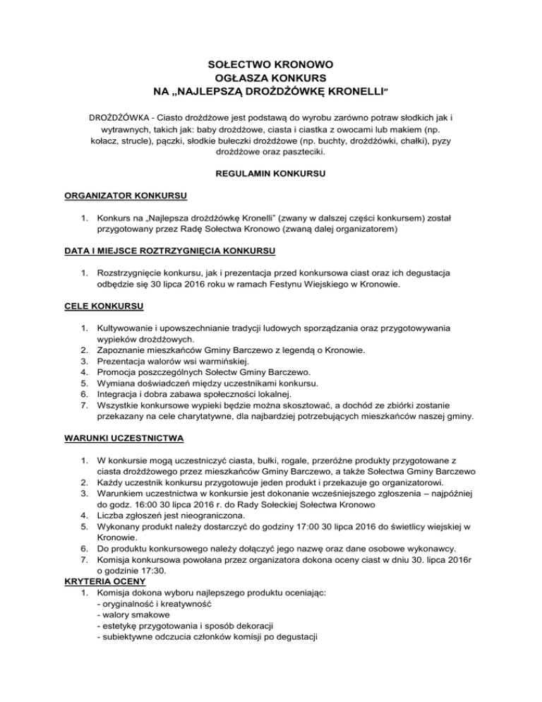SOŁECTWO KRONOWO OGŁASZA KONKURS NA „NAJLEPSZĄ DROŻDŻÓWKĘ KRONELLI” DROŻDŻÓWKA - Ciasto drożdżowe jest podstawą do wyrobu zarówno potraw słodkich jak i wytrawnych, takich jak: baby drożdżowe, ciasta i ciastka z owocami lub makiem (np. kołacz, strucle), pączki, słodkie bułeczki drożdżowe (np. buchty, drożdżówki, chałki), pyzy drożdżowe oraz paszteciki. REGULAMIN KONKURSU ORGANIZATOR KONKURSU 1. Konkurs na „Najlepsza drożdżówkę Kronelli” (zwany w dalszej części konkursem) został przygotowany przez Radę Sołectwa Kronowo (zwaną dalej organizatorem) DATA I MIEJSCE ROZTRZYGNIĘCIA KONKURSU 1. Rozstrzygnięcie konkursu, jak i prezentacja przed konkursowa ciast oraz ich degustacja odbędzie się 30 lipca 2016 roku w ramach Festynu Wiejskiego w Kronowie. CELE KONKURSU 1. Kultywowanie i upowszechnianie tradycji ludowych sporządzania oraz przygotowywania wypieków drożdżowych. 2. Zapoznanie mieszkańców Gminy Barczewo z legendą o Kronowie. 3. Prezentacja walorów wsi warmińskiej. 4. Promocja poszczególnych Sołectw Gminy Barczewo. 5. Wymiana doświadczeń między uczestnikami konkursu. 6. Integracja i dobra zabawa społeczności lokalnej. 7. Wszystkie konkursowe wypieki będzie można skosztować, a dochód ze zbiórki zostanie przekazany na cele charytatywne, dla najbardziej potrzebujących mieszkańców naszej gminy. WARUNKI UCZESTNICTWA 1. W konkursie mogą uczestniczyć ciasta, bułki, rogale, przeróżne produkty przygotowane z ciasta drożdżowego przez mieszkańców Gminy Barczewo, a także Sołectwa Gminy Barczewo 2. Każdy uczestnik konkursu przygotowuje jeden produkt i przekazuje go organizatorowi. 3. Warunkiem uczestnictwa w konkursie jest dokonanie wcześniejszego zgłoszenia – najpóźniej do godz. 16:00 30 lipca 2016 r. do Rady Sołeckiej Sołectwa Kronowo 4. Liczba zgłoszeń jest nieograniczona. 5. Wykonany produkt należy dostarczyć do godziny 17:00 30 lipca 2016 do świetlicy wiejskiej w Kronowie. 6. Do produktu konkursowego należy dołączyć jego nazwę oraz dane osobowe wykonawcy. 7. Komisja konkursowa powołana przez organizatora dokona oceny ciast w dniu 30. lipca 2016r o godzinie 17:30. KRYTERIA OCENY 1. Komisja dokona wyboru najlepszego produktu oceniając: - oryginalność i kreatywność - walory smakowe - estetykę przygotowania i sposób dekoracji - subiektywne odczucia członków komisji po degustacji Przyznając od 1 do 10 punktów. NAGRODY I WYRÓŻNIENIA 1. Komisja wybierze jednego zwycięzcę konkursu w kategorii – Sołectwa i Stowarzyszenia, oraz jednego zwycięzcę w kategorii – indywidualne. 2. Nagrody będą niespodzianką 3. Kolejne 2 osoby/sołectwa w poszczególnych kategoriach zostaną wyróżnoine. 4. Wszyscy uczestnicy dostaną dyplom uczestnictwa. 5. Najlepszy produkt dostanie zaszczytny tytuł :” Drożdżówki Kronelli roku 2016” 6. Zdjęcia wszystkich potraw biorących udział w konkursie zostaną opublikowane na profilu Sołectwa Kronowo. Każdy uczestnik konkursu wyraża na to zgodę. 7. Ogłoszenie wyników konkursu odbędzie się na festynie wiejskim w Kronowie 30 lipca 2016 roku o godzinie 18:30 INNE ISTOTNE INFORMACJE 1. Organizator zastrzega sobie prawo do zmian w regulaminie konkursu 2. Organizator zastrzega sobie prawo do odwołania konkursu bez podania przyczyny 3. Organizator zastrzega sobie prawo do publikowania imion, nazwisk, zdjęć i informacji o uczestnikach konkursu na portalach internetowych i w prasie lokalnej. 4. Poprzez przystąpienie do konkursu uczestnicy wyrażają zgodę na warunki zawarte w konkursie. 5. Regulamin konkursu będzie dostępny na portalu Sołectwa Kronowo na facebooku. 6. Niniejszy regulamin jest jedynym dokumentem określającym zasady konkursu. Rada Sołecka Sołectwa Kronowo Monika Chwietczuk Organizator Konkursu