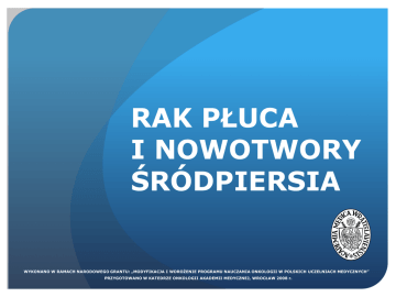 RAK PŁUCA I NOWOTWORY ŚRÓDPIERSIA WYKONANO W RAMACH NARODOWEGO GRANTU: „MODYFIKACJA I WDROŻENIE PROGRAMU NAUCZANIA ONKOLOGII W POLSKICH UCZELNIACH MEDYCZNYCH” PRZYGOTOWANO W KATEDRZE ONKOLOGII AKADEMII MEDYCZNEJ, WROCŁAW 2008 r. RAK PŁUCA: EPIDEMIOLOGIA Polska / rocznie Zachorowalność ~ 20 000 M ~ 16 000/ K ~ 4 000 Wskaźnik przeżyć 5-letnich < 10% Umieralność / zachorowalność w Polsce 1965-2004 w szystkie grupy w ieku 90 80 m ężczyźni/zgony 70 60 kobiety/zgony 50 m ężczyźni/zachor ow ania 40 30 kobiety/zachorow ania 20 10 0 1960 1970 1980 1990 2000 2010 * Wojciechowska i wsp. Nowotwory złośliwe w Polsce w 2004 roku, Warszawa 2006 RAK PŁUCA: ETIOLOGIA -Palenie tytoniu - 90% wszystkich zachorowań -Azbest -Chrom -Arsen -Krzemionka -Radon -Węglowodory aromatyczne -Promieniowanie jonizujące -Czynniki genetyczne RAK PŁUCA Zmniejszenie zachorowalności i umieralności w wielu krajach związane jest z ograniczeniem palenia tytoniu RAK PŁUCA: TYPY HISTOLOGICZNE 20% 80% DRP NDRP Niedrobnokomórkowy rak płuca (NDRP) 80% Rak płaskonabłonkowy Rak gruczołowy Rak wielkokomórkowy Inne rzadkie typy histologiczne 30% 35% 10% 5% Drobnokomórkowy rak płuca (DRP) 20% RAK PŁUCA: TYPY HISTOLOGICZNE (1) 1. Rak płaskonabłonkowy brodawkowy, jasnokomórkowy, drobnokomórkowy, bazaloidny 2. Rak anaplastyczny drobnokomórkowy mieszany 3. Rak gruczołowy: zrazikowy brodawkowy oskrzelikowo-pęcherzykowy lity, z produkcją śluzu mieszany + warianty: (wysokozróżnicowany płodowy , śluzowy, torbielowaty śluzowy, z komórek sygnetowatych, z komórek jasnych RAK PŁUCA: TYPY HISTOLOGICZNE (2) 4. Rak anaplastyczny wielokomórkowy + warianty: neuroendokrynny bazaloidny typu lymphoepithelioma z komórek jasnych rabdoidny 5. Rak mieszany (gruczołowo-płaskonabłonkowy) 6. Rakowiak (typowy i atypowy) 7. Raki gruczołów oskrzelowych (śluzowonaskórkowy, gruczołowo-torbielowaty i inne) 8. Inne typy RAK PŁUCA: STOPIEŃ ZAAWANSOWANIA LD I/II IV 25% 20% 40% 20% 20% 75% III A NDRP III B –I/II - 20% –III - 40% –IV - 40% ED DRP –LD - 25% –ED - 75% RAK PŁUCA: EPIDEMIOLOGIA Mediana wieku, rozpoznanie: 68 lat 50% 50% >65 r. ż. <65 r. ż. NDRP 60-70% 30-40% >70 r. ż. <70 r. ż. RAK PŁUCA: WYNIKI LECZENIA Późne rozpoznanie Pierwotne zaawansowanie III ~ 40% IV ~ 40% Zły stan sprawności Choroby współistniejące Wiek >65 r. ż. ~ 50% >70 r. ż. ~ 30-40% Ograniczona dostępność RTH Niewielki udział leczenia skojarzonego NDRP: WYNIKI LECZENIA 50 25 – 50% 40 30 20 10 5 – 15% 60 15 – 30% 70 60 – 75% 80 0 I II III R TNM III NR IV DRP: WYNIKI LECZENIA 40 30 25 20 15 - 25% 35 0-5% 15 10 5 0 LD ED RAK PŁUCA: POPRAWA WYNIKÓW LECZENIA Rozpoznanie i ustalenie stopnia zaawansowania Optymalna kwalifikacja chorych do leczenia na podstawie oceny stopnia zaawansowania, wydolności, chorób współistniejących Wykorzystanie badań obrazowych i procedur diagnostycznych TK/MRI/PET/USG Mediastinoskopia/wideotorakoskopia Właściwa kwalifikacja do leczenia chirurgicznego Postępowanie skojarzone ROZPOZNANIE: OBJAWY Objawy miejscowe Kaszel Duszność Krwioplucie Ból w klatce piersiowej Nawrotowe lub przedłużające się zapalenie płuc Chrypka Zaburzenia połykania Ból barku Objawy ogólne Bóle stawów Osłabienie ogólne Ubytek masy ciała Podwyższenie ciepłoty ciała Zaburzenie czucia powierzchownego Objawy zakrzepowego zapalenia żył Inne objawy zespołów paraneonowotworowych ROZPOZNANIE Objawy związane ze zwężeniem lub obturacją oskrzeli Powiększenie węzłów chłonnych Objawy płynu w jamie opłucnowej Objawy płynu w worku osierdziowym i naciekania mięśnia sercowego Objawy zespołu żyły głównej górnej Powiększenie wątroby Objawy paraneonowotworowe Objawy ze strony OUN i obwodowego układu nerwowego DIAGNOSTYKA RADIOLOGICZNA Konwencjonalna radiografia Obecność cienia krągłego Zmiana zarysu wnęki Zaburzenia powietrzności o charakterze zarówno rozedmy, jak i niedodmy Zmiany naciekowe ALGORYTM DIAGNOSTYCZNY Raki położone centralnie Rtg klp w dwóch projekcjach Niedodma, zmiany zapalne Poszerzony zarys wnęki/śródpiersia Bronchoskopia z biopsją TK z kontrastem Wynik (+) Leczenie Obecność guzapobranie materiału histologicznego Wynik + Leczenie Na podstawie:Jassem J, Krzakowski M., Nowotwory płuca i opłucnej. ALGORYTM DIAGNOSTYCZNY Raki położone obwodowo Pojedynczy guzek w Rtg klp. TK klp. Guzek>10mm lub wzmocnienie kontrastowe Guzek do 10 mm Kontrola za 4-6 m-cy Biopsja guzka Wzrost guzka Bez wzrostu Biopsja Kontrola: 12 m-cy Wzrost guzka Bez wzrostu Biopsja Obserwacja Jassem J, Krzakowski M., Nowotwory płuca i opłucnej. BADANIA DIAGNOSTYCZNE Badanie cytologiczne plwociny Badanie cytologiczne popłuczyn oskrzelowych Biopsja przez ścianę oskrzeli Badanie cytologiczne wysięku opłucnowego lub/i biopsja opłucnej Biopsja zmienionych węzłów chłonnych Mediastinoskopia Bronchofiberoskopia fluorescencyjna z biopsją Torakoskopia Biopsja ogniska przerzutowego Torakotomia (po wyczerpaniu wszystkich możliwości) NDRP: STADIUM OPERACYJNE Standardowe leczenie Zabieg chirurgiczny u chorych bez przeciwwskazań Radykalna RTH u chorych z przeciwwskazaniami do zabiegu chirurgicznego Uzupełniająca CTH oparta o DDP u wybranych chorych w stopniu II – IIIA Korzyści z CTH uzupełniającej u chorych w stopniu I ? NDRP: MIEJSCE CHIRURGII NDRP TK cN2 (+) Mediastinoskopia Mediastinotomia EBUS/EUS pN3 (+) RTH + niepCR CTH pN2 (+) CTH cN2 (-) Resekcja pN2 (-) pCR pN1, 2 CTH pooperacyjna pN (-) Obserwacja EBUS - przezskórna ultrasonografia EUS - przezprzełykowa ultrasonografia Na podstawie:Jassem J, Krzakowski M., Nowotwory płuca i opłucnej. ZASADY LECZENIA CHIRURGICZNEGO Usunięcie guza wraz z regionalnym układem chłonnym Zalecana resekcja blokowa Marginesy odcięcia oceniane każdorazowo przez patomorfologa Należy usunąć węzły chłonne wnęki i śródpiersia RODZAJE ZABIEGÓW Resekcje klinowe segmentektomia Metoda zalecana Lobektomie Pneumo