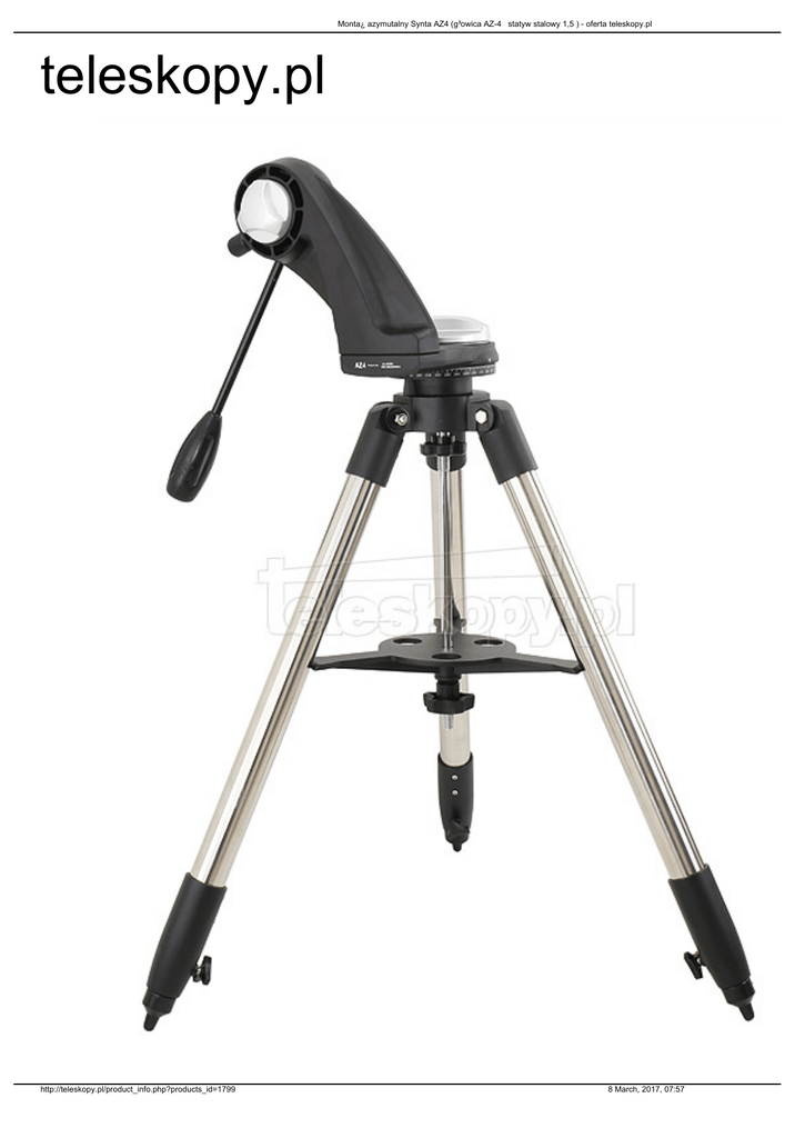 Monta¿ azymutalny Synta AZ4 (g³owica AZ-4 statyw stalowy 1,5 ) - oferta teleskopy.pl teleskopy.pl http://teleskopy.pl/product_info.php?products_id=1799 8 March, 2017, 07:57 Monta¿ azymutalny Synta AZ4 (g³owica AZ-4 statyw stalowy 1,5 ) - oferta teleskopy.pl Monta¿ azymutalny pozwalaj±cy na pewne zamocowanie instrumentów optycznych poprzez dovetail w systemie Vixena. Jest porêczny, stosunkowo kompaktowy i wystarczaj±co stabilny dla wiêkszo¶ci ma³ych i ¶rednich tub optycznych o d³ugo¶ci do 70 cm i wadze do 6 kg. Parametry techniczne • statyw: z rur stalowych 1,5" (38 mm) • g³owica: AZ-4 • wysoko¶æ minimalna: 63 cm bez g³owicy (sam statyw), 87 z g³owic± • wysoko¶æ maksymalna: 108 cm bez g³owicy (sam statyw), 132 z g³owic± • rozstaw nóg (odleg³o¶æ miêdzy nó¿kami, min / max przy wysoko¶ci min / max): 63 / 101 cm • waga monta¿u (bez g³owicy / z g³owic±): 3,8 kg / 6,7 kg Gwarancja 2 lata Przyk³adowe zastosowanie: tuba Sky-Watcher Mak 127 OTA na monta¿u AZ-4 http://teleskopy.pl/product_info.php?products_id=1799 8 March, 2017, 07:57 Monta¿ azymutalny Synta AZ4 (g³owica AZ-4 statyw stalowy 1,5 ) - oferta teleskopy.pl http://teleskopy.pl/product_info.php?products_id=1799 8 March, 2017, 07:57