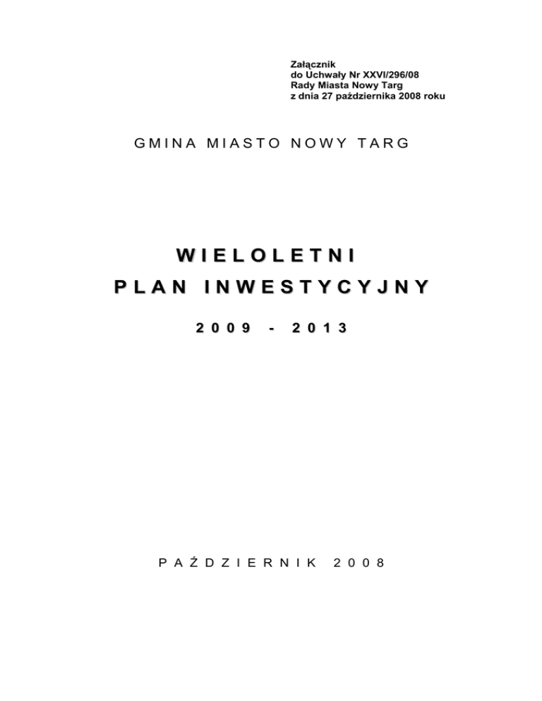 Załącznik do Uchwały Nr XXVI/296/08 Rady Miasta Nowy Targ z dnia 27 października 2008 roku GMINA MIASTO NOWY TARG WIELOLETNI PLAN INWESTYCYJNY 2 0 0 9 - 2 0 1 3 P A Ź D Z I E R N I K 2 0 0 8 TYTUŁ OPRACOWANIA: WIELOLETNI PLAN INWESTYCYJNY 2009 - 2013 SPIS ZAWARTOŚCI: 1. CZĘŚĆ OPISOWA: 1.1. Wprowadzenie. 1.2. Opis ogólny. 1.3. Opisy działów WPI i zadań na rok 2009. 1.4. Objaśnienia. 2. WIELOLETNI PLAN INWESTYCYJNY – zestawienie tabelaryczne. 1. CZĘŚĆ OPISOWA. 1.1. Wprowadzenie. Niniejsze opracowanie jest kontynuacją wprowadzonej w 2003 roku, uchwałą Rady Miasta Nowy Targ nr 85/XI/2003 z dnia 20 października procedury planowania pod nazwą Wieloletni Plan Inwestycyjny. Przyjęty do realizacji tą uchwałą „Wieloletni Plan Inwestycyjny – edycja 2004” uporządkował proces inwestycyjny. Kolejne edycje wprowadzały wymagane procedurą odpowiednie korekty w zakresie rzeczowo-finansowym jak również w układzie formalnym czyniąc Plan bardziej przejrzystym. Bieżące opracowanie Planu jest aktualizacją Wieloletniego Planu Inwestycyjnego edycja 2008, podjętego uchwałą Rady Miasta Nr XI/106/07 z dnia 13 sierpnia 2007 r. Wprowadzone korekty i modyfikacje to: zmiany wynikające z rozliczenia roku 2008, okresem planowania są lata 2009-2013, z pominięciem „lat następnych”, uwzględnienie w Planie zobowiązań podjętych odrębnymi uchwałami w okresie jego funkcjonowania, zaktualizowanie nakladów finansowych na zadania inwestycyjne, dostosowanie do bieżących możliwości finansowania z udziałem zewnętrznych środków budżetowych. Cechą charakterystyczną Wieloletniego Planu Inwestycyjnego 2009-2013 jest planowanie znacznych nakładów inwestycyjnych uwzględniających dotacje z funduszy europejskich a także wspomaganie kredytami i pożyczkami. Taki Plan daje podstawy do kontynuacji w ubieganiu się o dotacje z funduszy i będzie stanowił załączenie do wniosków o dotacje na wyodrębnione z niego programy. 1.2. Opis ogólny. Wieloletni Plan Inwestycyjny 2009-2013 obejmuje zakres nakładów inwestycyjnych na lata jak pokazano to w oznaczeniu Planu. Układ tabelaryczny WPI 2009-2013 oparty jest na jego poprzednim wydaniu z ograniczeniem kolumny „lata następne”, w miejsce której wprowadzono „uwagi” i obejmuje tytuł zadania, krótki opis, wartości nakładów, harmonogram realizacji. Taki układ znacząco poprawia czytelność planu. Skorygowano nazwę Działu A i obecne nazwy działów brzmią: − − − − − A. Modernizacja gospodarki wodnej i ściekowej, B. Budowa o modernizacja dróg wraz z infrastrukturą, C. Budynki, budowle i inne, D. Placówki oświatowo-wychowawcze E. Inne. Zakres rzeczowy zadań jest rozbudowany. Zawiera również programy, na które można ubiegać się o dotacje z funduszy europejskich. Daje to podstawy do kontynuacji i podejmowania dalszych starań o ich pozyskiwanie w okresie programowania 2007 – 2013. W zestawieniu końcowym uwidocznione są nakłady ogółem, prognozowane środki własne Gminy oraz zakładane dofinansowanie ze środków pozabudżetowych w rozbiciu na przewidywane dofinansowanie w formie dotacji i wymagane w takim układzie dofinansowanie w formie pożyczek i kredytów. Uwidoczniony limit kredytowy w okresie pięcioletnim traktuje się jako optymalny, którego przekroczenie wywołuje niekorzystne zjawiska w kolejnych latach procesu inwestycyjnego. Z zestawienia tego wynika, iż realizacja zakresu rzeczowego Planu w znacznym stopniu uzależniona jest od wysokości pozyskanych środków zewnętrznych w formie dotacji. Należy na bieżąco analizować możliwości pozyskiwania dotacji i proponować ograniczenia zakresu i przesunięcia terminowe realizacji zadań. 1.3. Opisy działów WPI i zadań na 2009 rok. A. MODERNIZACJA GOSPODARKI WODNEJ I ŚCIEKOWEJ Dział obejmuje zadania w zakresie: 1) dostarczanie wody – rozbudowa i dobudowy sieci wodociągowych, doszczelnianie sieci, modernizacja ujęć wody, 2) odprowadzanie ścieków – budowa sieci kanalizacji sanitarnych w północnych osiedlach miasta i na terenach objętych miejscowymi planami zagospodarowania przestrzennego, dobudowy sieci, doszczelnianie sieci, 3) oczyszczanie ścieków – rozbudowa i modernizacja oczyszczalni ścieków w szczególności w zakresie węzła osadowego (oczyszczanie wstępne), instalacji do osuszania i utylizacji termicznej osadów. Do realizacji w 2009 roku przewiduje się w pierwszej kolejności zadania związane z rozbudową i modernizacją oczyszczalni ścieków w zakresie modernizacji instalacji do osuszania i utylizacji termicznej osadów, przejęcie sieci wodociągowych i kanalizacyjnych od inwestora osiedla Polana Szaflarska oraz dobudowy i modernizacje sieci w zwiazku z przebudową dróg. B. BUDOWA I MODERNIZACJA DRÓG WRAZ Z INFRASTRUKTURĄ. W dziale zawarte są zadania związane z robotami w drogach z uwzględnieniem infrastruktury drogowej (odwodnienie, oświetlenie). Zadania przewidziane do realizacji w 2009 roku to: 1. Przebudowa ulicy Kowaniec – udział Gminy w przebudowie drogi powiatowej na odcinku około 700 mb, który stanowi zakończenie inwestycji prowadzonej od 2006 roku. 2. Budowa kładki dla pieszych na Białym Dunajcu – kontynuacja i zakończenie robót budowlano-montażowych dla kładki wraz z dojściami. 3. Budowa mostu w rejonie skrzyżowania ul. Kokoszków z ul. Kowaniec wraz z drogą do ul. Waksmundzkiej – prace projektowe i rozpoczęcie robót budowlanomontażowych. 4. Przebudowa ul. Grel od Partyzantów do torów, budowa w dz. 624 – roboty budowlano-montażowe dla pierwszego odcinka drogi. 5. Przebudowa ul. Orkana i Bolesława Wstydliwego – rozpoczęcie robót w ul. Orkana. 6. Przebudowa ul. Kościelnej i pl. Słowackiego do ul. Szkolnej w zakresie nawierzchni jezdni i chodników z realizacją miejsc postojowych. 7. Modernizacja nawierzchni dróg rolniczych – zakres typowany będzie w zależności od uzyskanych funduszy. 8. Dobudowy oświetlenia ulic, placów, 