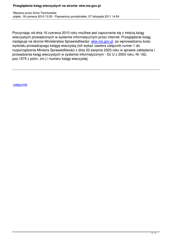 Przeglądanie ksiąg wieczystych na stronie: ekw.ms.gov.pl Wpisany przez Anna Tworkowska piątek, 18 czerwca 2010 13:35 - Poprawiony poniedziałek, 07 listopada 2011 14:54 Poczynając od dnia 16 czerwca 2010 roku możliwe jest zapoznanie się z treścią ksiąg wieczystych prowadzonych w systemie informatycznym przez internet. Przeglądanie ksiąg następuje na stronie Ministerstwa Sprawiedliwości ekw.ms.gov.pl po wprowadzeniu kodu wydziału prowadzącego księgę wieczystą (ich wykaz zawiera załącznik numer 1 do rozporządzenia Ministra Sprawiedliwości z dnia 20 sierpnia 2003 roku w sprawie zakładania i prowadzenia ksiąg wieczystych w systemie informatycznym - Dz U z 2003 roku, Nr 162, poz.1575 z późn. zm.) i numeru księgi wieczystej. załącznik 1/1