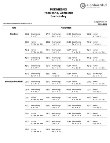 PODNIEŚNO Podnieśno, Gemeinde Suchożebry ausgedruckt am 08/03/2017 Gesamtpolnische Fahrpläne auf e-podroznik.pl Ort Siedlce Abfahrten 06:52 08:37 10:42 13:17 15:17 17:42 Sokołów Podlaski 06:13 08:18 09:57 12:13 13:52 15:37 17:52 Beschleunigt F m h* 07:17 Beschleunigt normal N 15e -św 13m 09:02 Beschleunigt normal N 15e -św 13m 11:47 Beschleunigt Beschleunigt F m h* // 13:47 Beschleunigt Beschleunigt F m h* // 15:47 Beschleunigt Beschleunigt Św e* m -6 18:07 normal Beschleunigt h -6 N1 // 06:43 Beschleunigt Św e* m -6 F w 2m 5+ Beschleunigt F m h* // 08:43 Beschleunigt 09:03 Beschleunigt normal N 15e -św 13m 10:53 Beschleunigt Beschleunigt F m -2m 12:52 Beschleunigt normal N 15e -św 13m 14:23 Beschleunigt normal N 15e -św 13m 16:23 Beschleunigt normal N 15e -św m 18:38 Beschleunigt Św e* m -6 F m h* // F m h* // Św e* m -6 Św e* m -6 F w 2m 5+ Św e* m -6 F m h* // F m h* // F m h* // F m h* // Św e* m -6 07:32 Beschleunigt F m h* // 09:42 Beschleunigt Św e* m -6 12:17 normal F w 2m 5+ 14:12 normal F w 2m 5+ 16:17 normal F w 2m 5+ 18:37 normal N -24 c 07:17 normal F m h* 11:12 normal F w 2m 5+ 12:53 Beschleunigt Św m 6 7 14:48 Beschleunigt Św e* m -6 16:48 Beschleunigt Św e* m -6 08:02 normal w F 2m 5+ 10:12 normal F w 2m 5+ 12:47 normal N 15e -św 13m 14:42 normal N 15e -św 13m 16:42 normal N 15e -św 13m 19:27 Beschleunigt Św e* m -6 07:52 normal N 15e -św 13m 09:27 normal F w 2m 5+ 11:42 normal N 15e -św 13m 13:27 normal F w 2m 5+ 15:12 normal F w 2m 5+ 17:17 normal F w 2m 5+ Bezeichnungen -24 nie kursuje 24 XII -2m nie kursują 27 maja -6 nie kursuje 6 stycznia -św nie kursuje 1 i 11 listopada oraz 1stycznia // nie kursuje w dniach 23.12, 27-30.12 13m nie kursuje 1. i 3. maja 15e nie kursuje w Boże Ciało i 15 sierpnia 2m nie kursuje 2 maja 5+ nie kursuje w piątek po Bożym Ciele 6 kursuje w soboty 7 kursuje w niedziele F kursuje od poniedziałku do piątku w dni robocze N nie kursuje 25 i 26 grudnia oraz w Święta Wielkanocne N1 nie kursuje 25 i 26 grudzień oraz w Święta Wielkanocne c nie kursuje 1 i 6 stycznia oraz w Boże Ciało e* nie kursuje w Boże Ciało h nie kursuje w okresie wakacji i ferii szkolnych h* nie kursuje w okresie ferii letnich m nie kursuje w Wigilię w nie kursuje od 1.07 do 31.08 Św nie kursuje w dniu 1 stycznia, w pierwszy i drugi dzień Wielkanocy oraz 25 i 26 XII