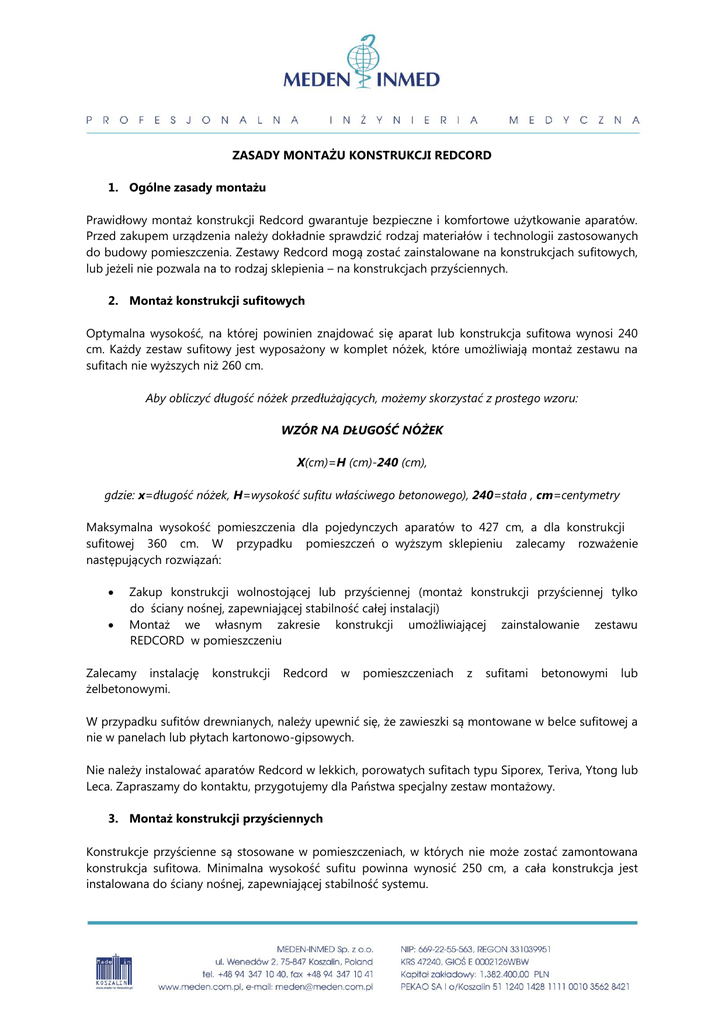 ZASADY MONTAŻU KONSTRUKCJI REDCORD 1. Ogólne zasady montażu Prawidłowy montaż konstrukcji Redcord gwarantuje bezpieczne i komfortowe użytkowanie aparatów. Przed zakupem urządzenia należy dokładnie sprawdzić rodzaj materiałów i technologii zastosowanych do budowy pomieszczenia. Zestawy Redcord mogą zostać zainstalowane na konstrukcjach sufitowych, lub jeżeli nie pozwala na to rodzaj sklepienia – na konstrukcjach przyściennych. 2. Montaż konstrukcji sufitowych Optymalna wysokość, na której powinien znajdować się aparat lub konstrukcja sufitowa wynosi 240 cm. Każdy zestaw sufitowy jest wyposażony w komplet nóżek, które umożliwiają montaż zestawu na sufitach nie wyższych niż 260 cm. Aby obliczyć długość nóżek przedłużających, możemy skorzystać z prostego wzoru: WZÓR NA DŁUGOŚĆ NÓŻEK X(cm)=H (cm)-240 (cm), gdzie: x=długość nóżek, H=wysokość sufitu właściwego betonowego), 240=stała , cm=centymetry Maksymalna wysokość pomieszczenia dla pojedynczych aparatów to 427 cm, a dla konstrukcji sufitowej 360 cm. W przypadku pomieszczeń o wyższym sklepieniu zalecamy rozważenie następujących rozwiązań: Zakup konstrukcji wolnostojącej lub przyściennej (montaż konstrukcji przyściennej tylko do ściany nośnej, zapewniającej stabilność całej instalacji) Montaż we własnym zakresie konstrukcji umożliwiającej zainstalowanie zestawu REDCORD w pomieszczeniu Zalecamy instalację żelbetonowymi. konstrukcji Redcord w pomieszczeniach z sufitami betonowymi lub W przypadku sufitów drewnianych, należy upewnić się, że zawieszki są montowane w belce sufitowej a nie w panelach lub płytach kartonowo-gipsowych. Nie należy instalować aparatów Redcord w lekkich, porowatych sufitach typu Siporex, Teriva, Ytong lub Leca. Zapraszamy do kontaktu, przygotujemy dla Państwa specjalny zestaw montażowy. 3. Montaż konstrukcji przyściennych Konstrukcje przyścienne są stosowane w pomieszczeniach, w których nie może zostać zamontowana konstrukcja sufitowa. Minimalna wysokość sufitu powinna wynosić 250 cm, a cała konstrukcja jest instalowana do ściany nośnej, zapewniającej stabilność systemu.