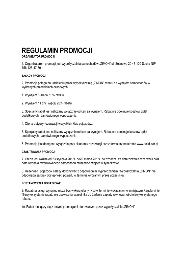 REGULAMIN PROMOCJI ORGANIZATOR PROMOCJI 1. Organizatorem promocji jest wypożyczalnia samochodów „ZIMON” ul. Sosnowa 20 47-100 Sucha NIP 756-125-47-30 ZASADY PROMOCJI 2. Promocja polega na udzieleniu przez wypożyczalnię „ZIMON” rabatu na wynajem samochodów w wybranych przedziałach czasowych: 1. Wynajem 5-10 dni 10% rabatu 2. Wynajem 11 dni i więcej 20% rabatu 3. Specjalny rabat jest naliczany wyłącznie od cen za wynajem. Rabat nie obejmuje kosztów opłat dodatkowych i zamówionego wyposażenia. 4. Oferta dotyczy rezerwacji wszystkich klas pojazdów.. 5. Specjalny rabat jest naliczany wyłącznie od cen za wynajem. Rabat nie obejmuje kosztów opłat dodatkowych i zamówionego wyposażenia. 6. Promocja jest dostępna wyłącznie przy składaniu rezerwacji przez formularz na stronie www.solid-car.pl CZAS TRWANIA PROMOCJI 7. Oferta jest ważna od 23 stycznia 2015r. do20 marca 2015r. co oznacza, że data złożenia rezerwacji oraz data wydania rezerwowanego samochodu musi mieć miejsce w tym okresie. 8. Rezerwacji pojazdów należy dokonywać z odpowiednim wyprzedzeniem. Wypożyczalnia „ZIMON” nie odpowiada za brak dostępności pojazdu w terminie wybranym przez uczestnika. POSTANOWIENIA DODATKOWE 9. Rabat na usługi wynajmu może być wykorzystany tylko w terminie wskazanym w niniejszym Regulaminie. Niewykorzystanie rabatu nie upoważnia uczestnika do żądania zapłaty równowartości niewykorzystanego rabatu. 10. Rabat nie łączy się z innymi promocjami oferowanymi przez wypożyczalnię „ZIMON”