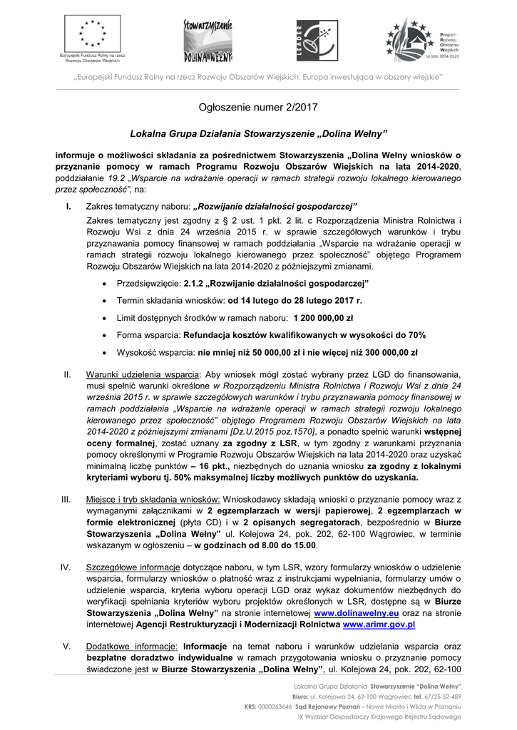 „Europejski Fundusz Rolny na rzecz Rozwoju Obszarów Wiejskich: Europa inwestująca w obszary wiejskie” _______________________________________________________________________________________________________ Ogłoszenie numer 2/2017 Lokalna Grupa Działania Stowarzyszenie „Dolina Wełny” informuje o możliwości składania za pośrednictwem Stowarzyszenia „Dolina Wełny wniosków o przyznanie pomocy w ramach Programu Rozwoju Obszarów Wiejskich na lata 2014-2020, poddziałanie 19.2 „Wsparcie na wdrażanie operacji w ramach strategii rozwoju lokalnego kierowanego przez społeczność”, na: I. Zakres tematyczny naboru: „Rozwijanie działalności gospodarczej” Zakres tematyczny jest zgodny z § 2 ust. 1 pkt. 2 lit. c Rozporządzenia Ministra Rolnictwa i Rozwoju Wsi z dnia 24 września 2015 r. w sprawie szczegółowych warunków i trybu przyznawania pomocy finansowej w ramach poddziałania „Wsparcie na wdrażanie operacji w ramach strategii rozwoju lokalnego kierowanego przez społeczność” objętego Programem Rozwoju Obszarów Wiejskich na lata 2014-2020 z późniejszymi zmianami. Przedsięwzięcie: 2.1.2 „Rozwijanie działalności gospodarczej” Termin składania wniosków: od 14 lutego do 28 lutego 2017 r. Limit dostępnych środków w ramach naboru: 1 200 000,00 zł Forma wsparcia: Refundacja kosztów kwalifikowanych w wysokości do 70% Wysokość wsparcia: nie mniej niż 50 000,00 zł i nie więcej niż 300 000,00 zł II. Warunki udzielenia wsparcia: Aby wniosek mógł zostać wybrany przez LGD do finansowania, musi spełnić warunki określone w Rozporządzeniu Ministra Rolnictwa i Rozwoju Wsi z dnia 24 września 2015 r. w sprawie szczegółowych warunków i trybu przyznawania pomocy finansowej w ramach poddziałania „Wsparcie na wdrażanie operacji w ramach strategii rozwoju lokalnego kierowanego przez społeczność” objętego Programem Rozwoju Obszarów Wiejskich na lata 2014-2020 z późniejszymi zmianami [Dz.U.2015 poz.1570], a ponadto spełnić warunki wstępnej oceny formalnej, zostać uznany za zgodny z LSR, w tym zgodny z warunkami przyznania pomocy określonymi w Programie Rozwoju Obszarów Wiejskich na lata 2014-2020 oraz uzyskać minimalną liczbę punktów – 16 pkt., niezbędnych do uznania wniosku za zgodny z lokalnymi kryteriami wyboru tj. 50% maksymalnej liczby możliwych punktów do uzyskania. III. Miejsce i tryb składania wniosków: Wnioskodawcy składają wnioski o przyznanie pomocy wraz z wymaganymi załącznikami w 2 egzemplarzach w wersji papierowej, 2 egzemplarzach w formie elektronicznej (płyta CD) i w 2 opisanych segregatorach, bezpośrednio w Biurze Stowarzyszenia „Dolina Wełny” ul. Kolejowa 24, pok. 202, 62-100 Wągrowiec, w terminie wskazanym w ogłoszeniu – w godzinach od 8.00 do 15.00. IV. Szczegółowe informacje dotyczące naboru, w tym LSR, wzory formularzy wniosków o udzielenie wsparcia, formularzy wniosków o płatność wraz z instrukcjami wypełniania, formularzy umów o udzielenie wsparcia, kryteria wyboru operacji LGD oraz wykaz dokumentów niezbędnych do weryfikacji spełniania kryteriów wyboru projektów określonych w LSR, dostępne są w Biurze Stowarzyszenia „Dolina Wełny” na stronie internetowej www.dolinawelny.eu oraz na stronie internetowej Agencji Restrukturyzacji i Modernizacji Rolnictwa www.arimr.gov.pl V. Dodatkowe informacje: Informacje na temat naboru i warunków udzielania wsparcia oraz bezpłatne doradztwo indywidualne w ramach przygotowania wniosku o przyznanie pomocy świadczone jest w Biurze Stowarzyszenia „Dolina Wełny”, ul. Kolejowa 24, pok. 202, 62-100 Lokalna Grupa Działania Stowarzyszenie “Dolina Wełny” Biuro: ul. Kolejowa 24, 62-100 Wągrowiec tel. 67/25-52-489 KRS: 0000263646 Sąd Rejonowy Poznań – Nowe Miasto i Wilda w Poznaniu IX Wydział Gospodarczy Krajowego Rejestru Sądowego „Europejski Fundusz Rolny na rzecz Rozwoju Obszarów Wiejskich: Europa inwestująca w obszary wiejskie” _______________________________________________________________________________________________________ Wągrowiec. Pytania można kierować telefonicznie: 67/25-52-489. VI. na adres email: [email protected] lub Załączniki: 2.1. Kryteria wyboru operacji stosowane dla operacji wnioskodawców innych niż LGD z zakresu rozwijania działalności gospodarczej – załącznik 2.2. Wymagane dokumenty, potwierdzające spełnienie warunków udzielenia wsparcia – załącznik 2.3. Oświadczenie Wnioskodawcy - załącznik 2.4. Planowane do osiągnięcia w wyniku operacji cele ogólne, szczegółowe i przedsięwzięcia oraz zakładane do osiągnięcia wskaźniki - załącznik Materiał opracowany przez Lokalną Grupę Działania Stowarzyszenie „Dolina Wełny”, współfinansowany ze środków Unii Europejskiej w ramach działania 19. „Wsparcie dla rozwoju lokalnego w ramach inicjatywy LEADER” Lokalna Grupa Działania Stowarzyszenie “Dolina Wełny” Biuro: ul. Kolejowa 24, 62-100 Wągrowiec tel. 67/25-52-489 KRS: 0000263646 Sąd Rejonowy Poznań – Nowe Miasto i Wilda w Poznaniu IX Wydział Gospodarczy Krajowego Rejestru Sądowego